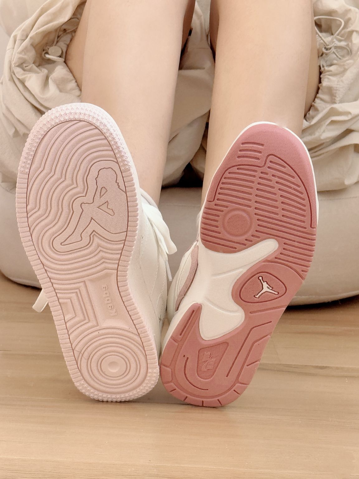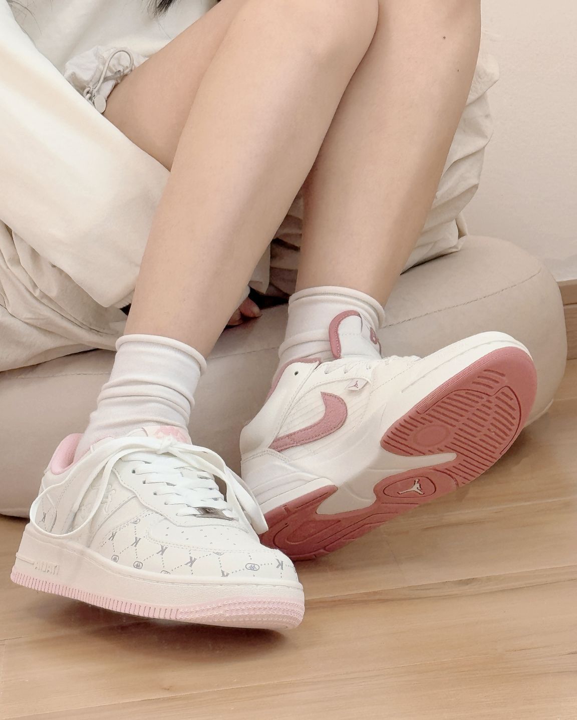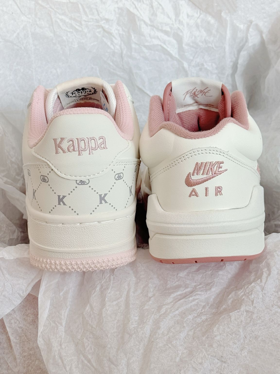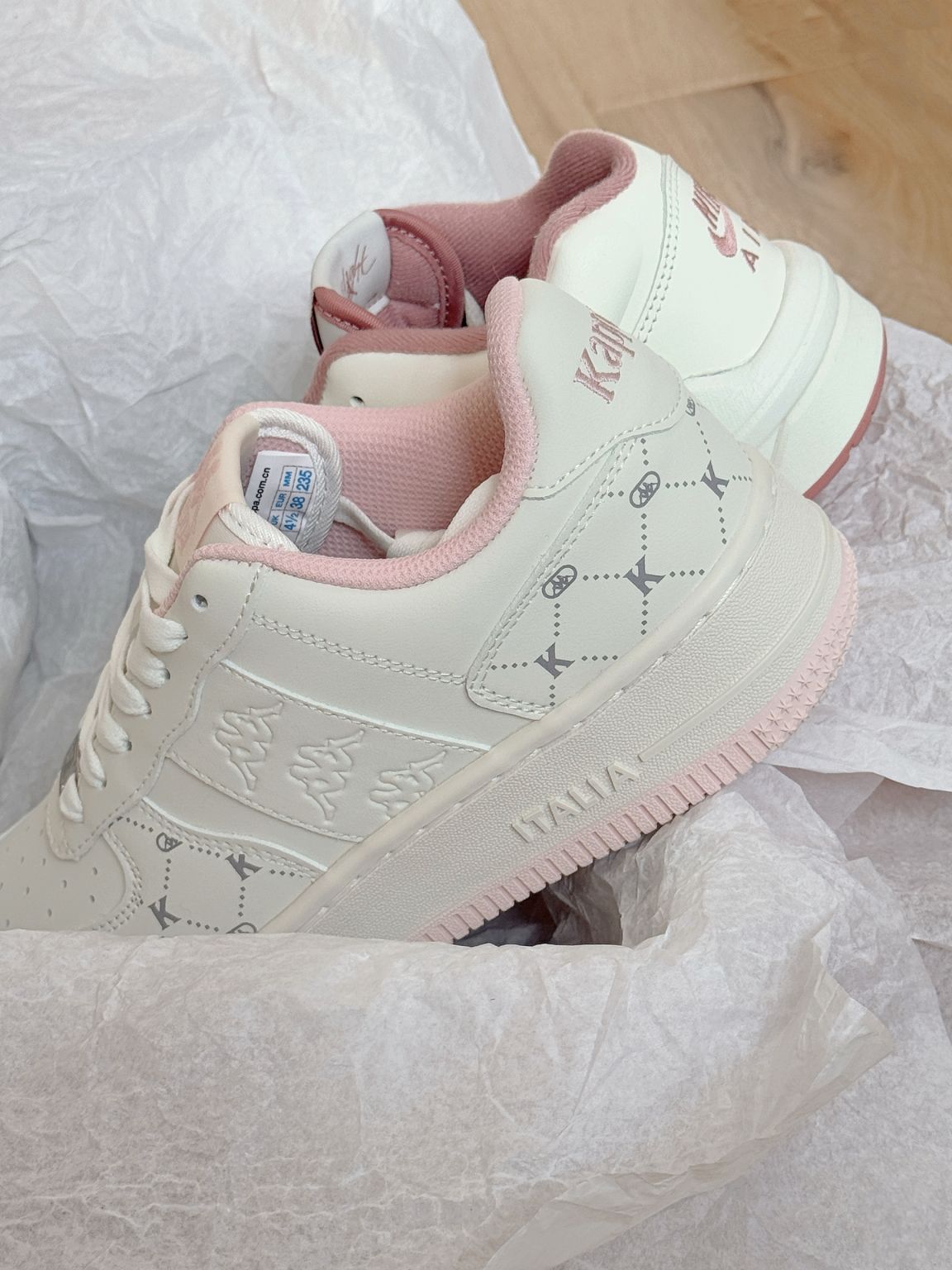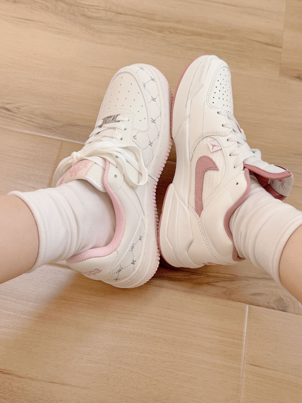 甜甜少女心的两双板鞋呀 *kappa清爽老花Jordan白粉配色 kappa上脚更显秀气 略增高但是Jordan配色也好看 拜年穿哪双呀!纠结啦