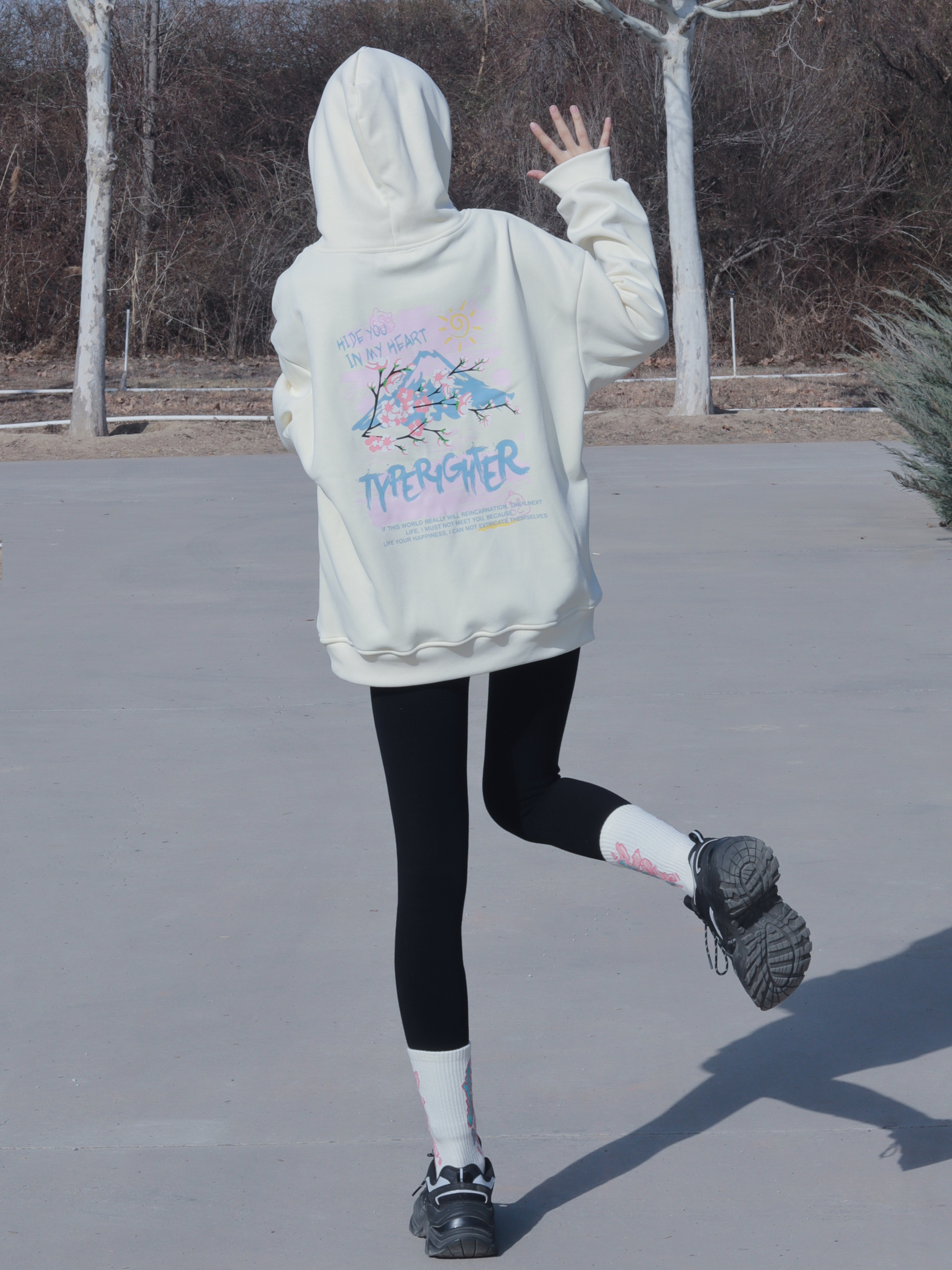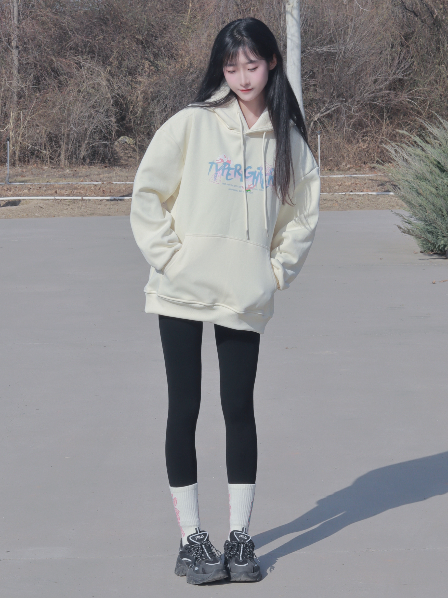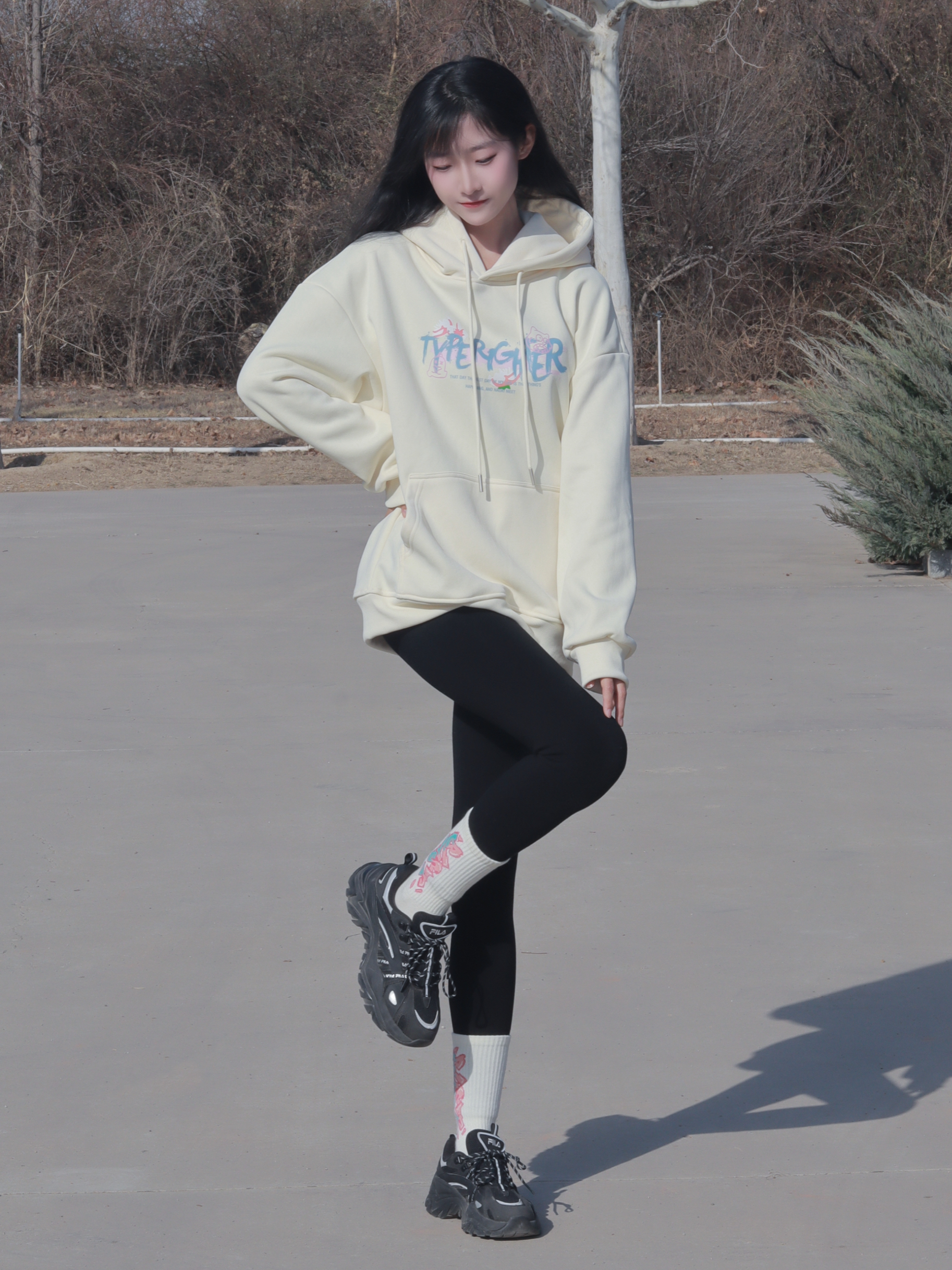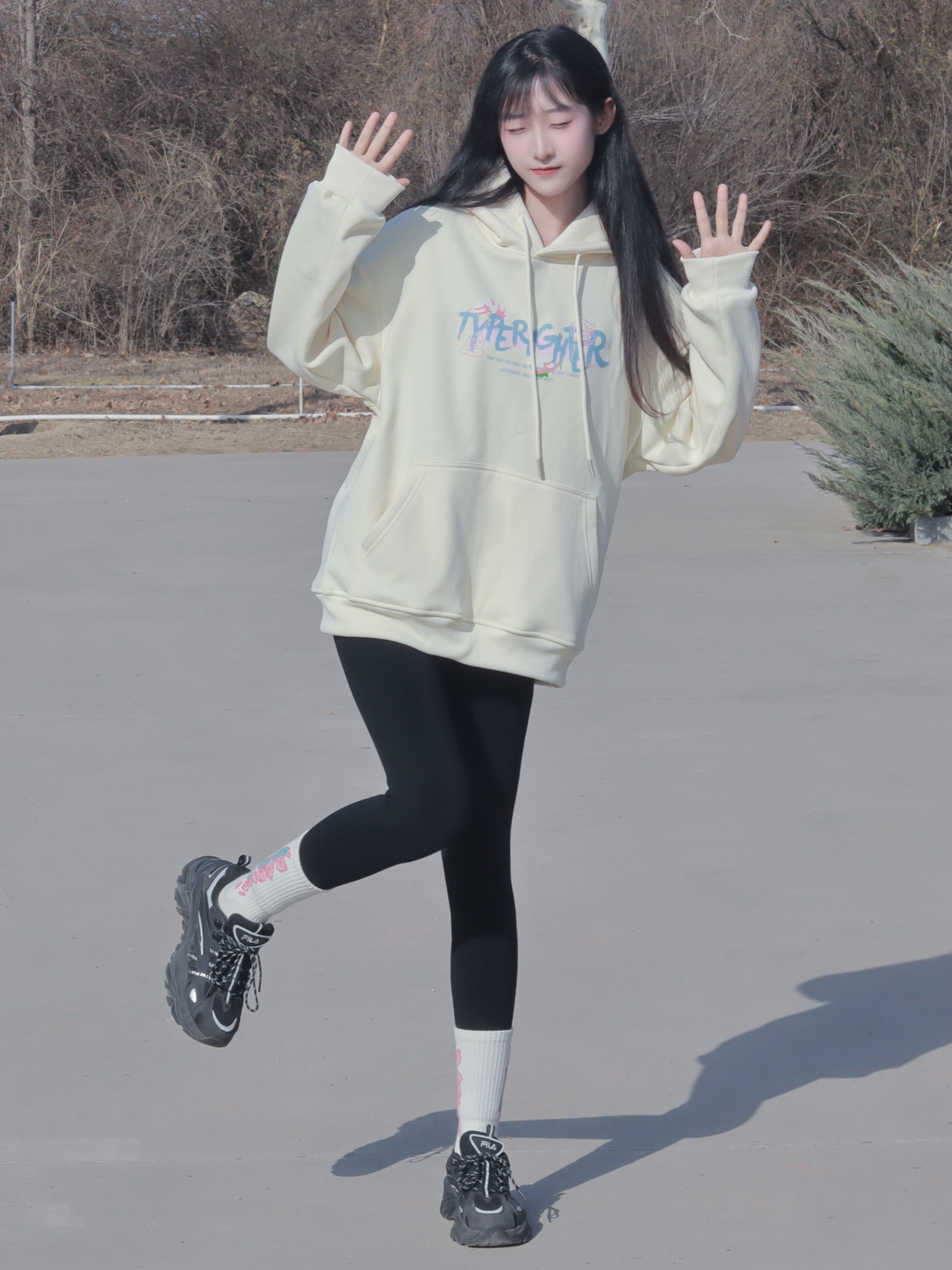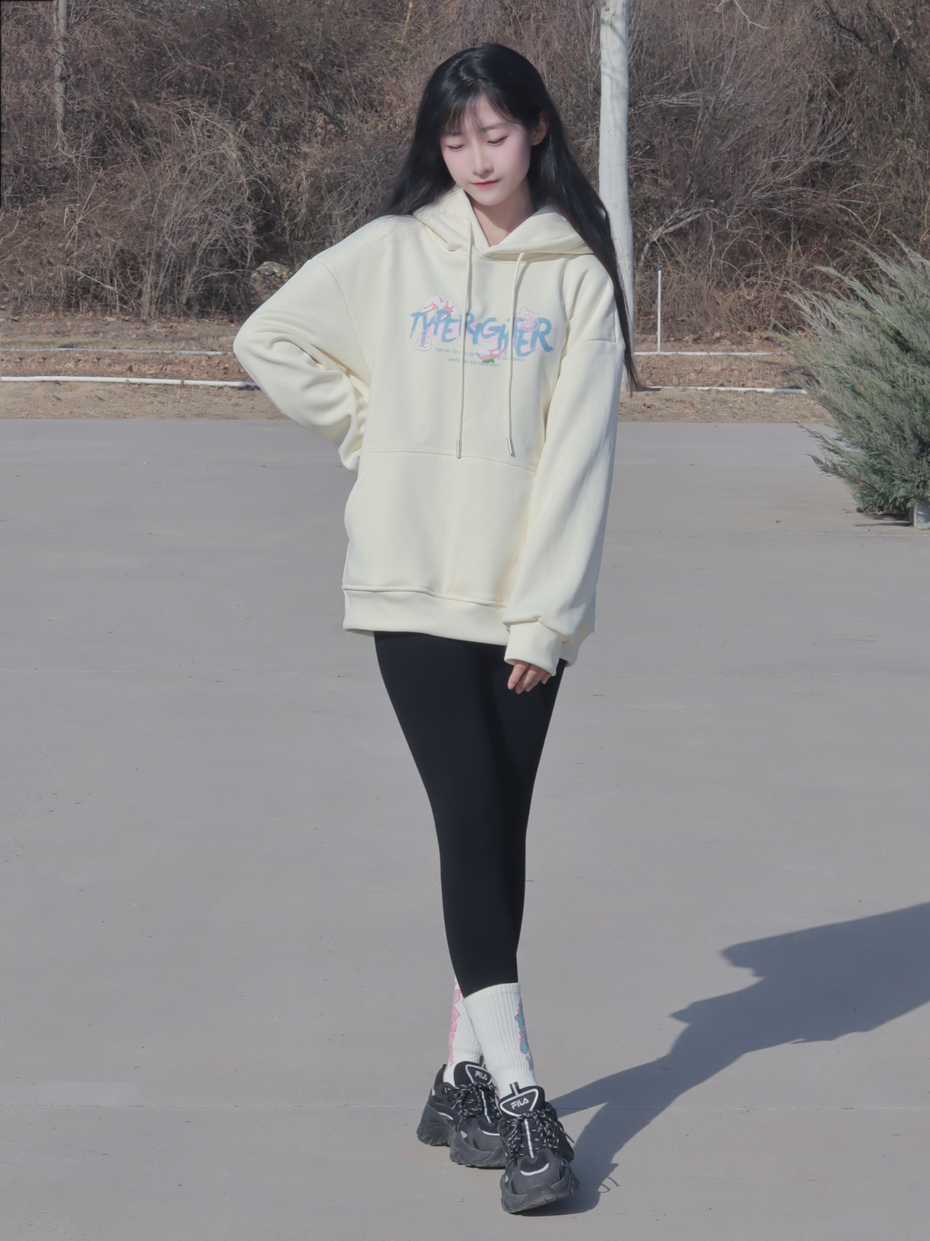 米色卫衣休闲百搭💯 搭配黑色鲨鱼裤和老爹鞋👟 简约大方又时尚~