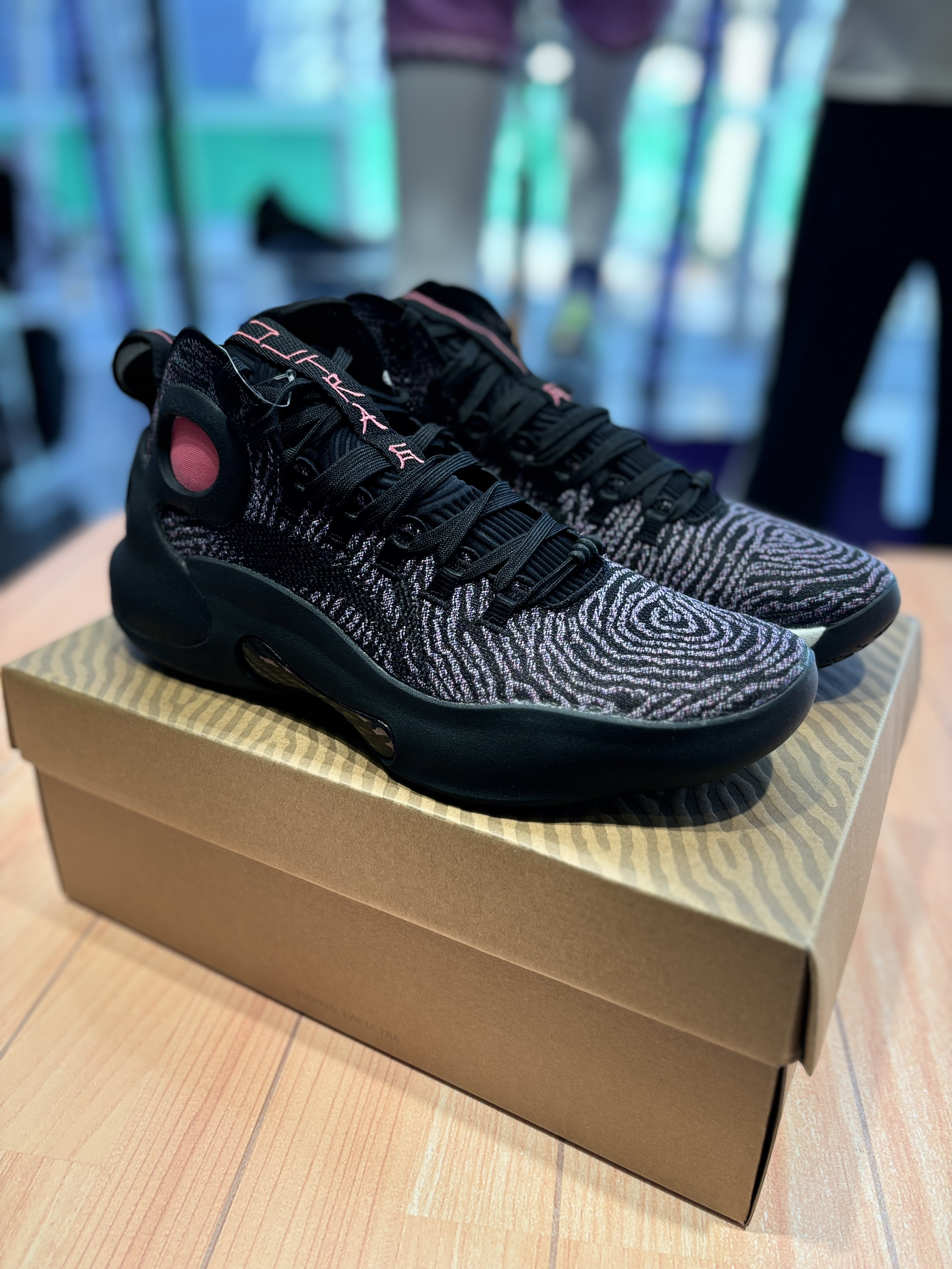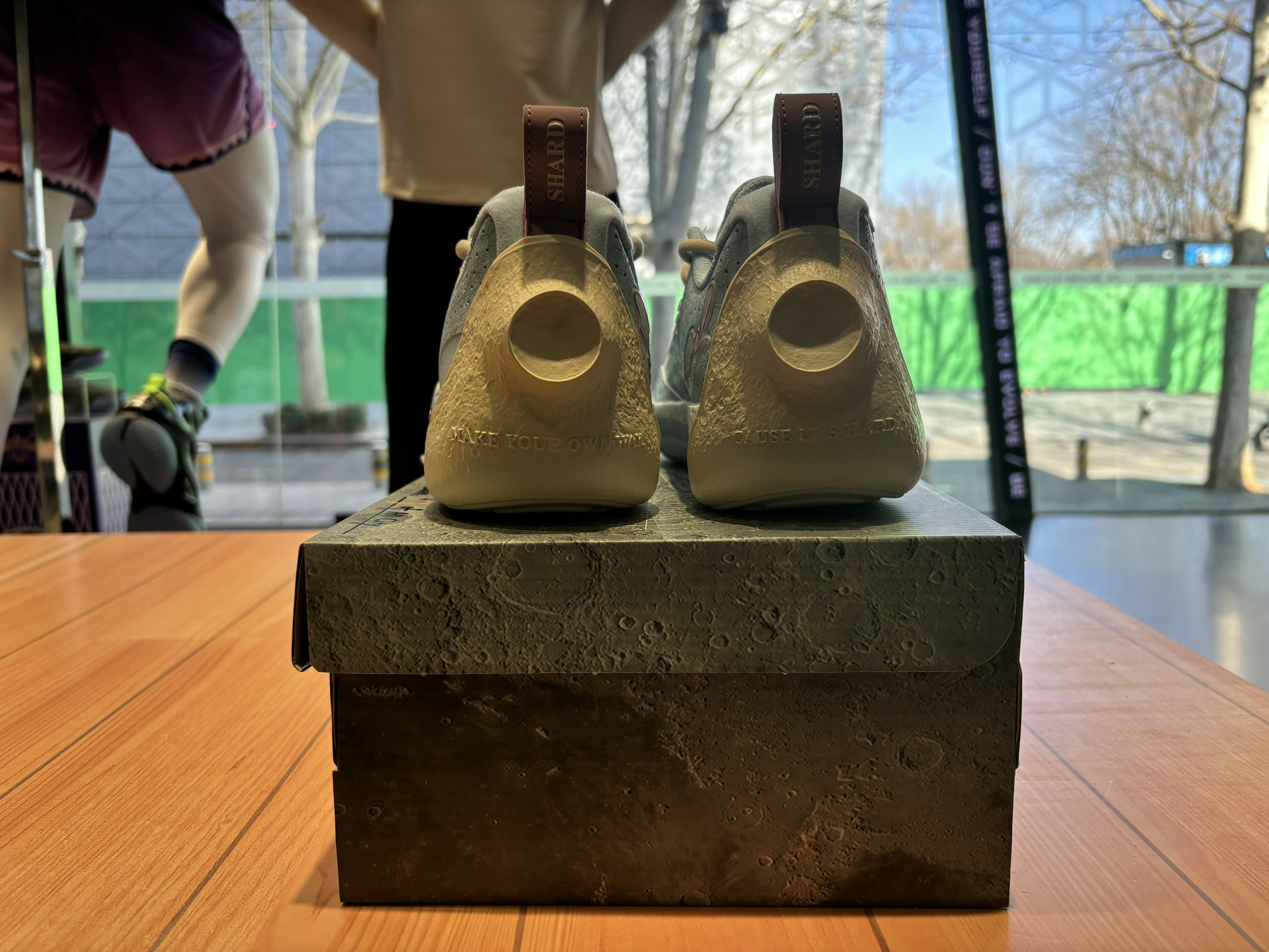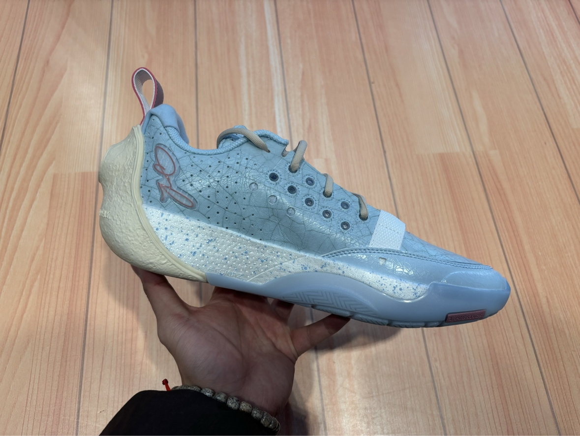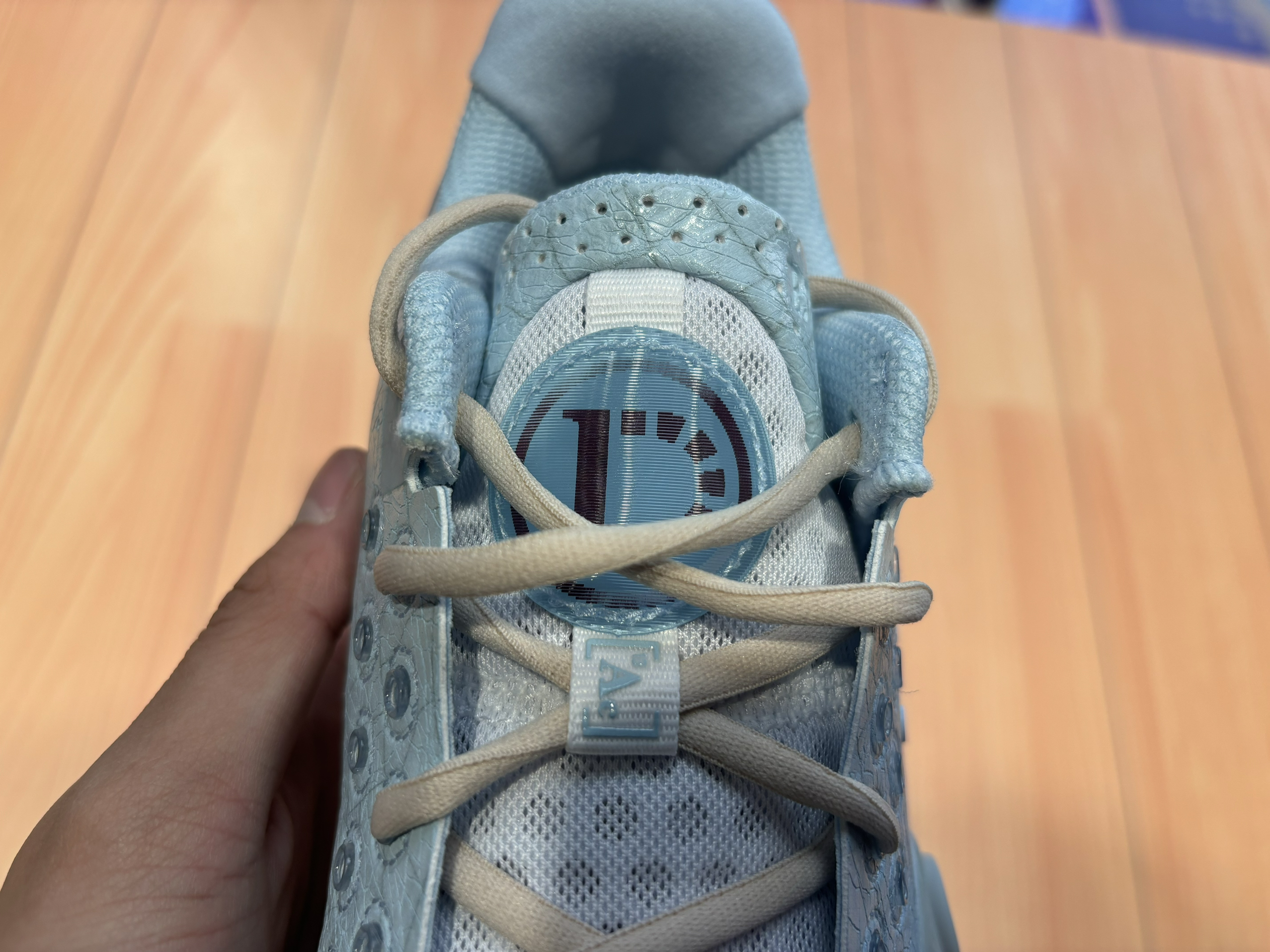 鞋面以湖蓝色为主色调,搭配米白色,整体看起来非常清新。其中,湖蓝色的部分特别加入了裂纹图案,仿佛冰面裂开的场景,与“碎冰”的主题完美契合,也有种玉石的质感。 球鞋内侧韦德的签名换成了拉塞尔的签名,鞋舌上拉塞尔个人LOGO和汉字“家”组成的闪卡图案、鞋头的汉字“十三”、后跟提环上的SHARD字样等细节设计。