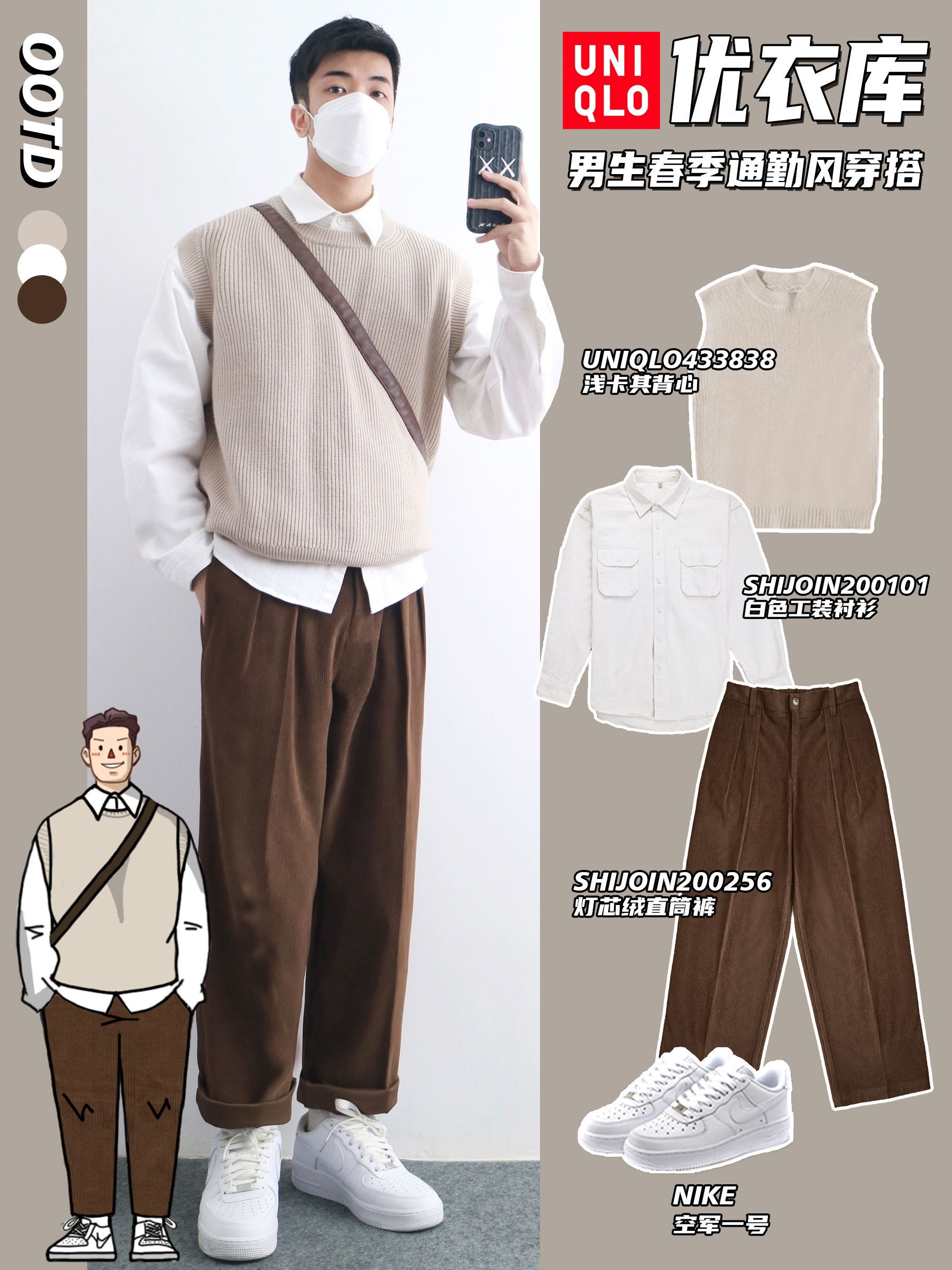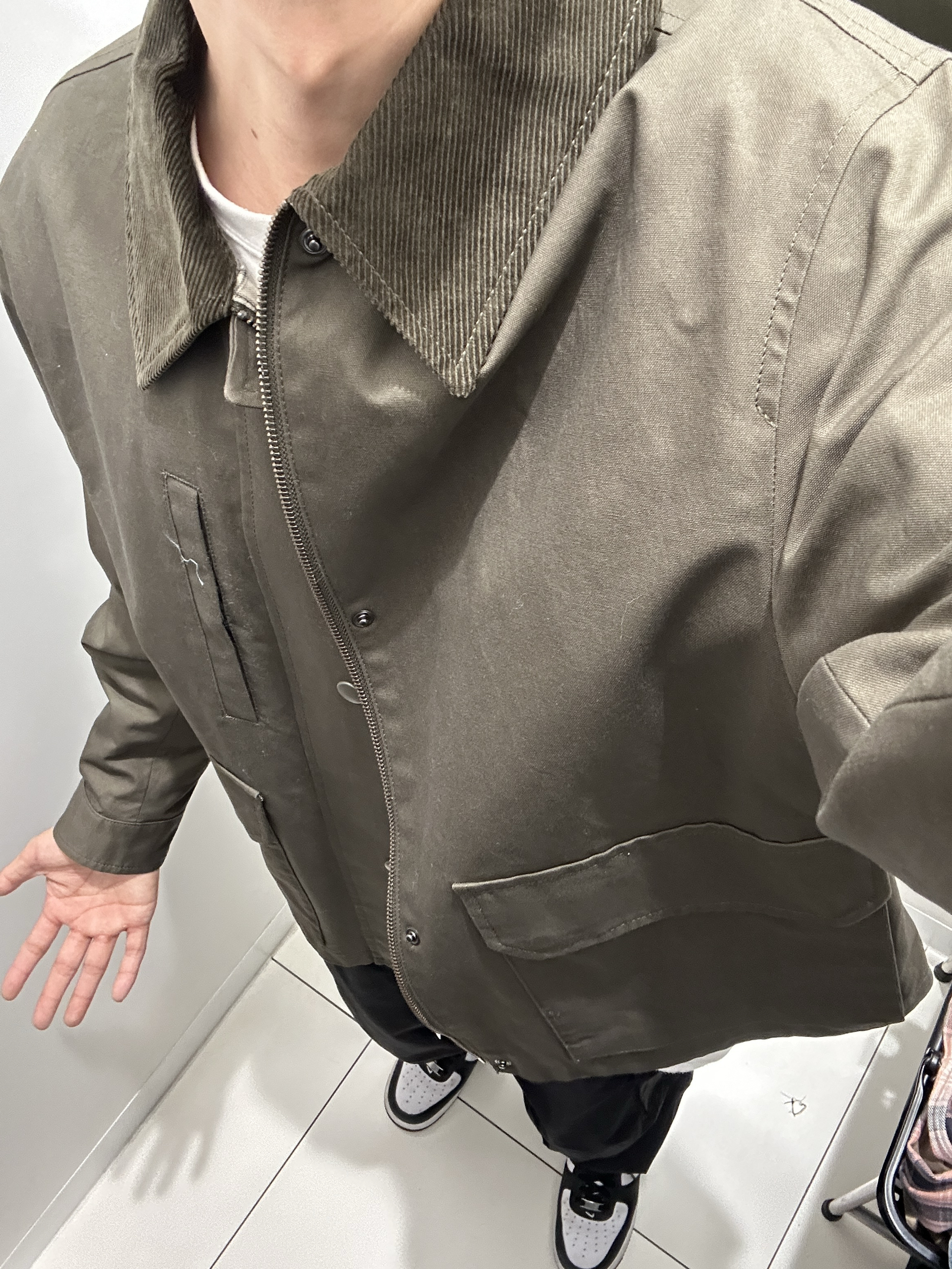 👕:颜色上,深橄榄色自带复古滤镜,在沉闷的冬日里显得低调又独特,而且这个颜色特别百搭,不挑肤色。 版型是短款茄克,能够巧妙地提高腰线,对于我们男生来说,瞬间拉长腿部比例,视觉上显高显瘦。肩部微微垫肩设计,让肩膀更宽阔,整个人的体态看起来更挺拔,告别“圆肩驼背”的工科男形象。 👕【白色长袖内搭】 白色长袖作为内搭,和深橄榄色夹克形成鲜明对比,简约又干净,还能在视觉上增加层次感。它的材质是纯棉的,亲肤...