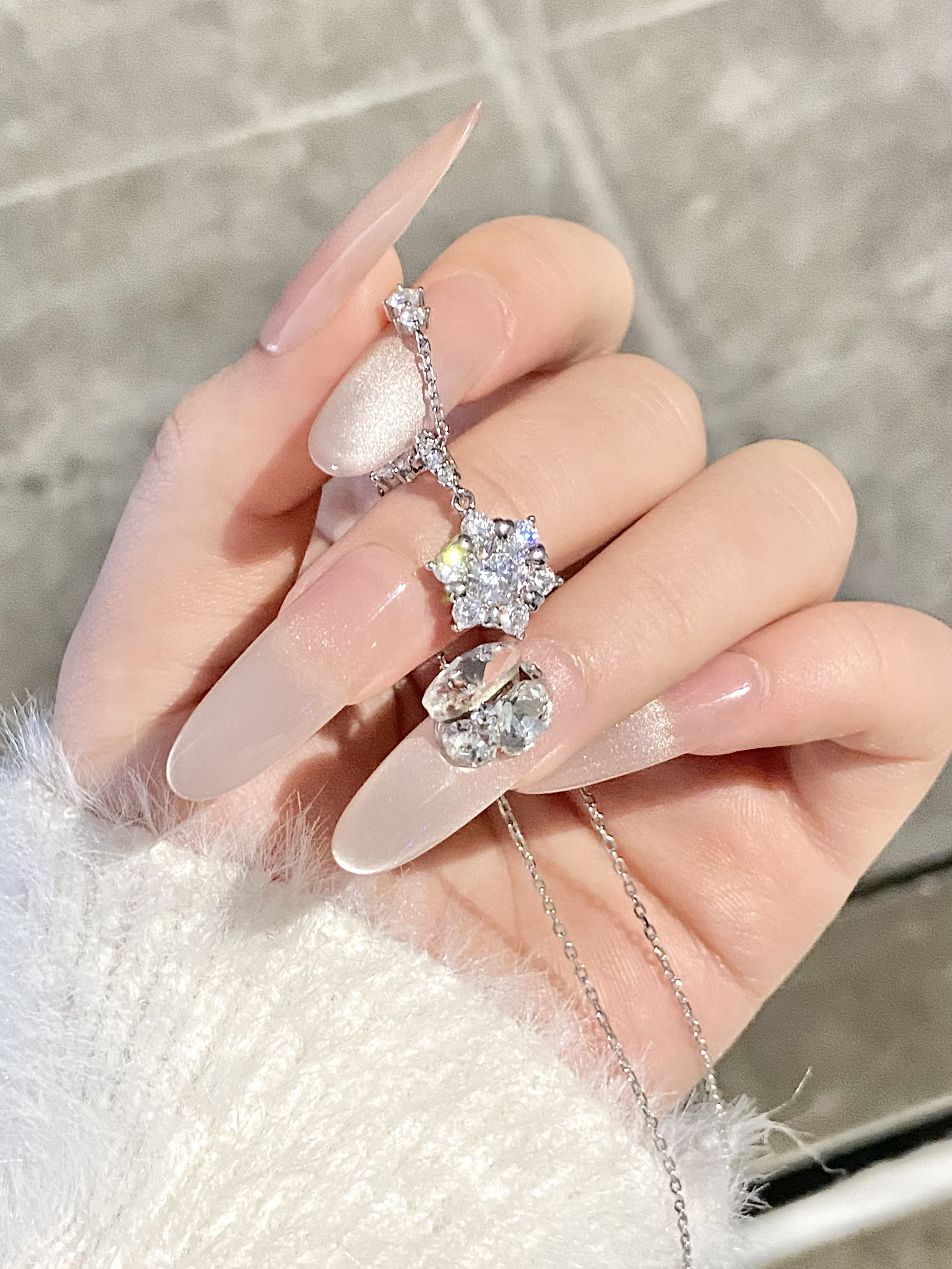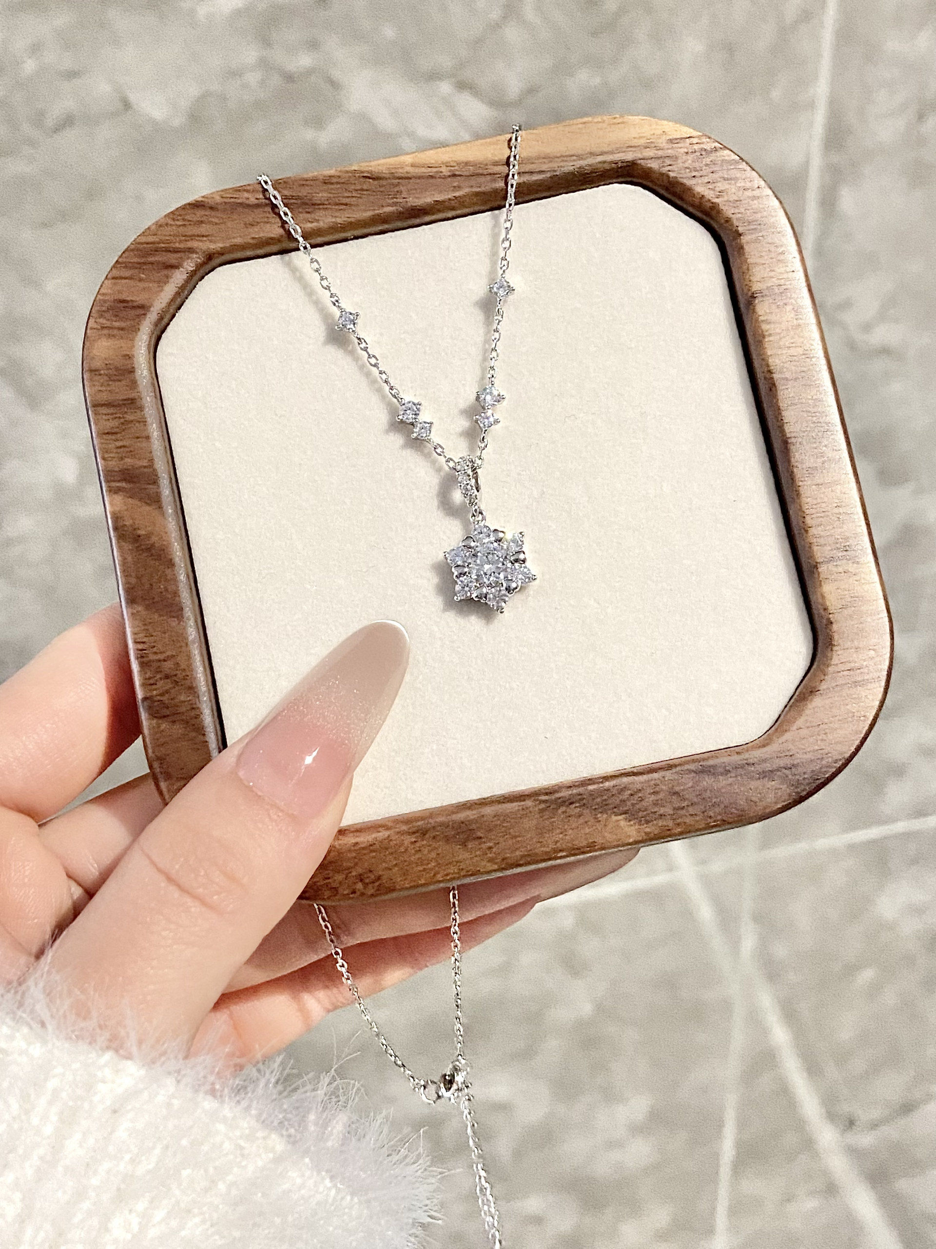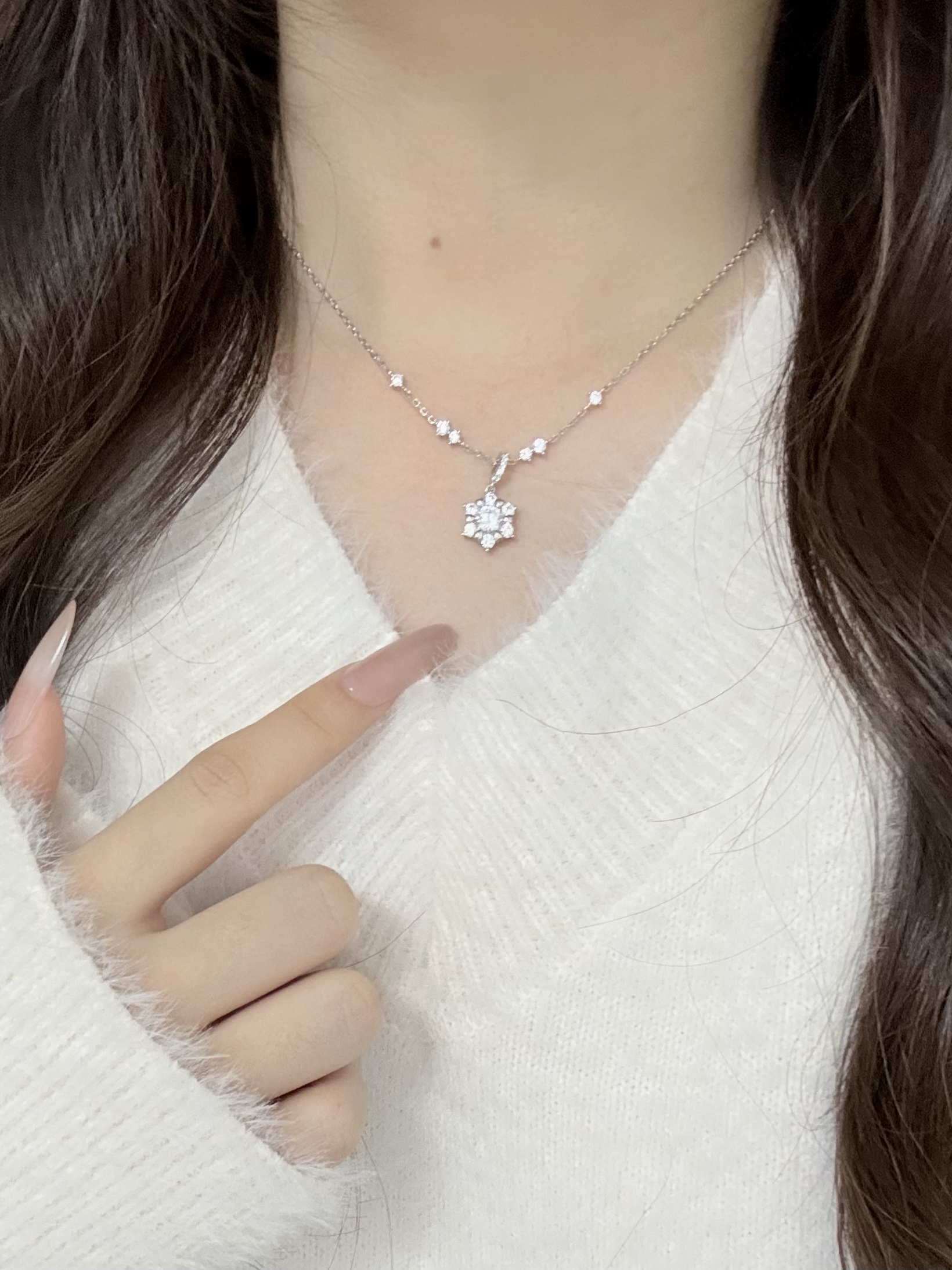 雪花由许多小钻拼成 光线下闪到聚不了焦✨ 自带一种千金感 戴在身上显得人温温柔柔的~