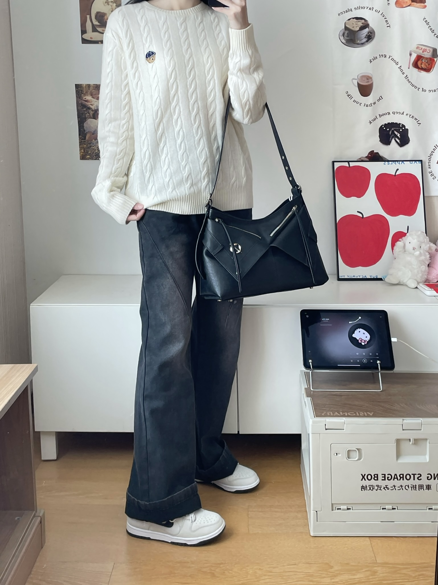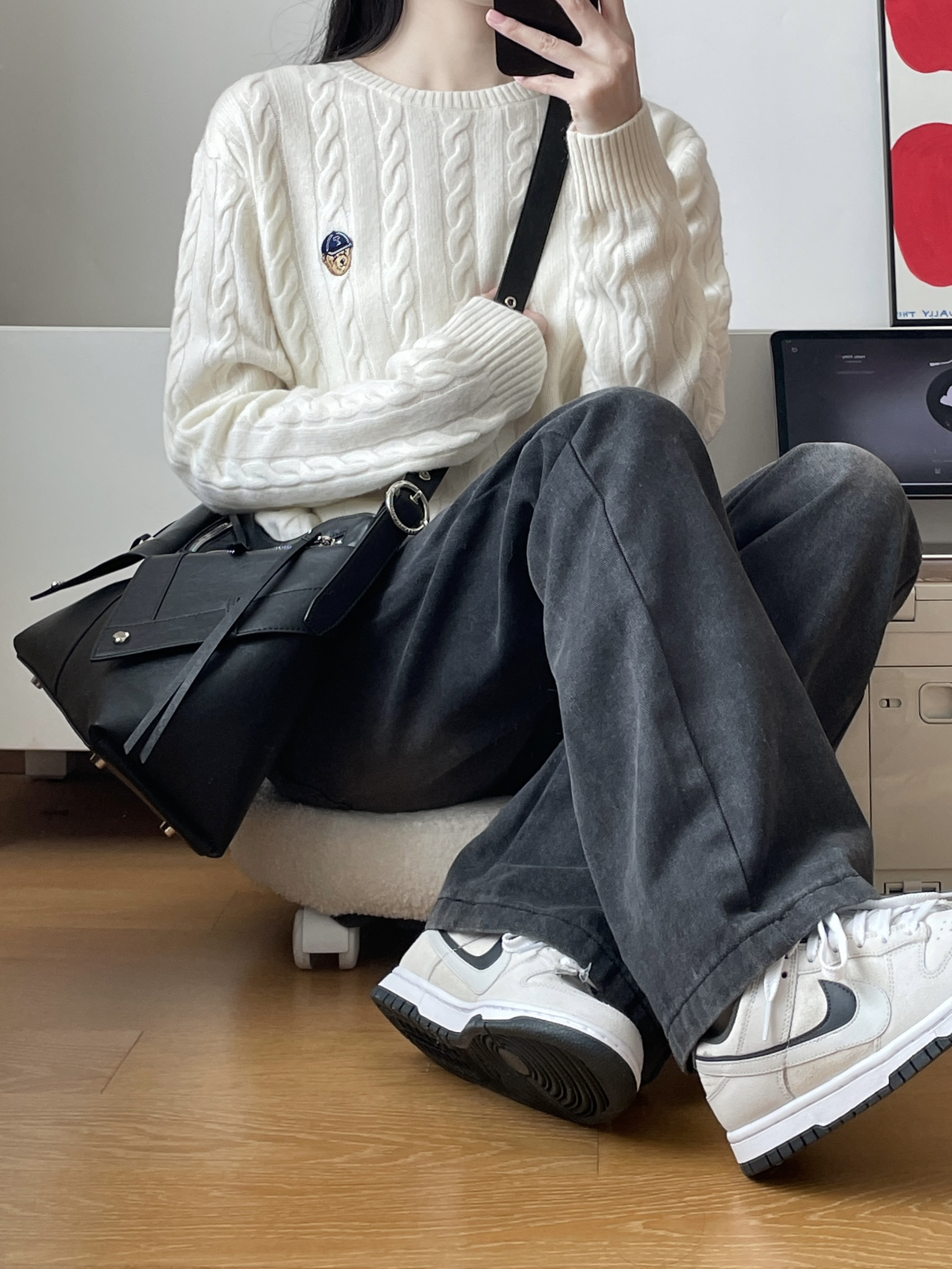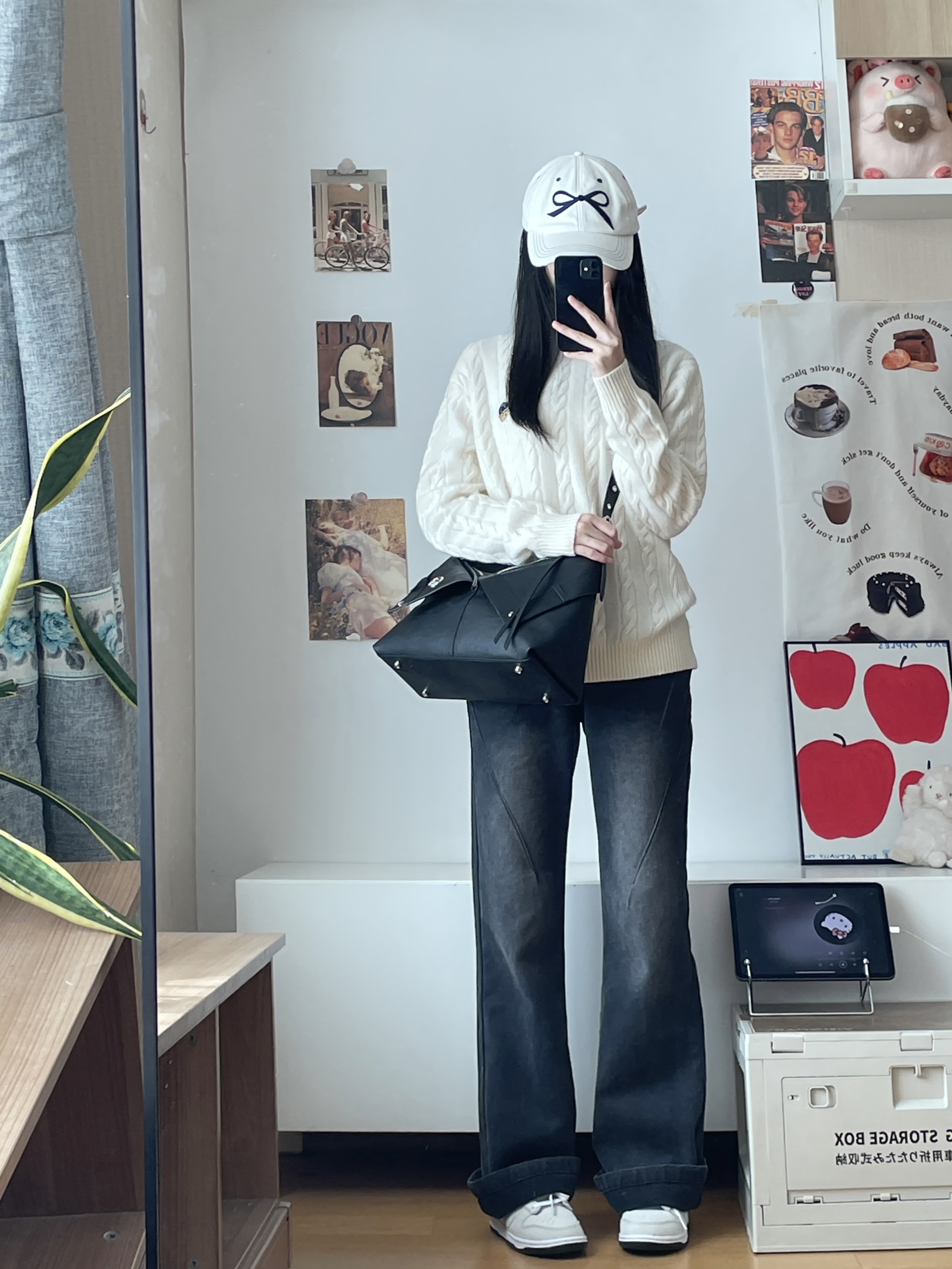 今天也是简约舒服的一身~ 米白毛衣➕黑色牛仔裤 慵懒舒服 背了一个黑色托特包 黑色和辣拉链搭配好有设计感 穿这身通勤出街都不错嘿~