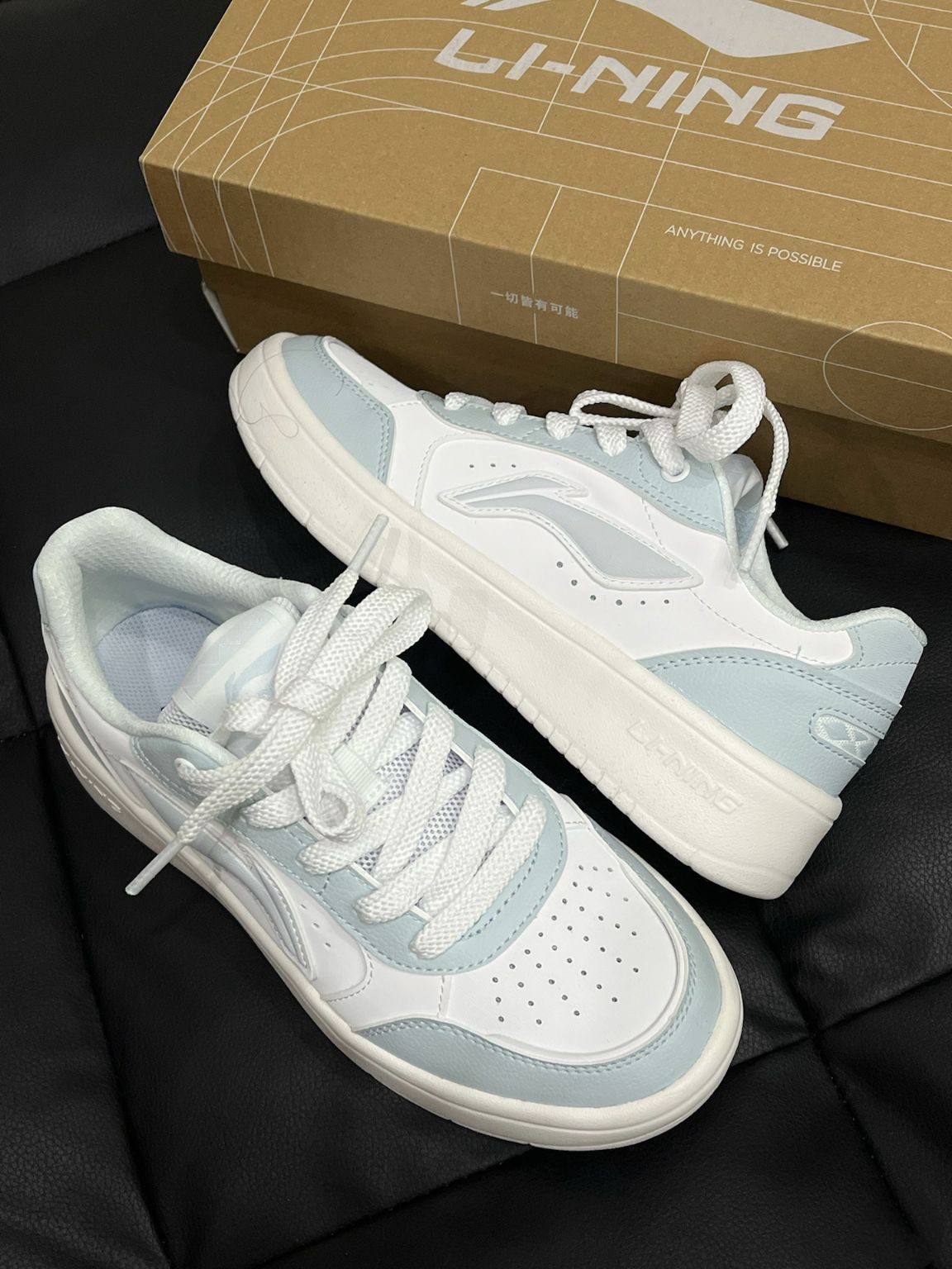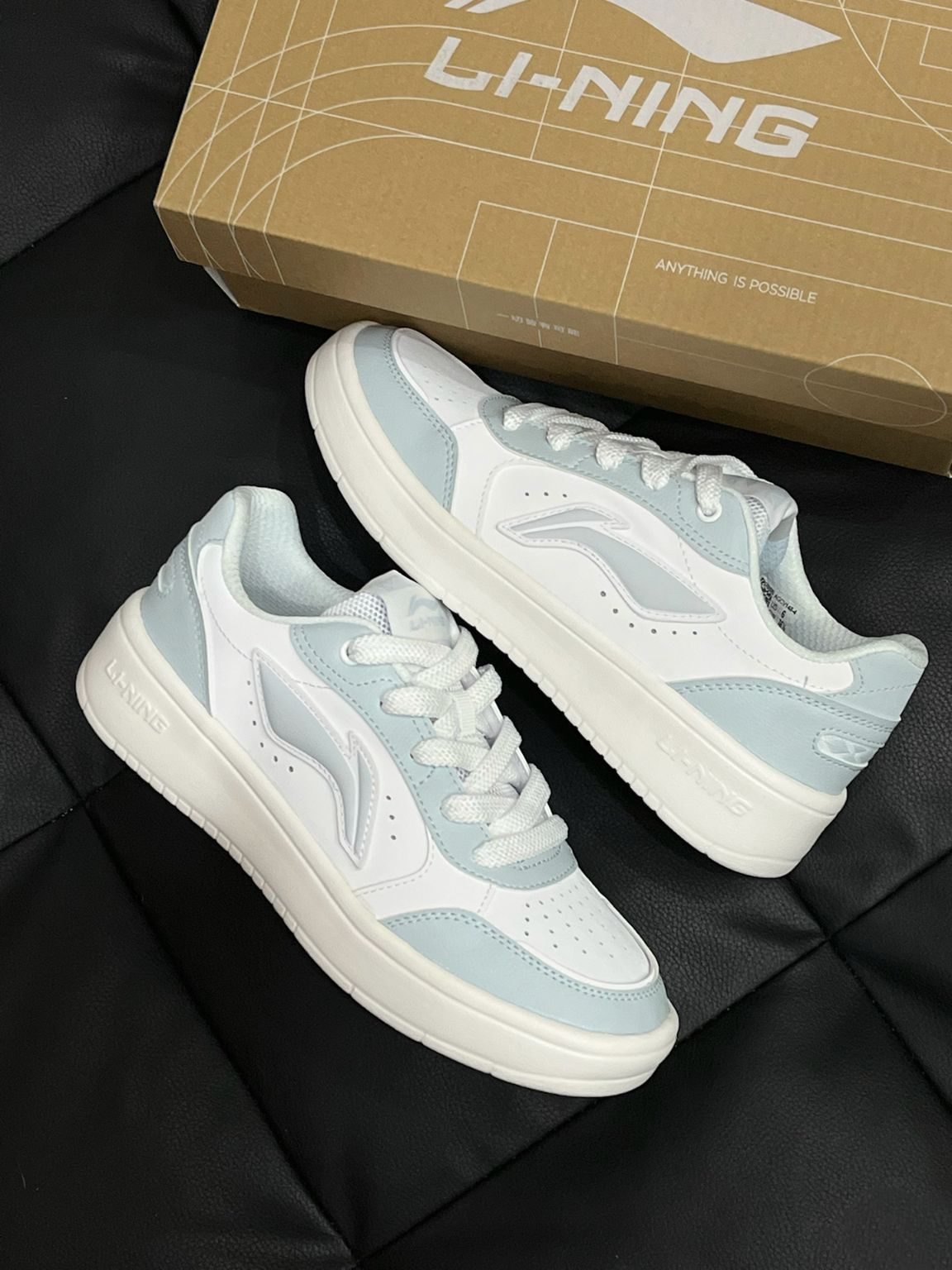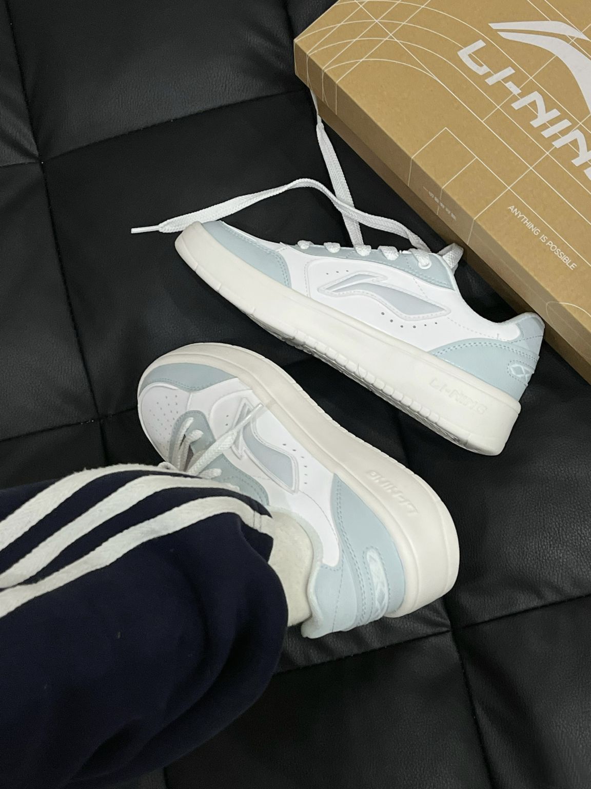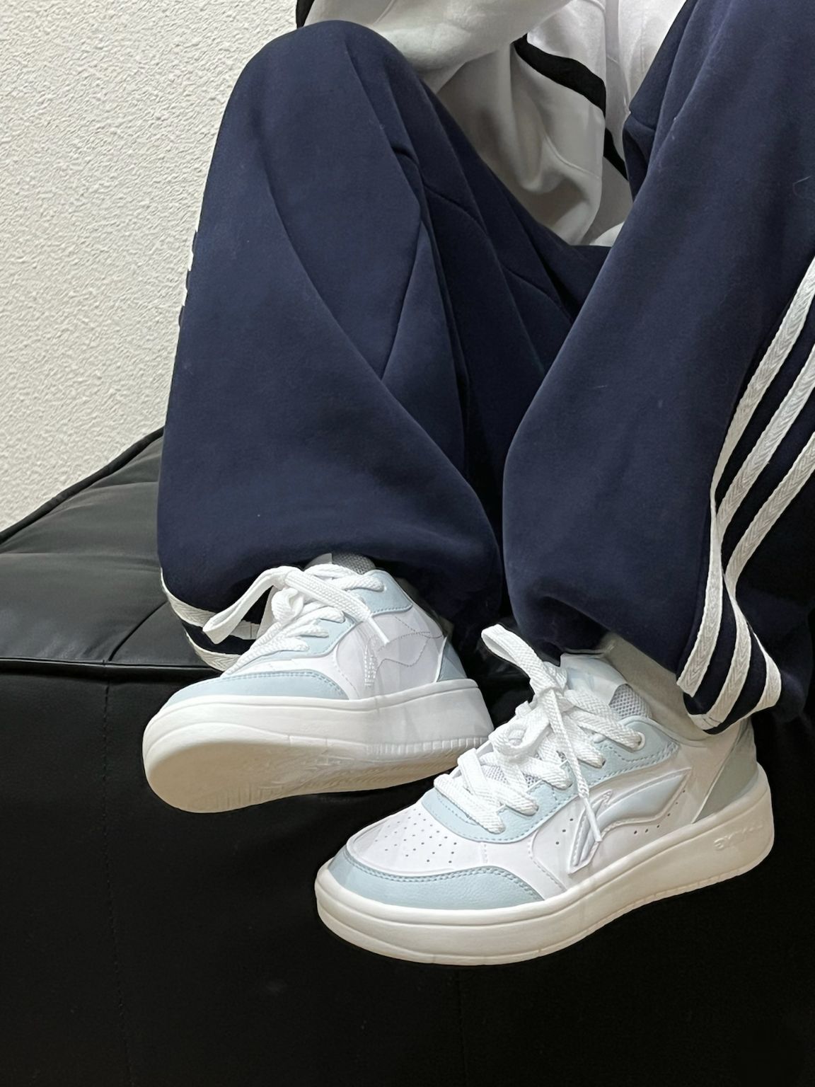 李宁元宝PURE白蓝板鞋好有少年感呐~ 白色拼接浅蓝色好干净温柔呀! 鞋型上脚吼吼看,轻巧好穿的呢 今天我搭配运动休闲裤也很校园清新感