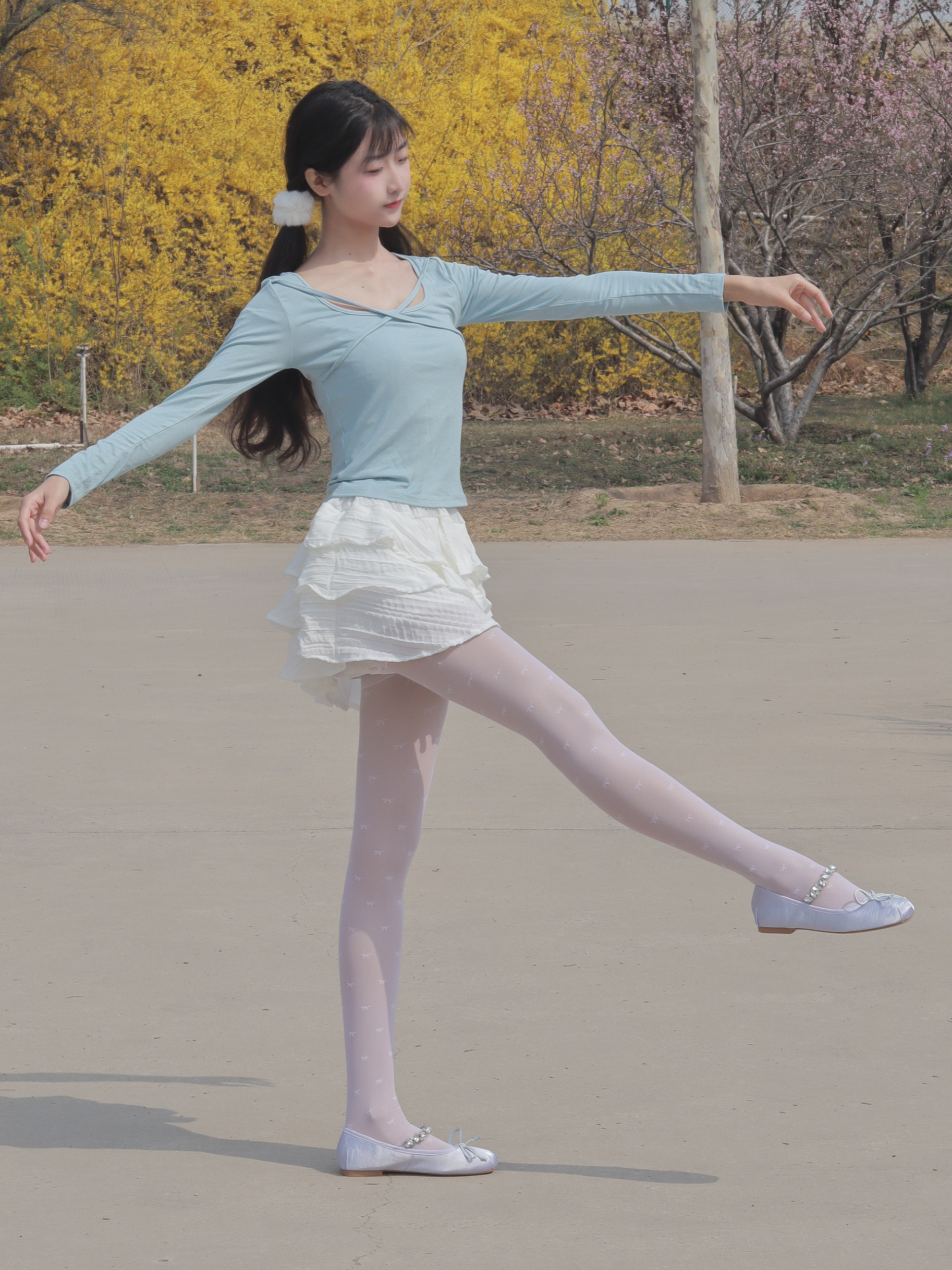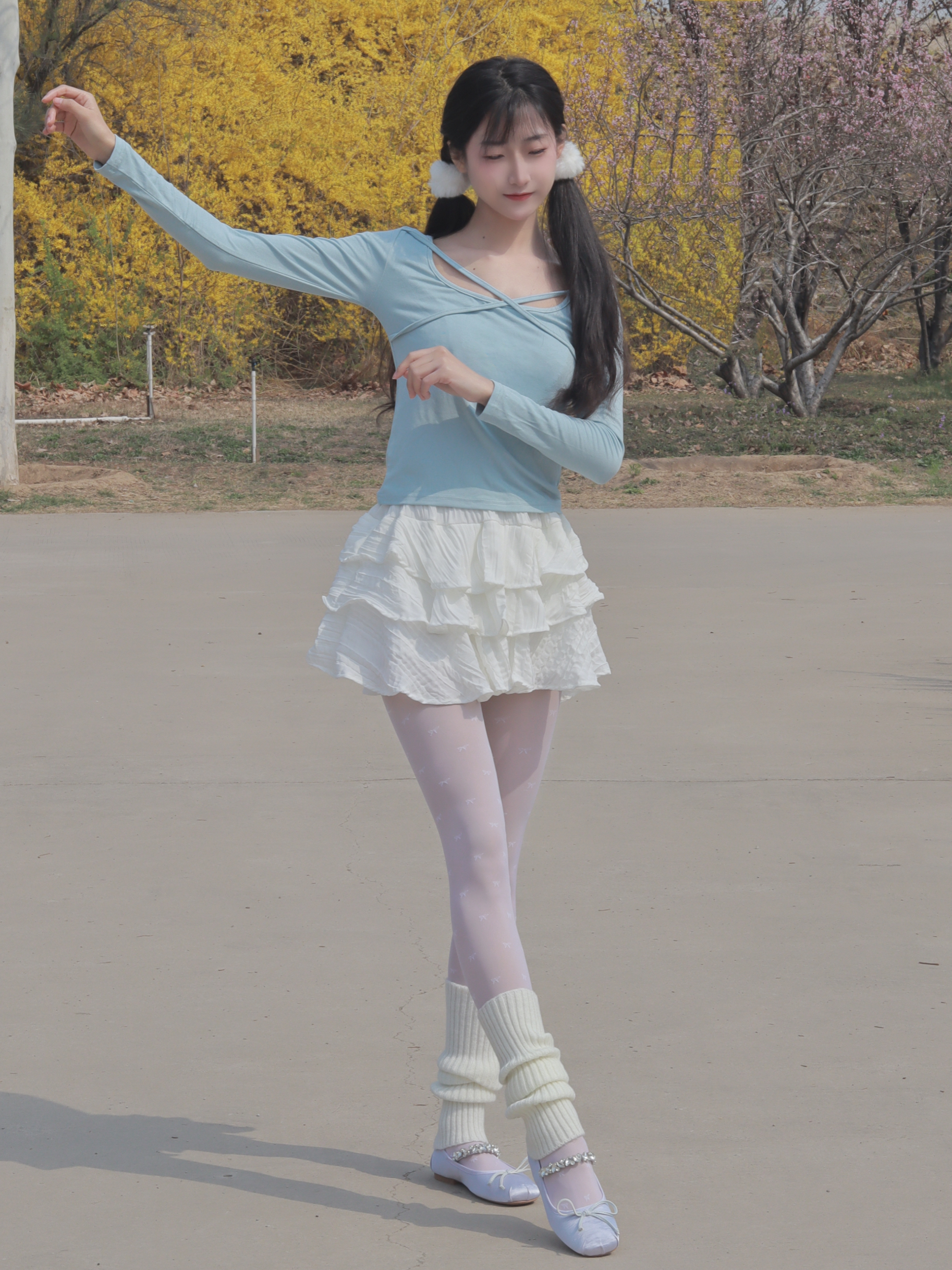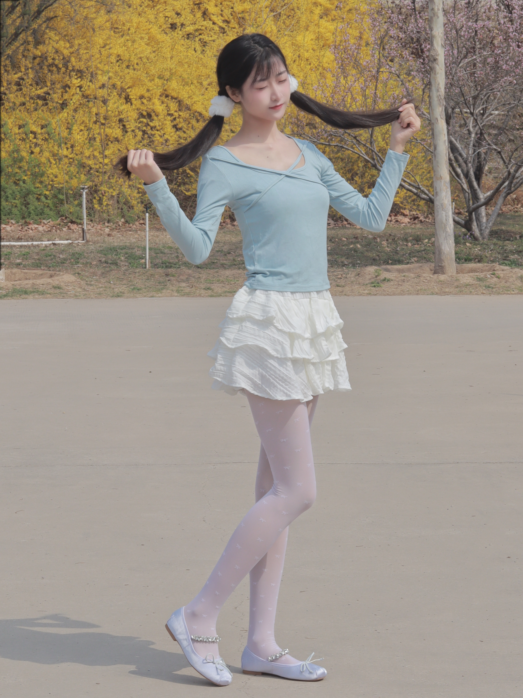 蓝色上衣👕俏皮活泼 搭配高腰蓬蓬裙和芭蕾风单鞋 简约又俏皮~