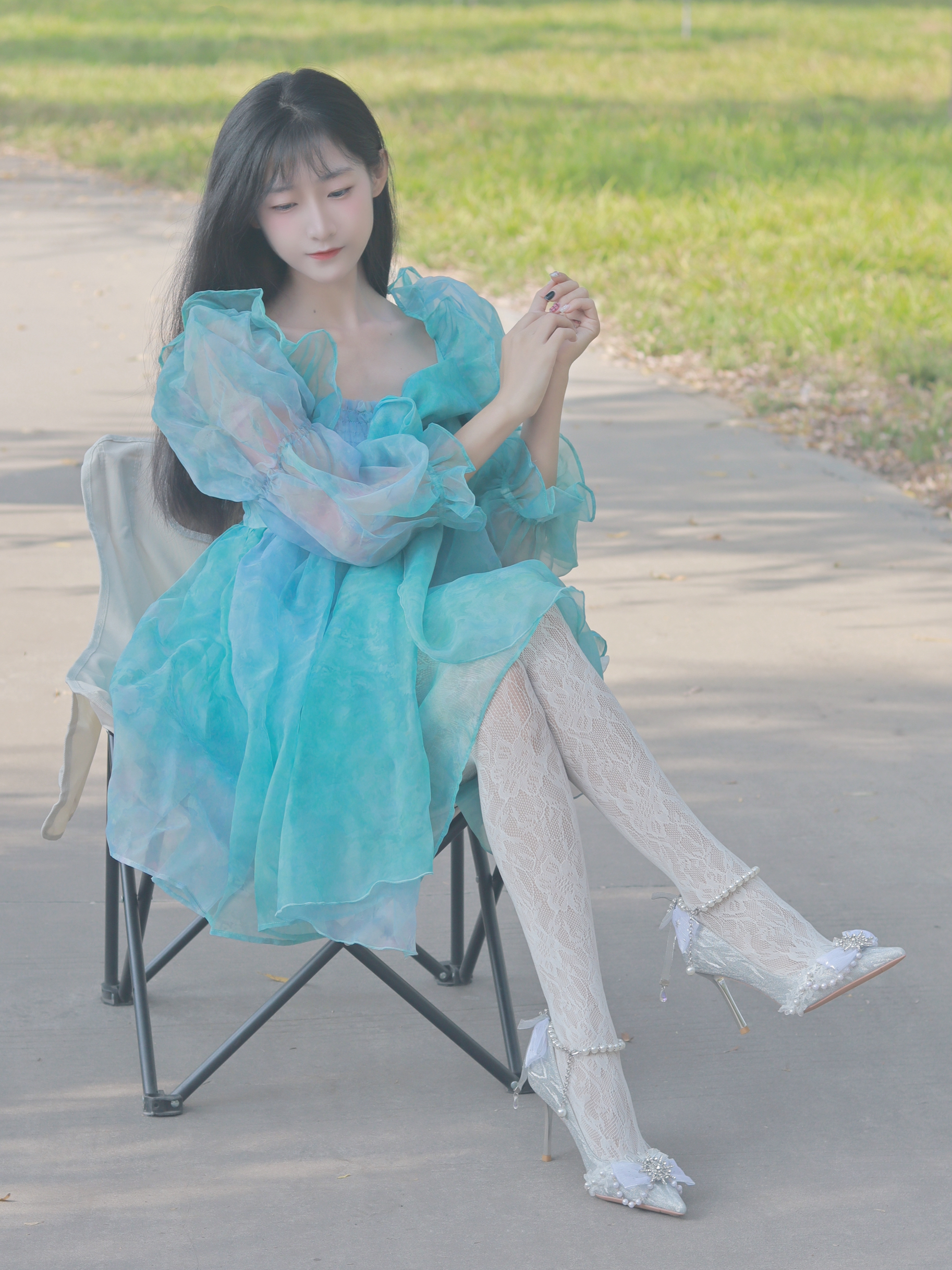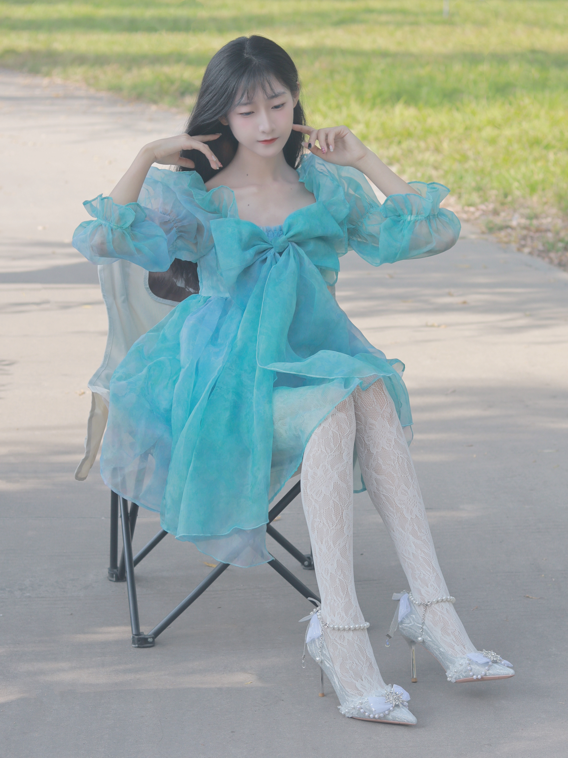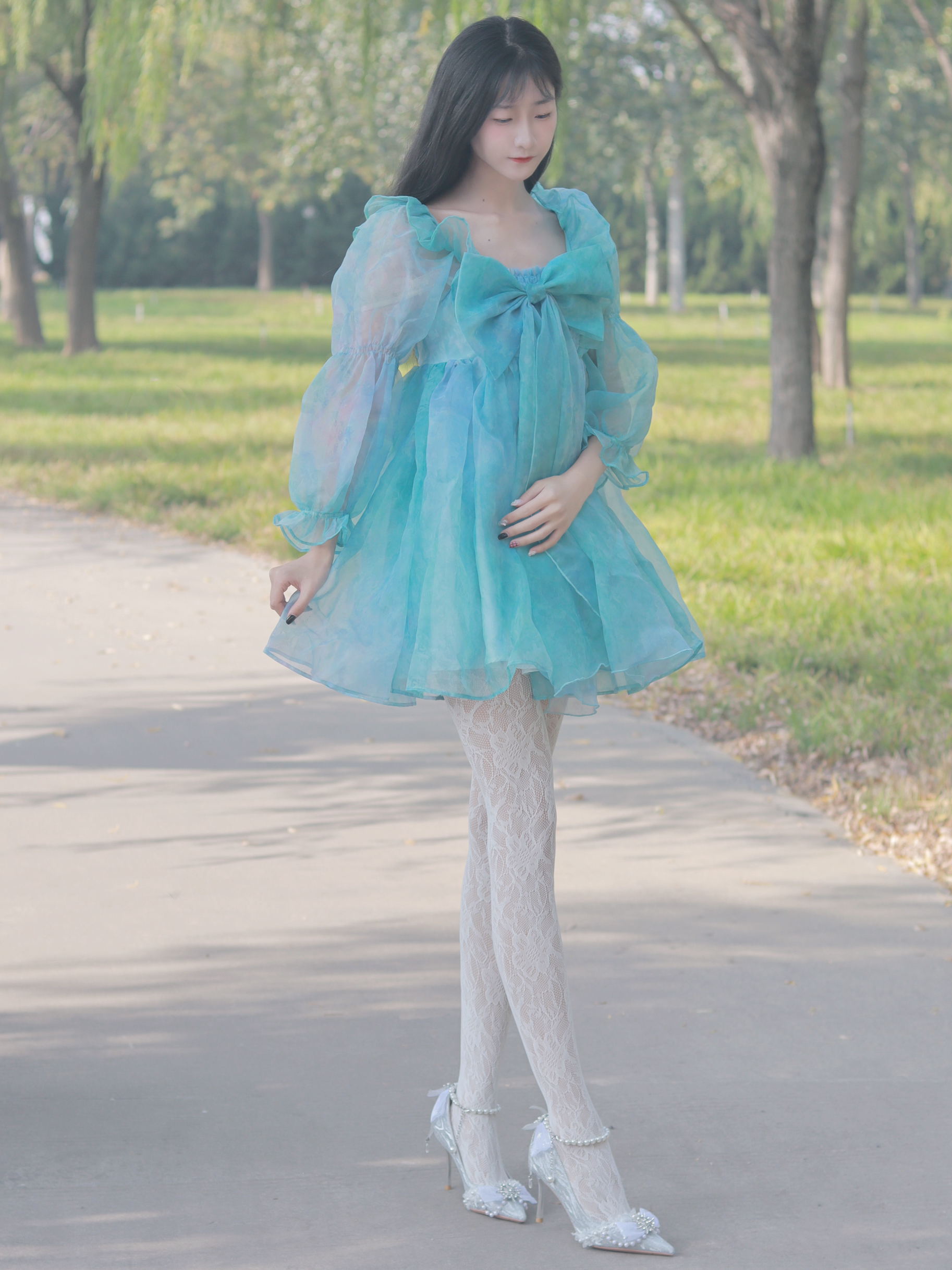 蓝色连衣裙👗个性俏皮 搭配连裤袜和高跟鞋👠 简约又不失时尚~