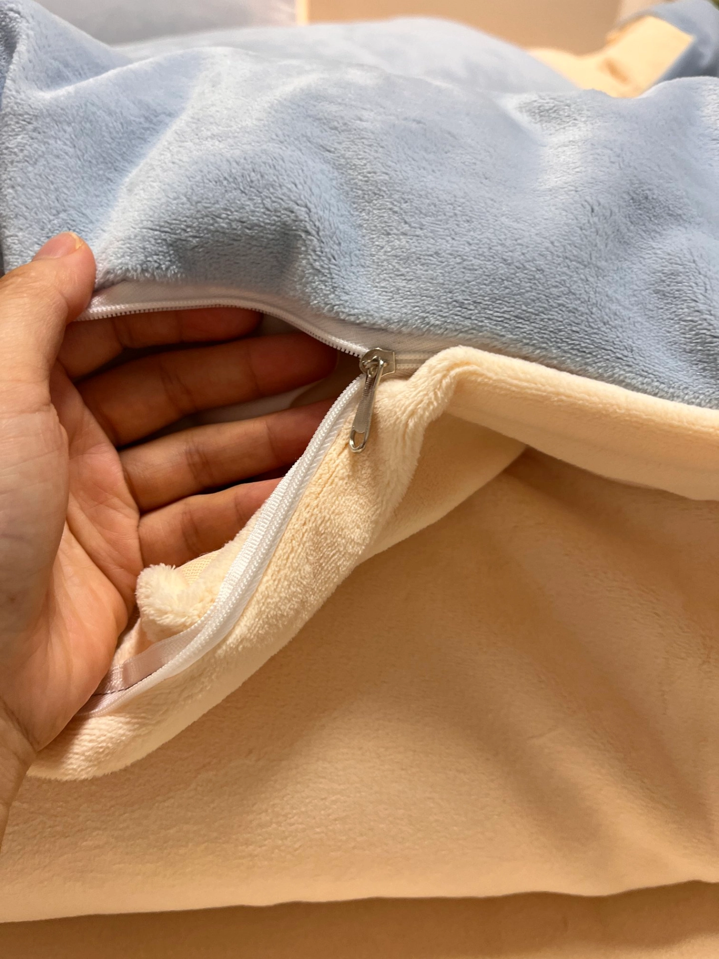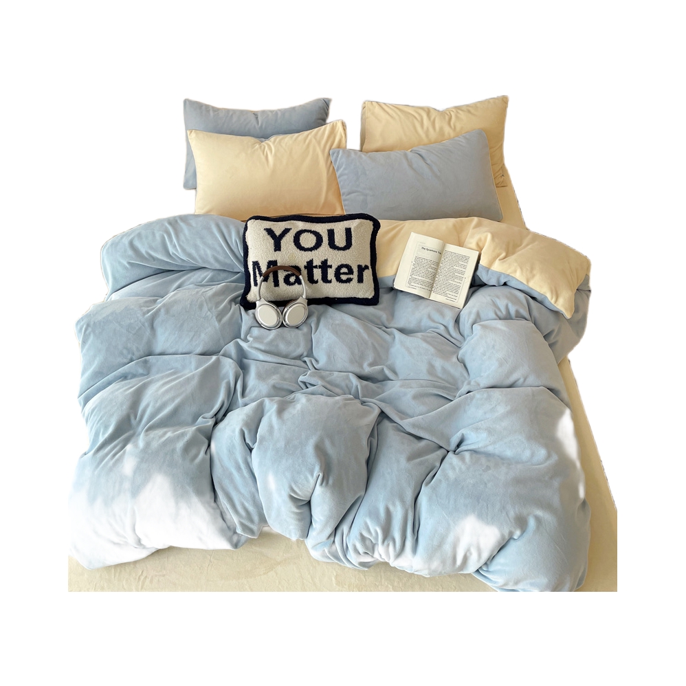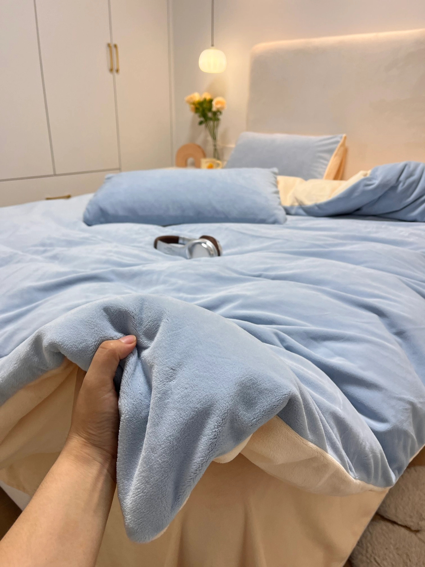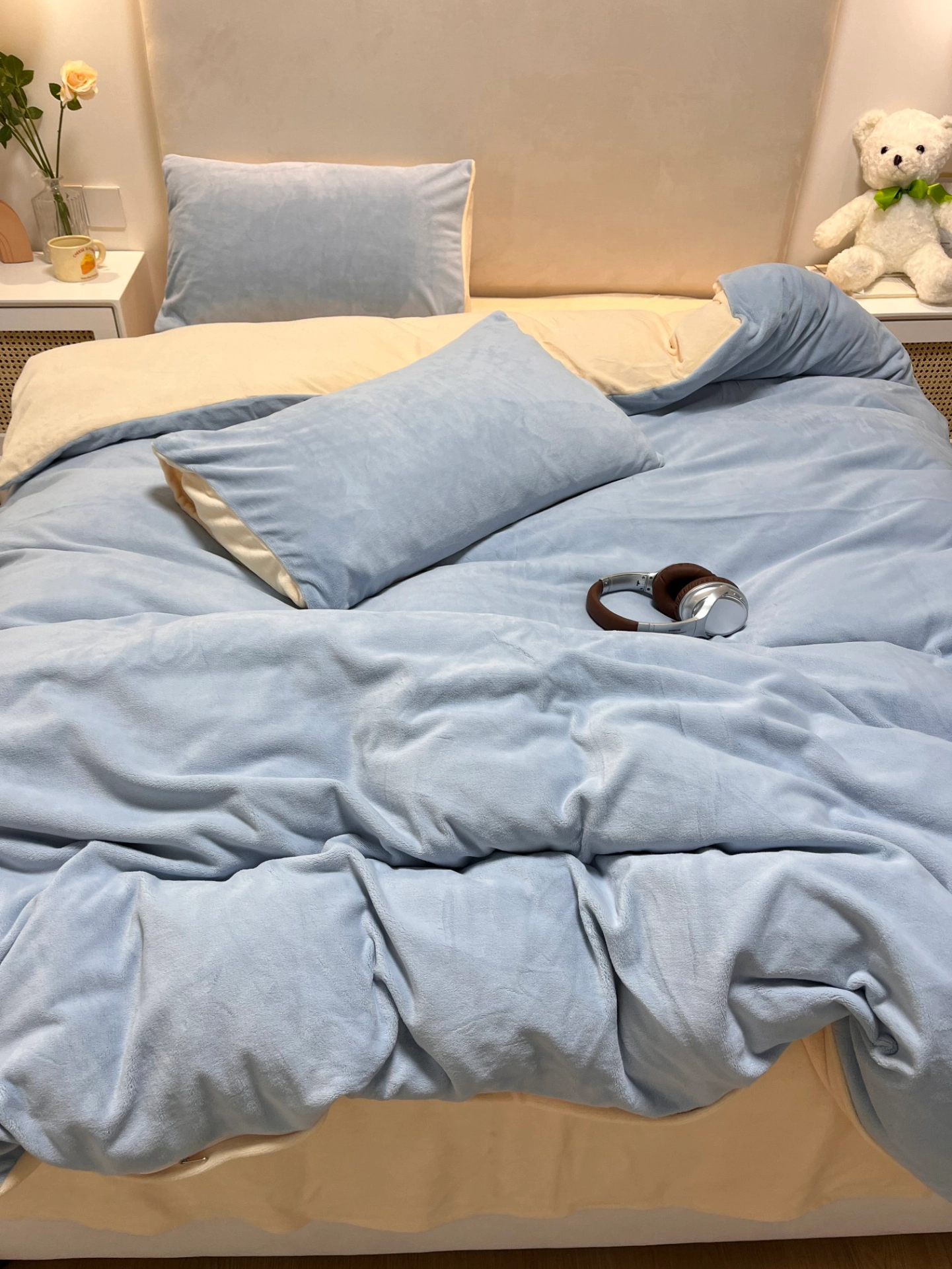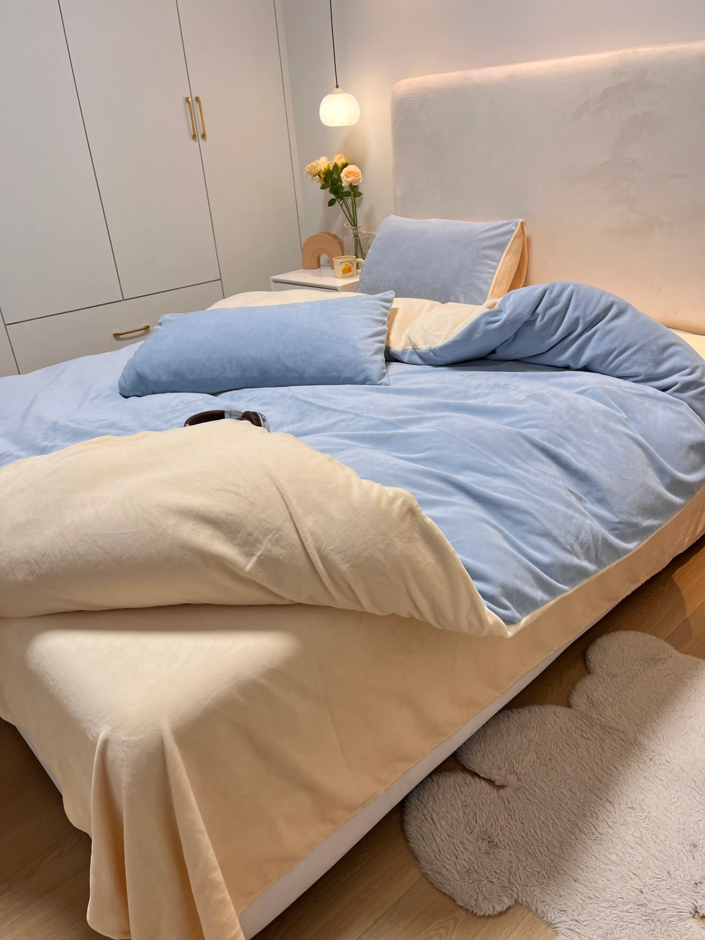天气又搞断崖式降温这一套,我也有我的应对方法!就是这款纯色牛奶绒套件啦!奶蓝配奶黄,整体奶呼呼的看着温馨又可爱,撸猫感的面料更是让我爱不释手,躺进去就不想起床! 图源网络,侵删!