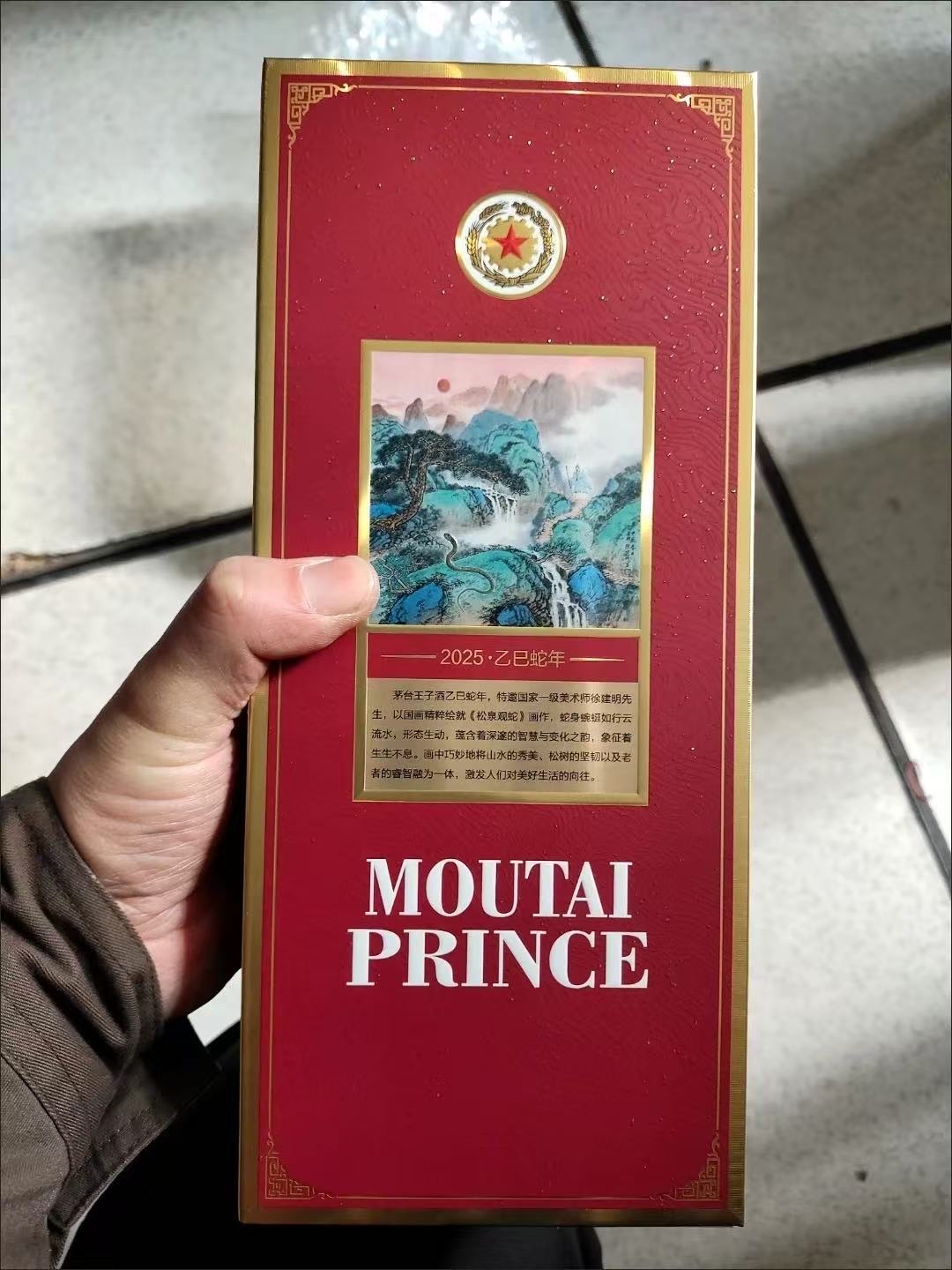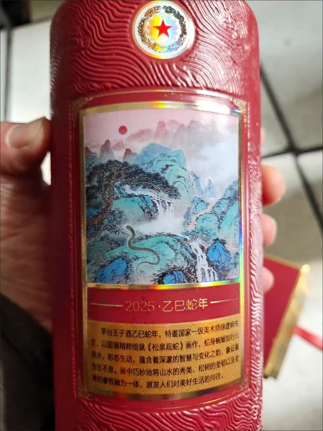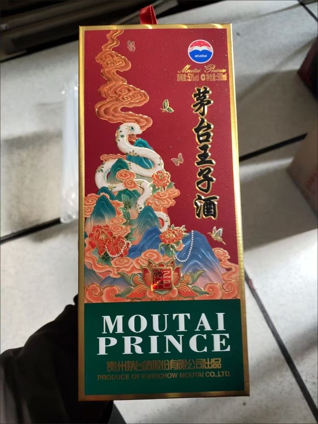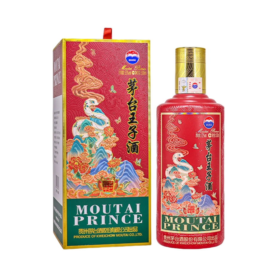 茅台王子酒(乙巳蛇年) 酒瓶以“国色天香”为主题,原创手绘插画展现了蛇萦绕在云山之巅的生动画面,茅台Logo与主题字巧妙融入右侧,形似灵蛇之珠,寓意事业蒸蒸日上。配以牡丹、珍珠、蝴蝶等元素,寓意国色天香。 瓶身以宫墙红为主背景色,辅以绿色肌理碎点,彰显古典之美和富贵之意。瓶盖设计简洁时尚,融入水纹和如意纹元素,寓意吉祥顺遂。此外,乙巳蛇年专属印章的设计,更增添了产品的品质感和艺术性,使其更具收藏价...