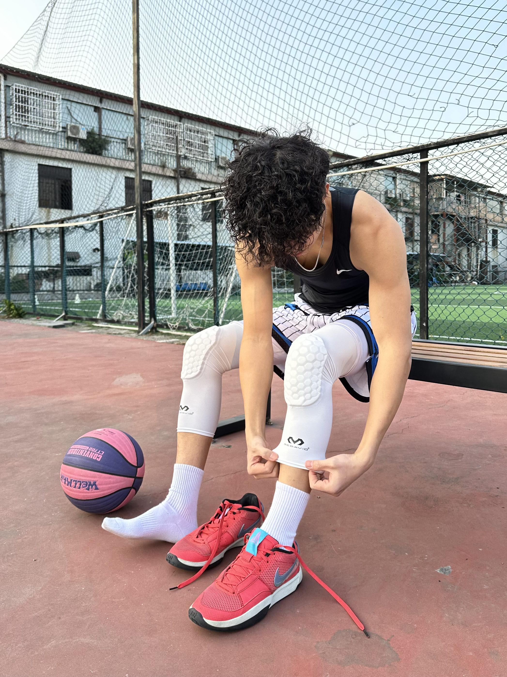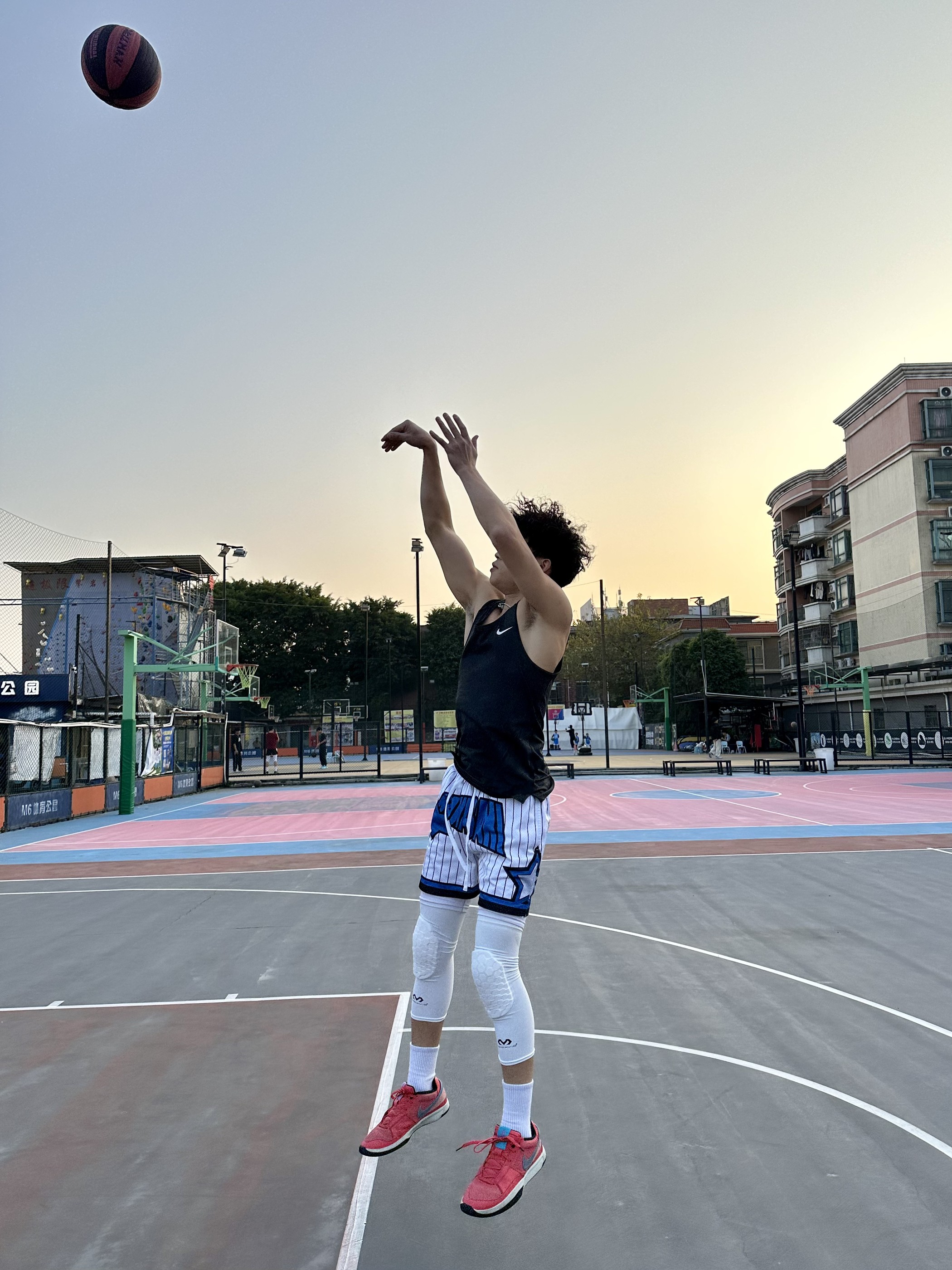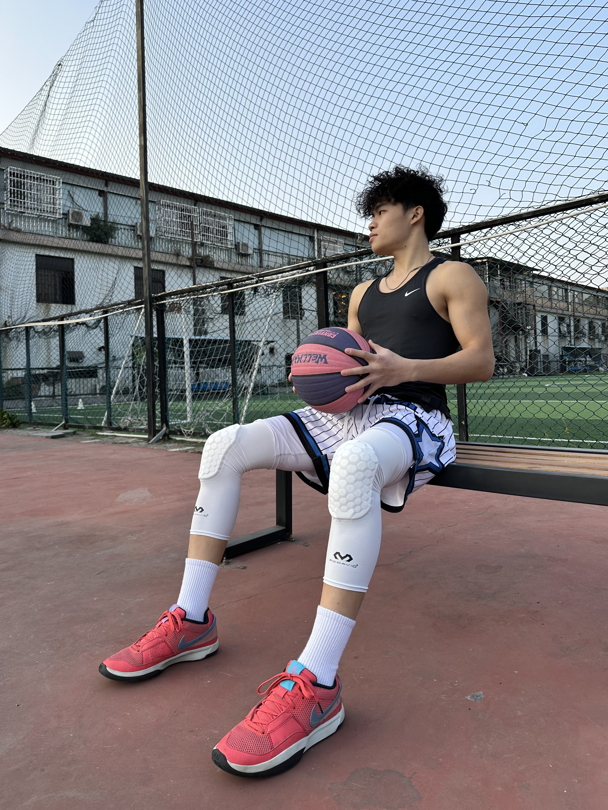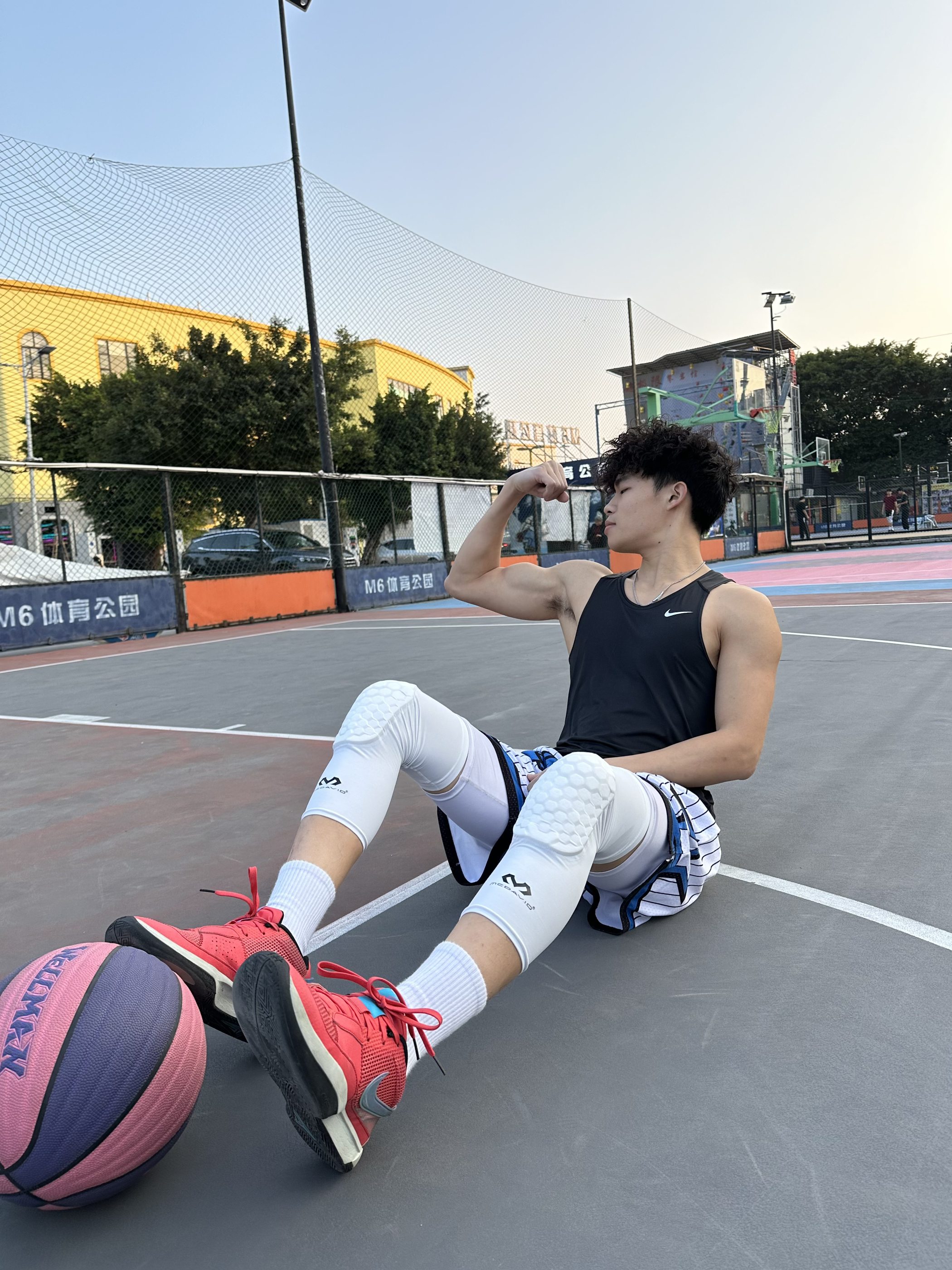 简单介绍今日篮球look - 上身黑色紧身背心🎽 搭配一条美式篮球短裤🩳 鞋子选择红色篮球鞋👟 过年就要穿红色系😎 再带个护膝 新年打球也要保护好自己哟💪