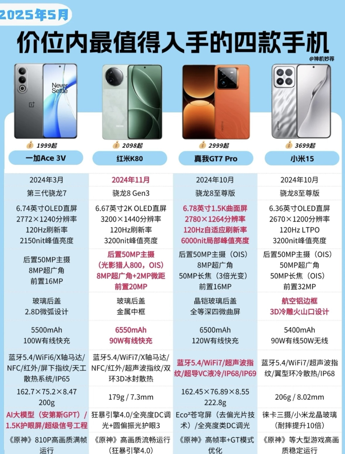 2025性价比中端机比拼.K80:我觉得我赢了 红米K80--2499元:发布最早,但是仍是中 端唯一的2K屏,同时升级了芯片、防水、指 纹、电池。中端机的王者,对比之下其他厂家只 能采用错位价格提升竞争力。 荣耀GT--2199元:最便宜的骁龙8glen3新 机,不多说。 真我Neo7--2099元:唯一上榜的搭载天现9300+的手机。拥有最大的7000毫安时大电池,非常适合经常外出需要长续航的...