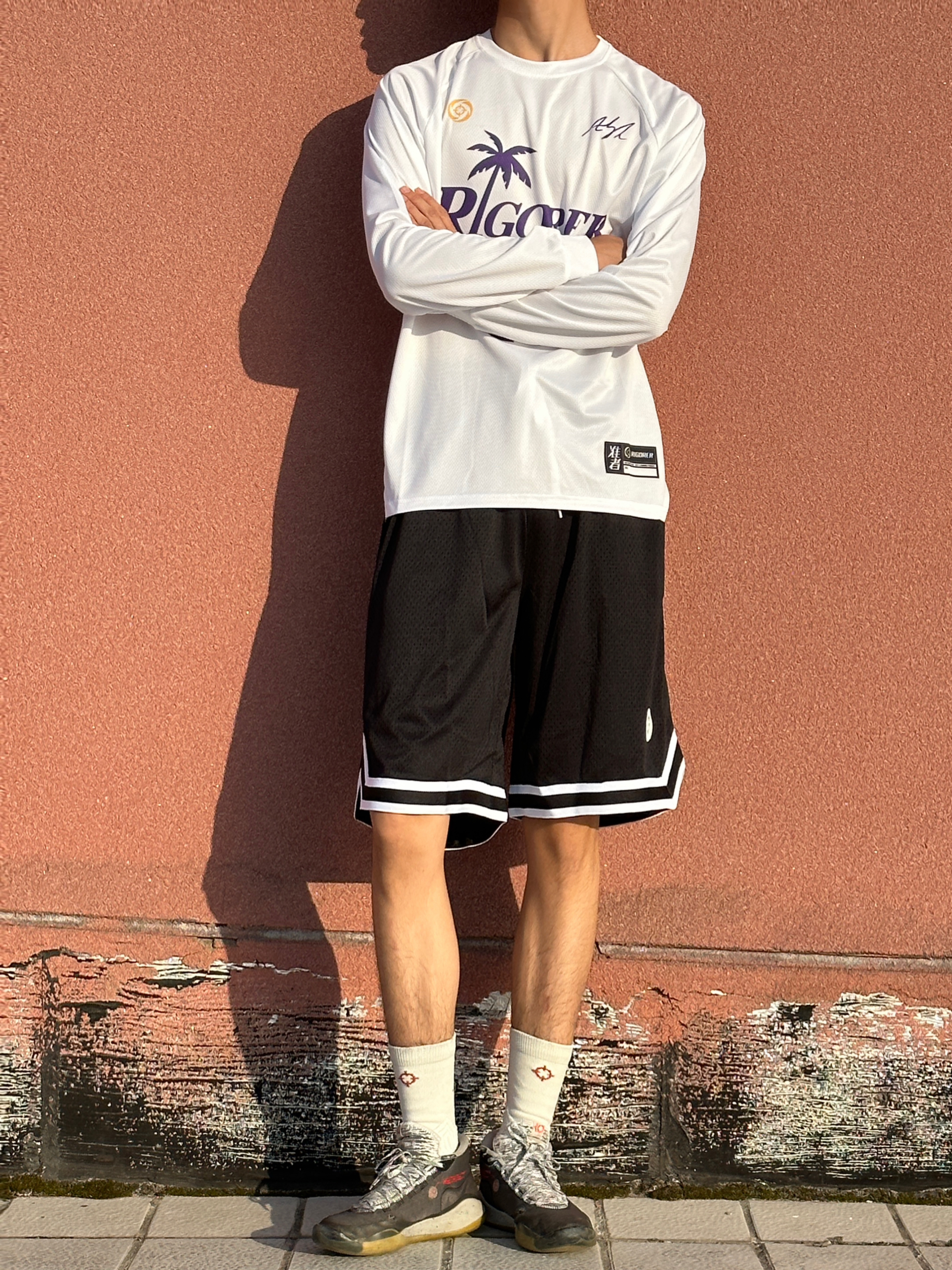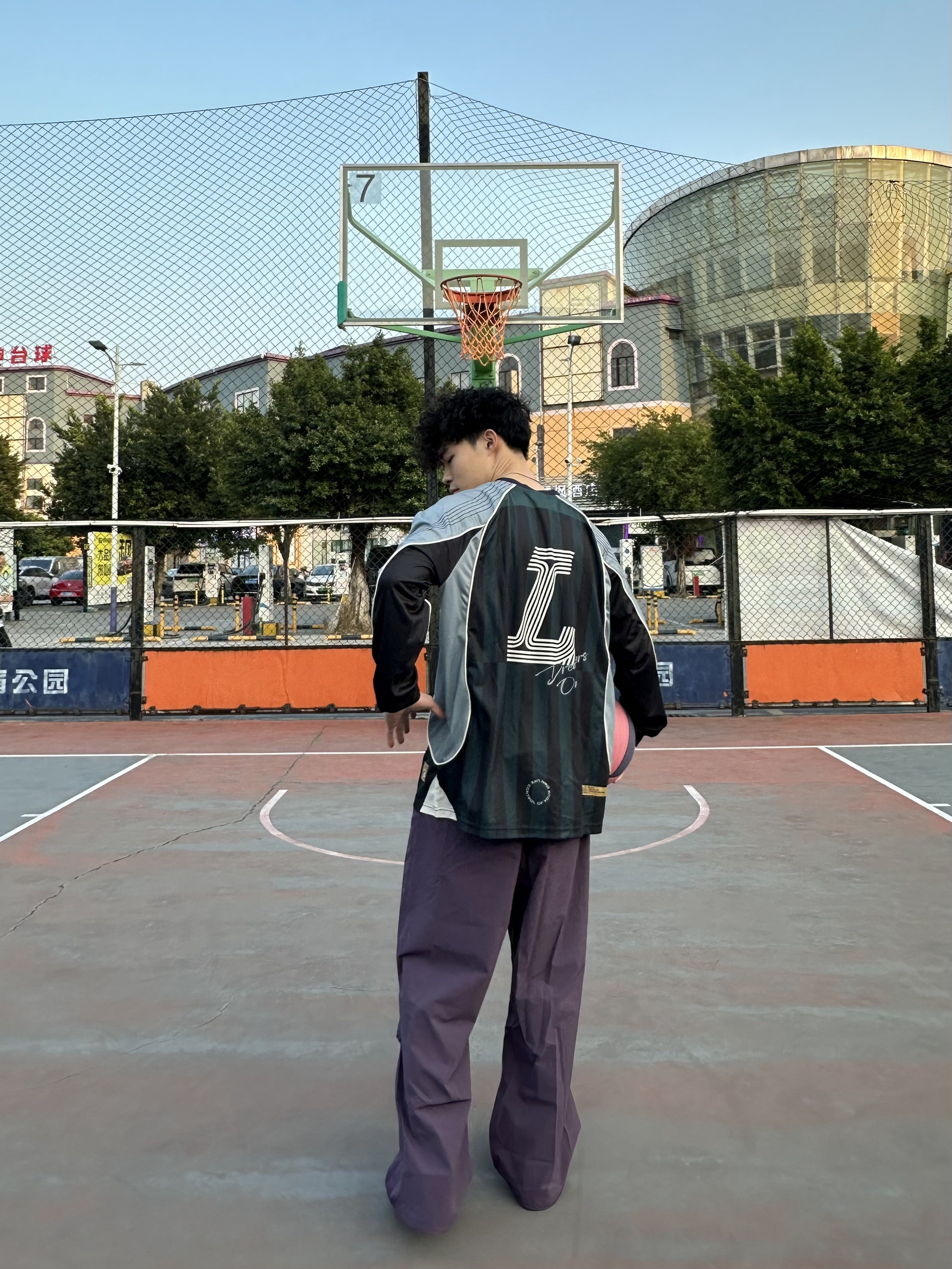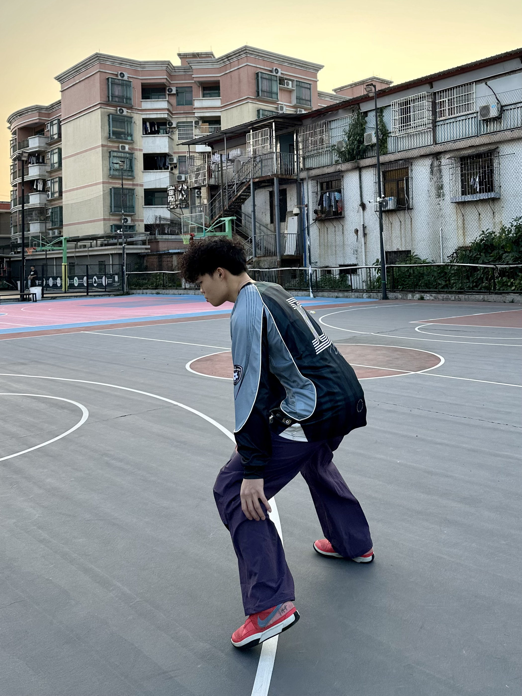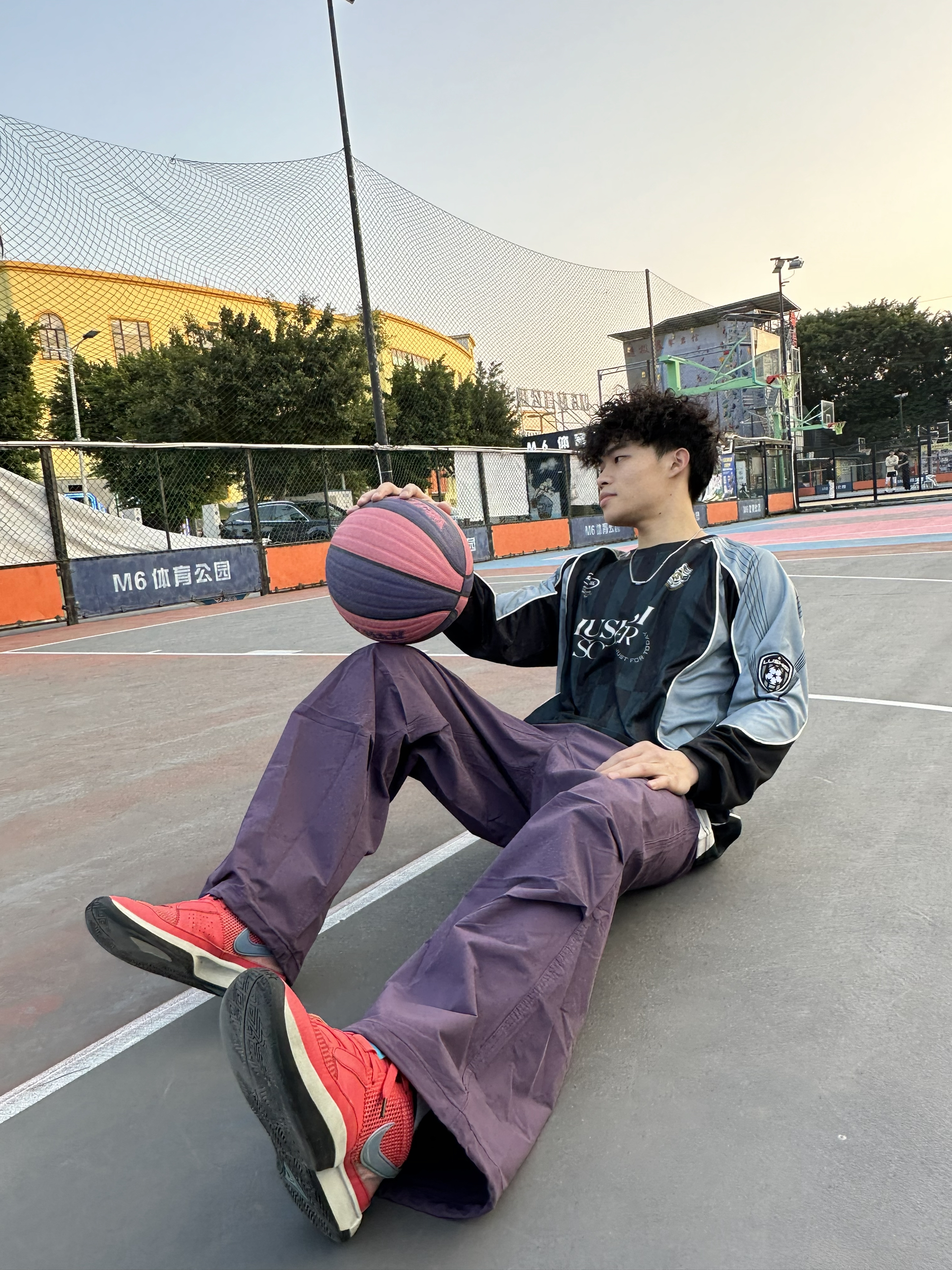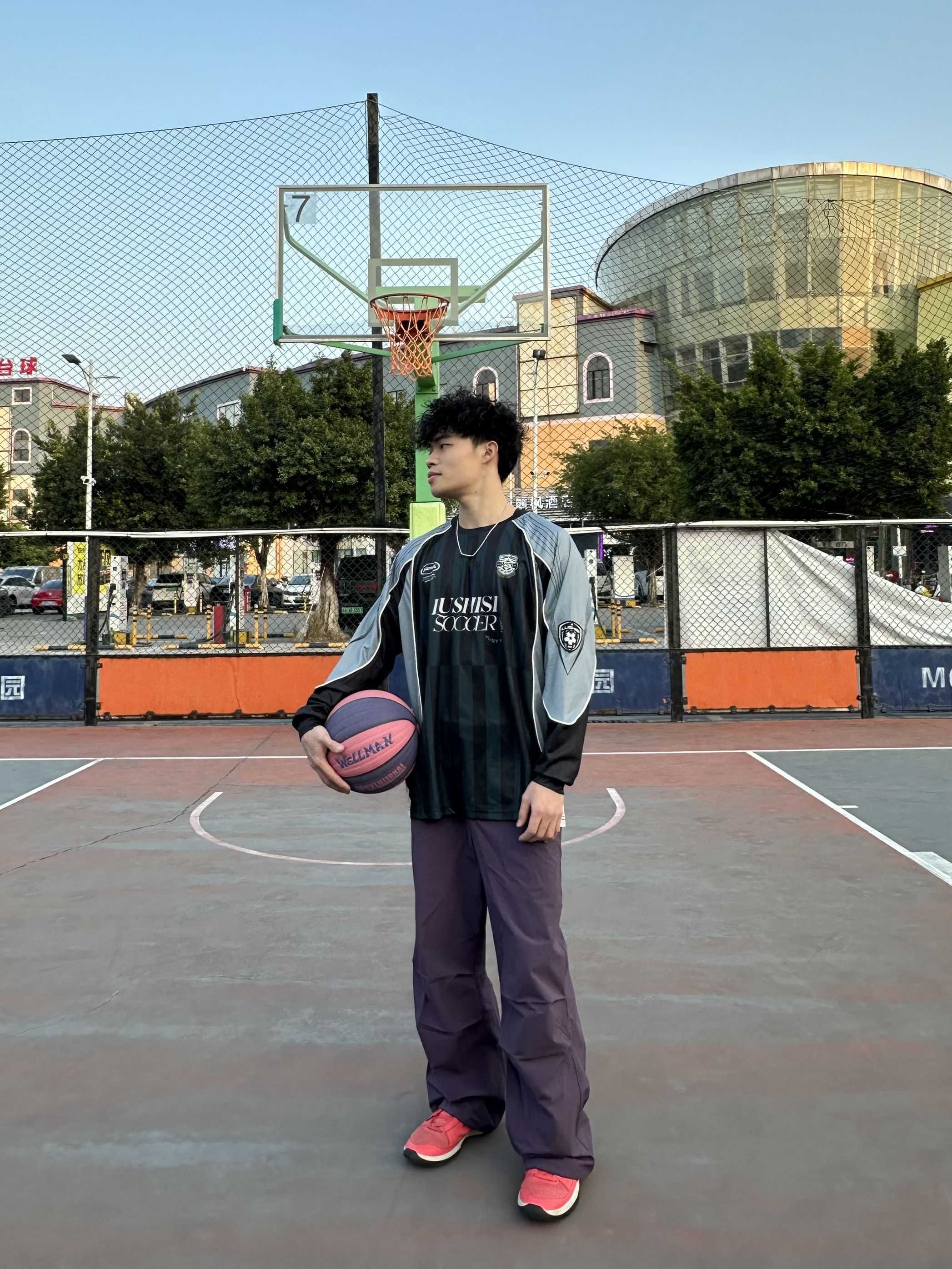 一件足球元素投篮服 酷炫十足 搭配一条暗紫色篮球卫裤👖 鞋子选择红色篮球鞋 主打一个多巴胺美式篮球穿搭🔥 身高|体重:180/70kg 🧍♂️ 穿搭风格:美式运动风 👔 上衣:lushisi 👖 下装:lushisi 👟:nike