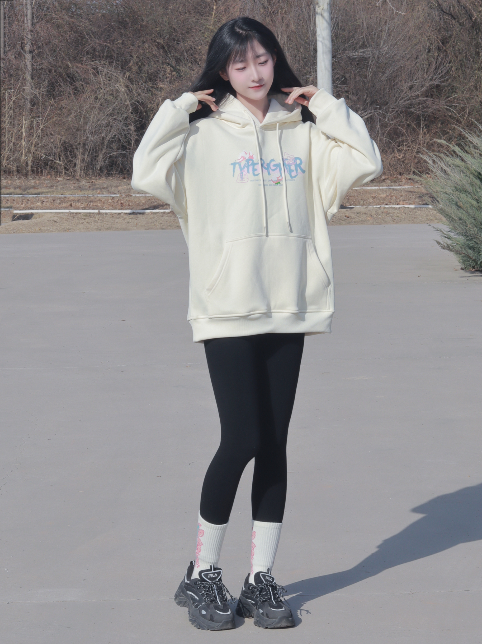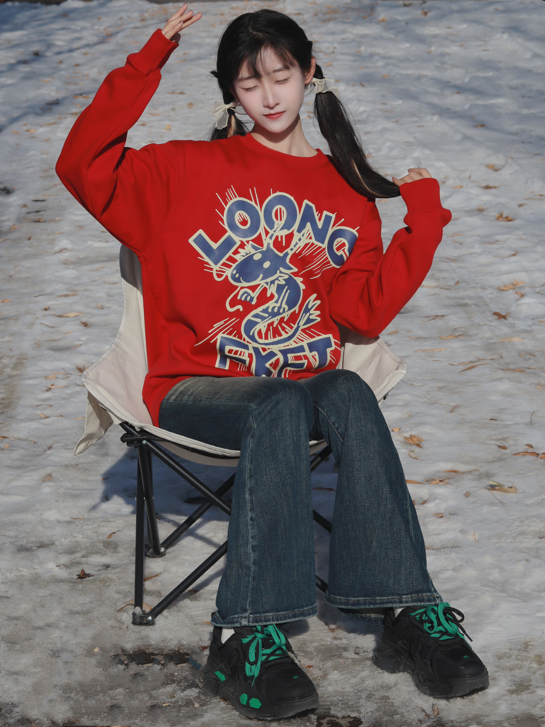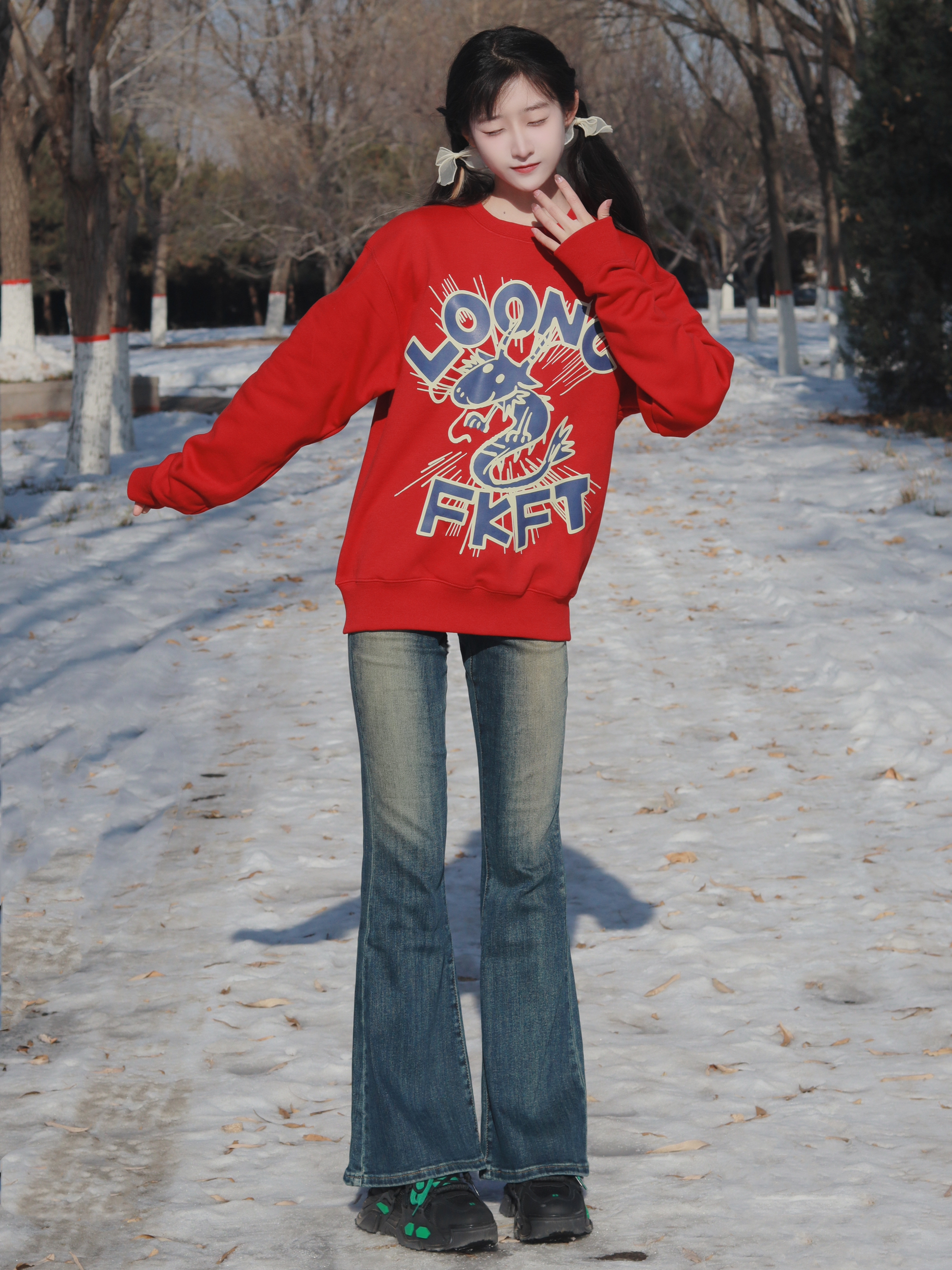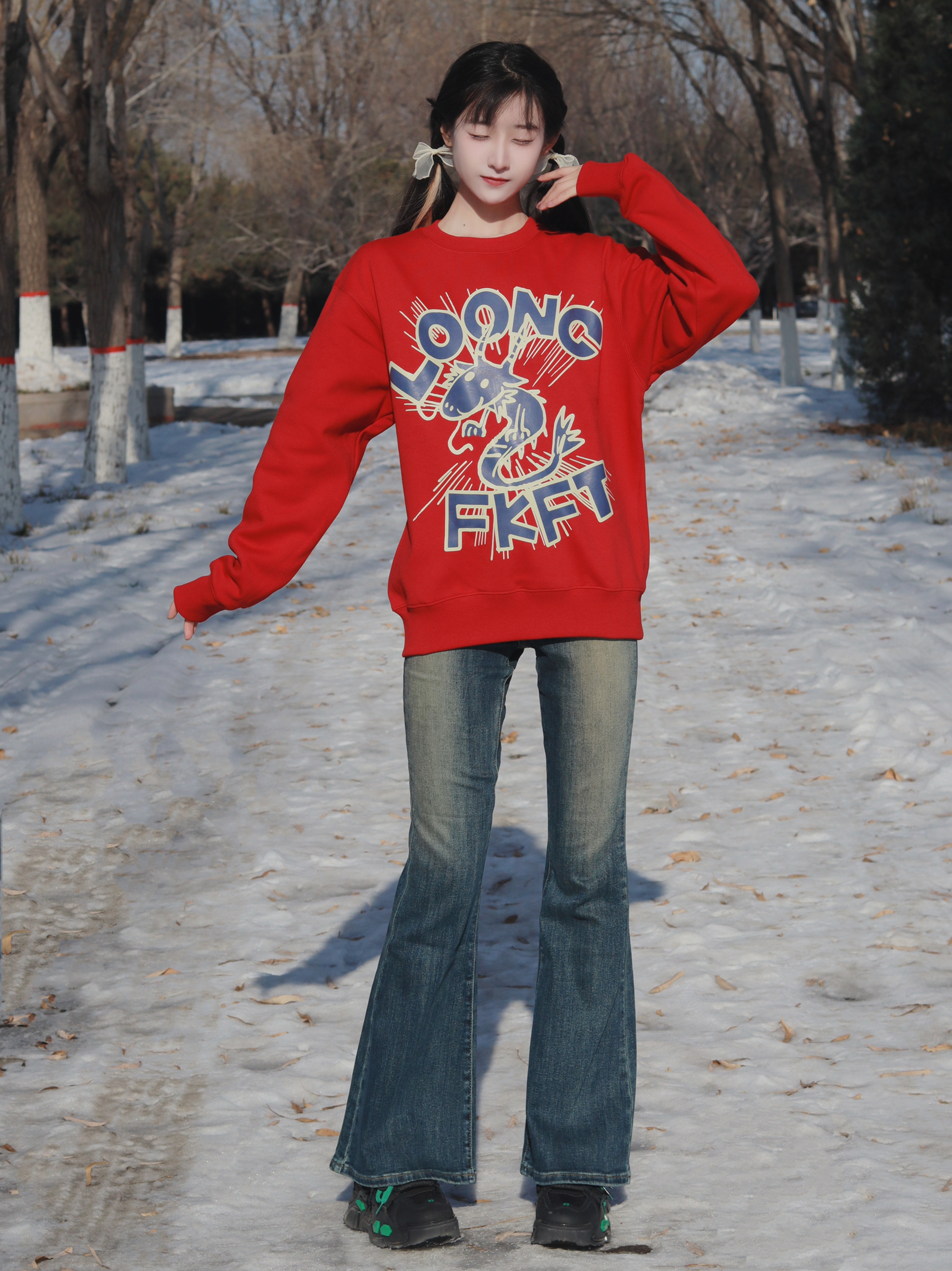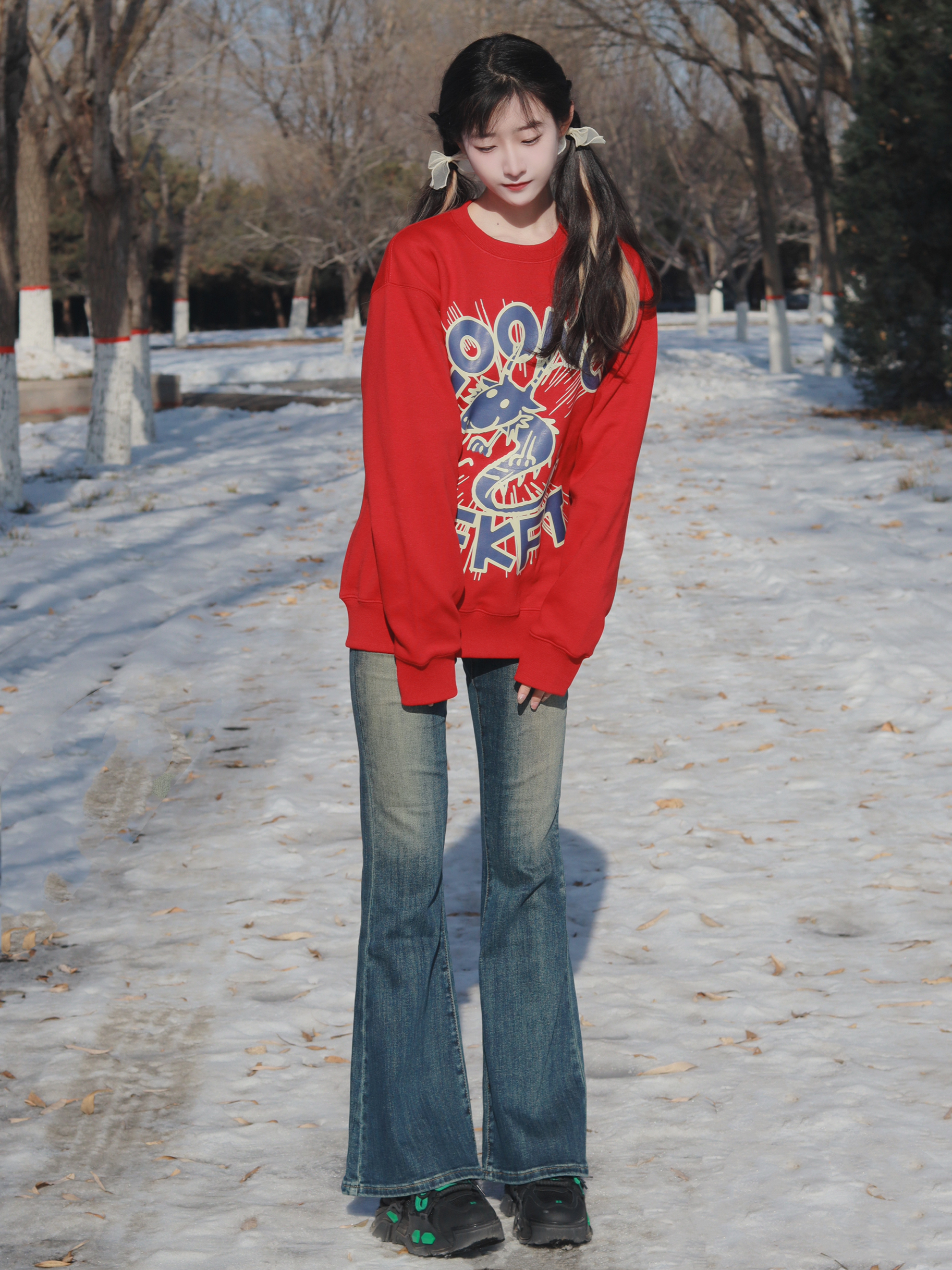 红色卫衣软糯舒适 搭配牛仔喇叭裤和厚底鞋👟 休闲又简约俏皮~