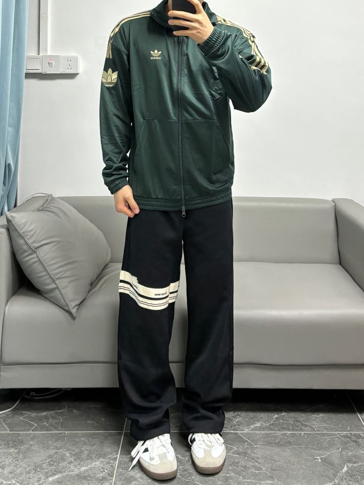 👔衣服是一件绿色宽松运动外套 双拉链的设计 面料顺滑摸着舒服柔软 穿着亲肤,日常穿或者运动穿都合适 👖裤子搭配一条裤腿条纹织带休闲裤 直筒版型比较修饰腿型 面料做工都不错的穿着也舒服 日常很百搭哦 (图源网络侵删)