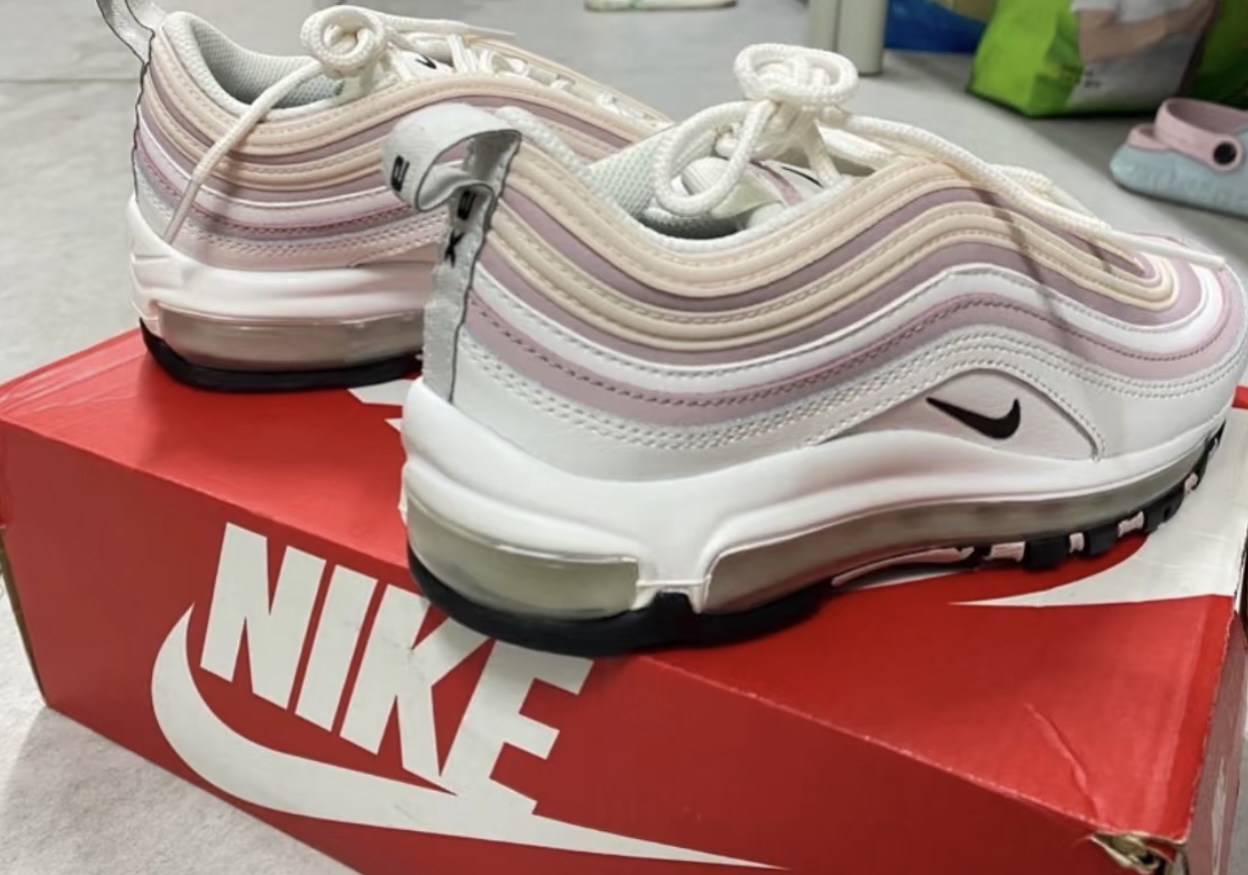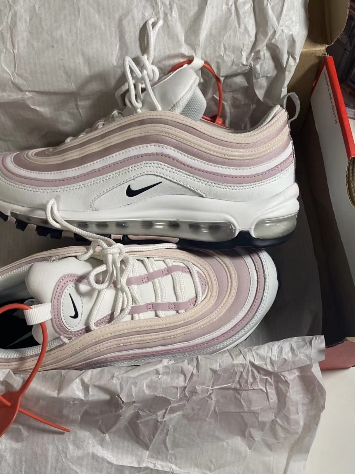 本篇笔记关联了Nike Air Max 97 跑鞋 气垫减震全掌舒适透气防滑耐磨百搭复古织物合成革运动时尚圆头包裹性支撑 淡粉/白色等商品,为用户提供真实的使用体验和购买参考。