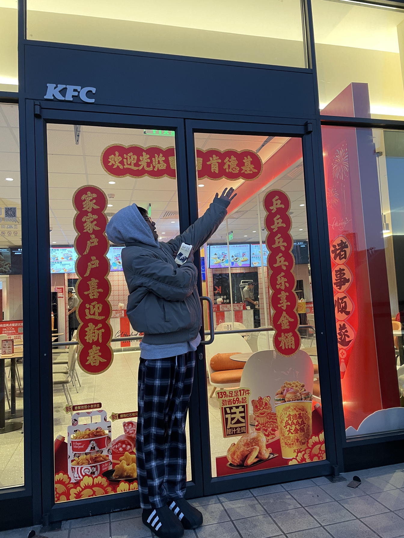 外套穿的是ch的夹克 再搭上格子裤 还有阿迪达斯的贝壳头拖鞋