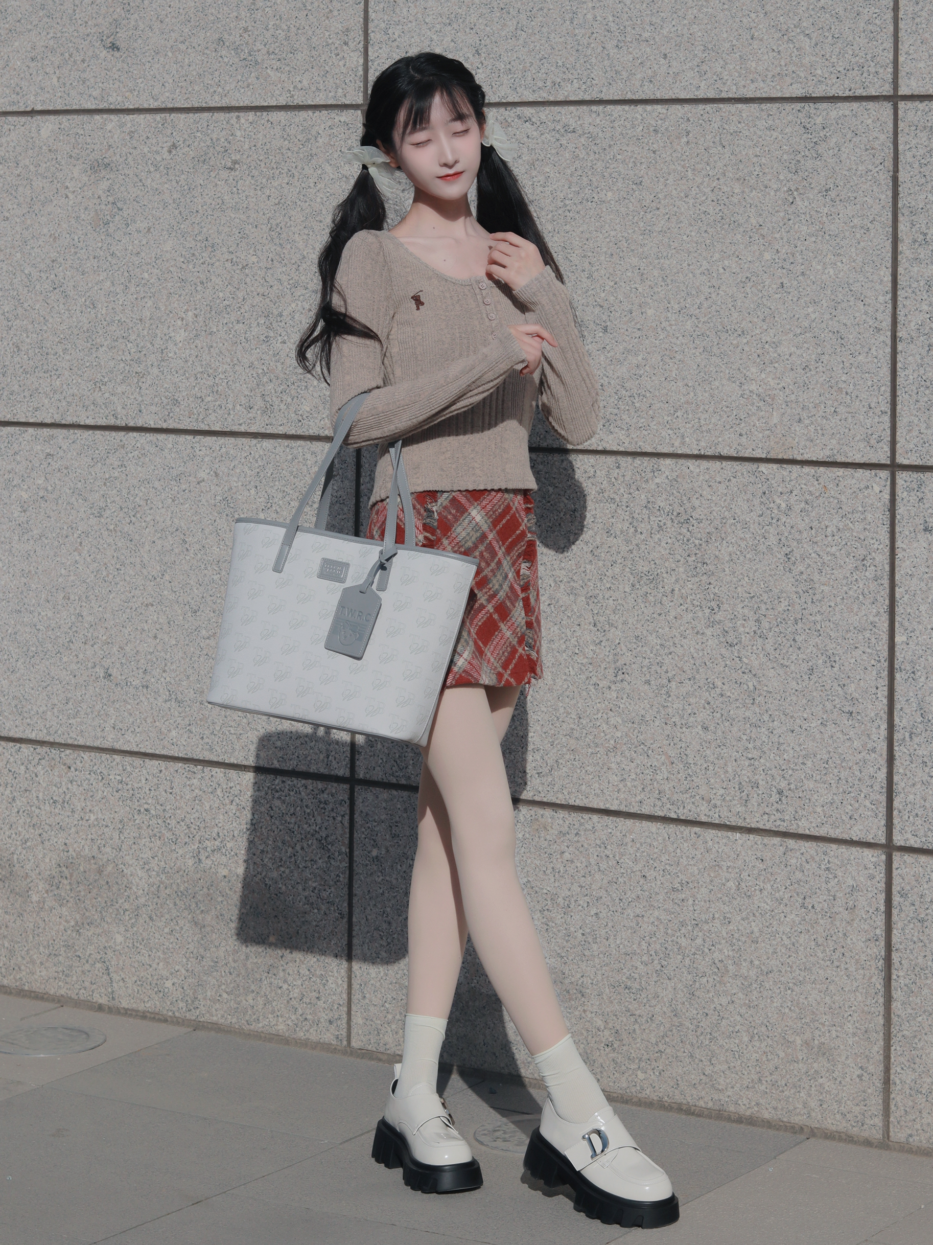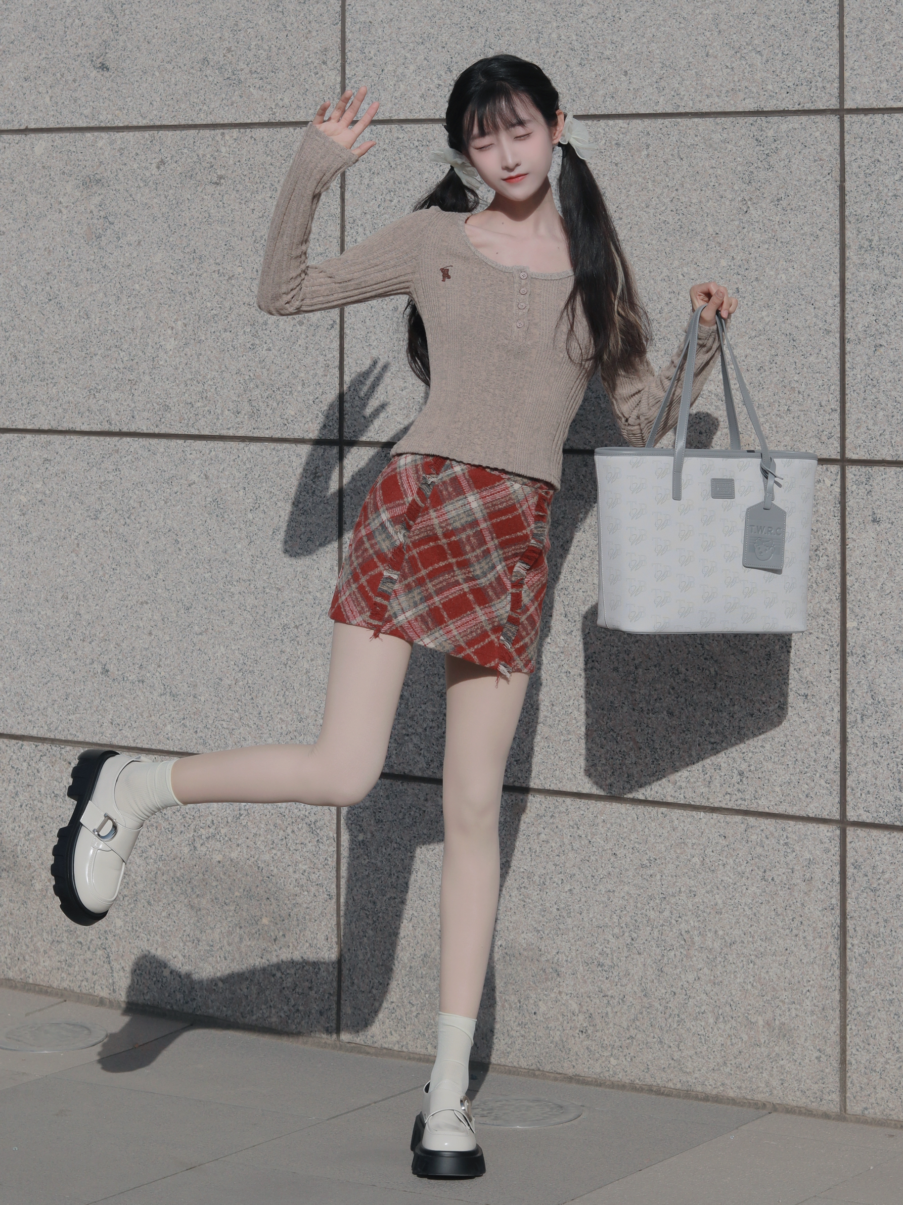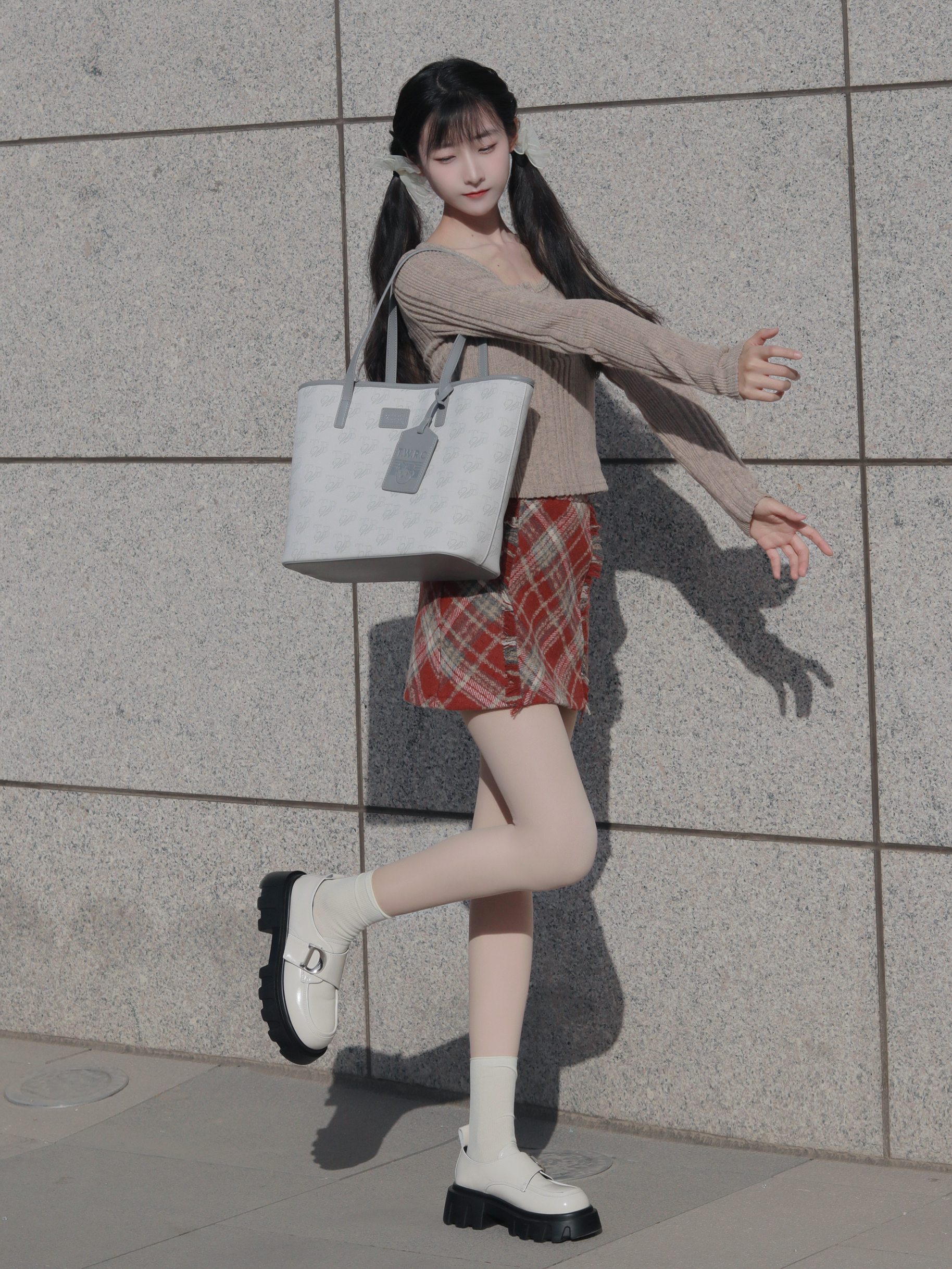 咖色上衣搭配红色半裙 搭配浅色托特包和高筒袜🧦 俏皮又活泼~