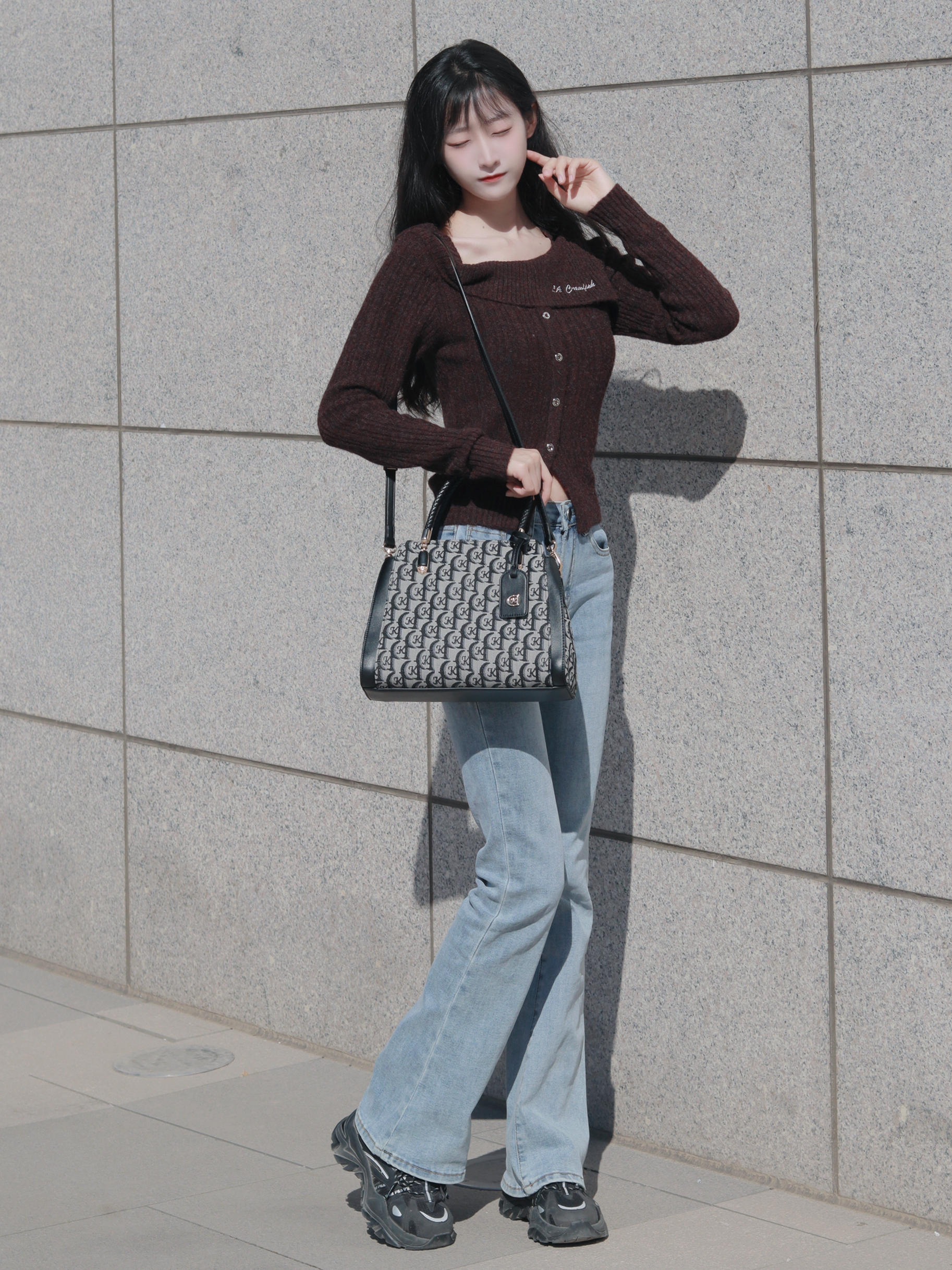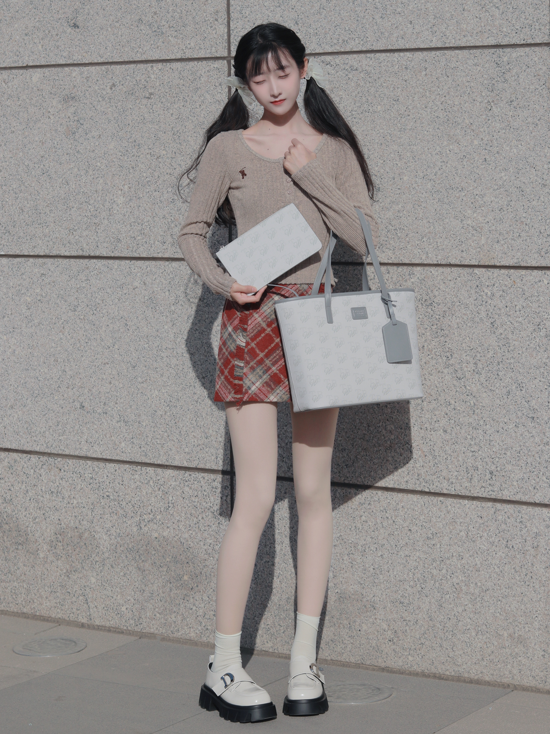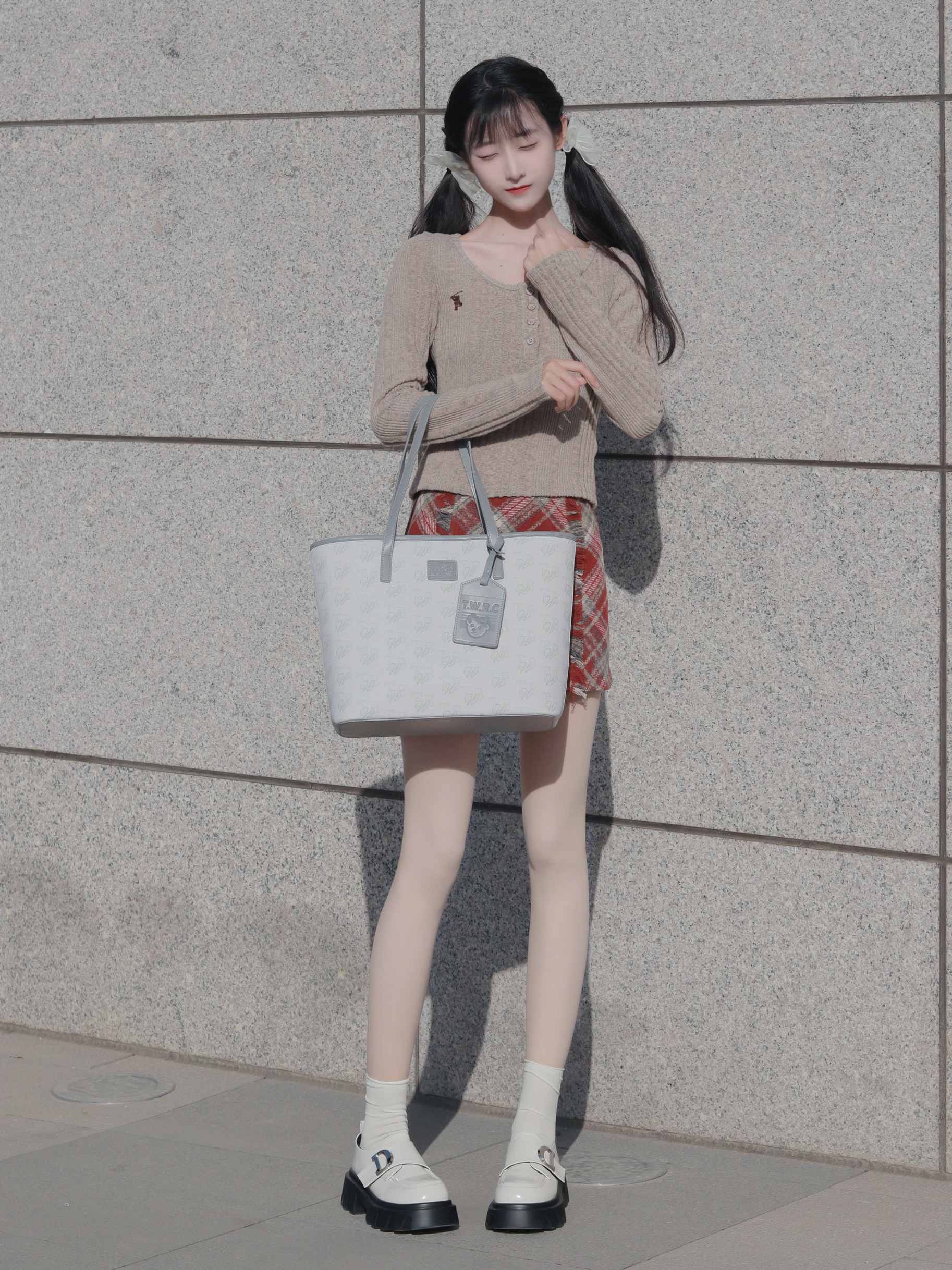 咖色上衣搭配红色半裙 搭配浅色托特包和高筒袜🧦 俏皮又活泼~