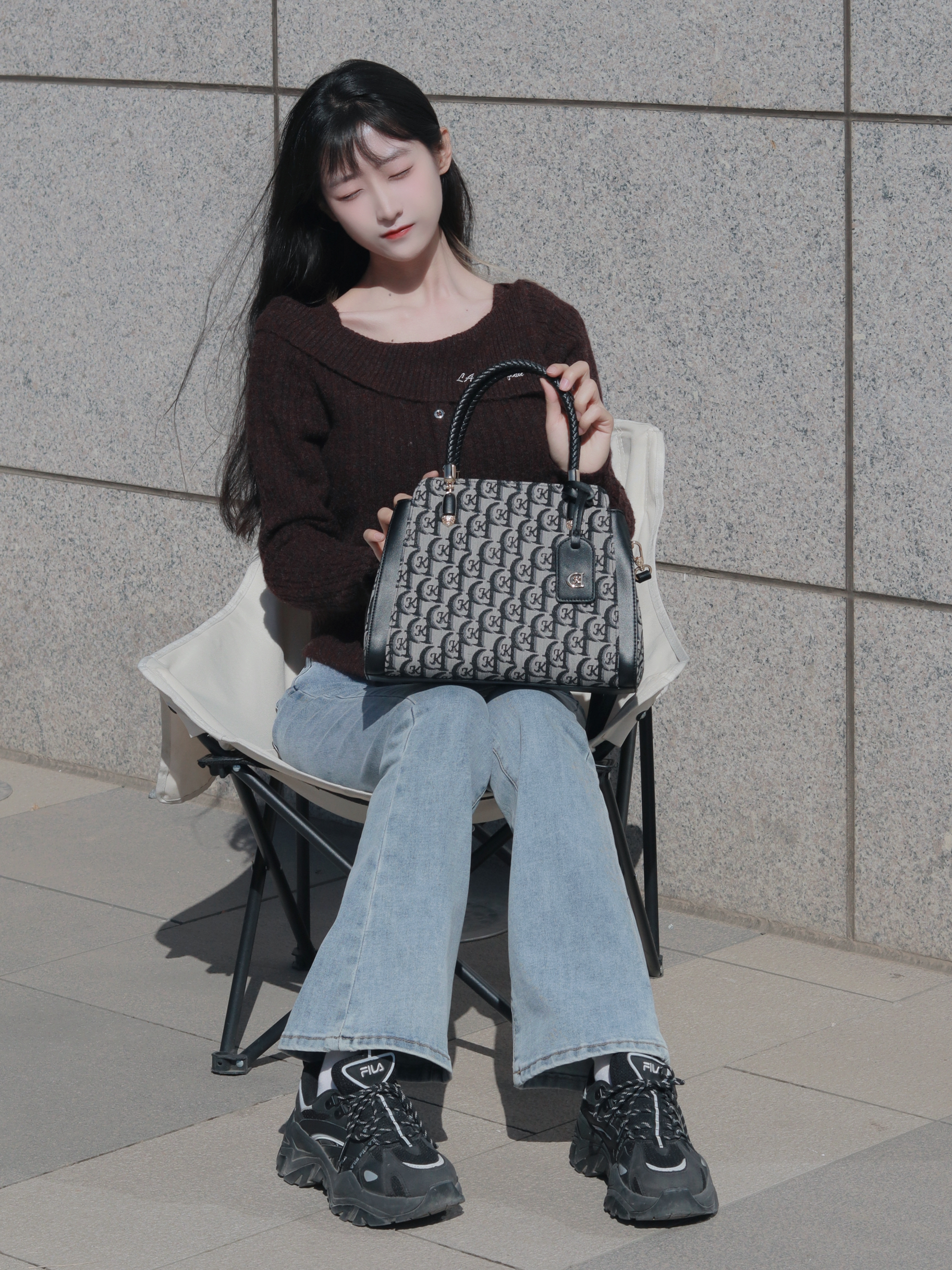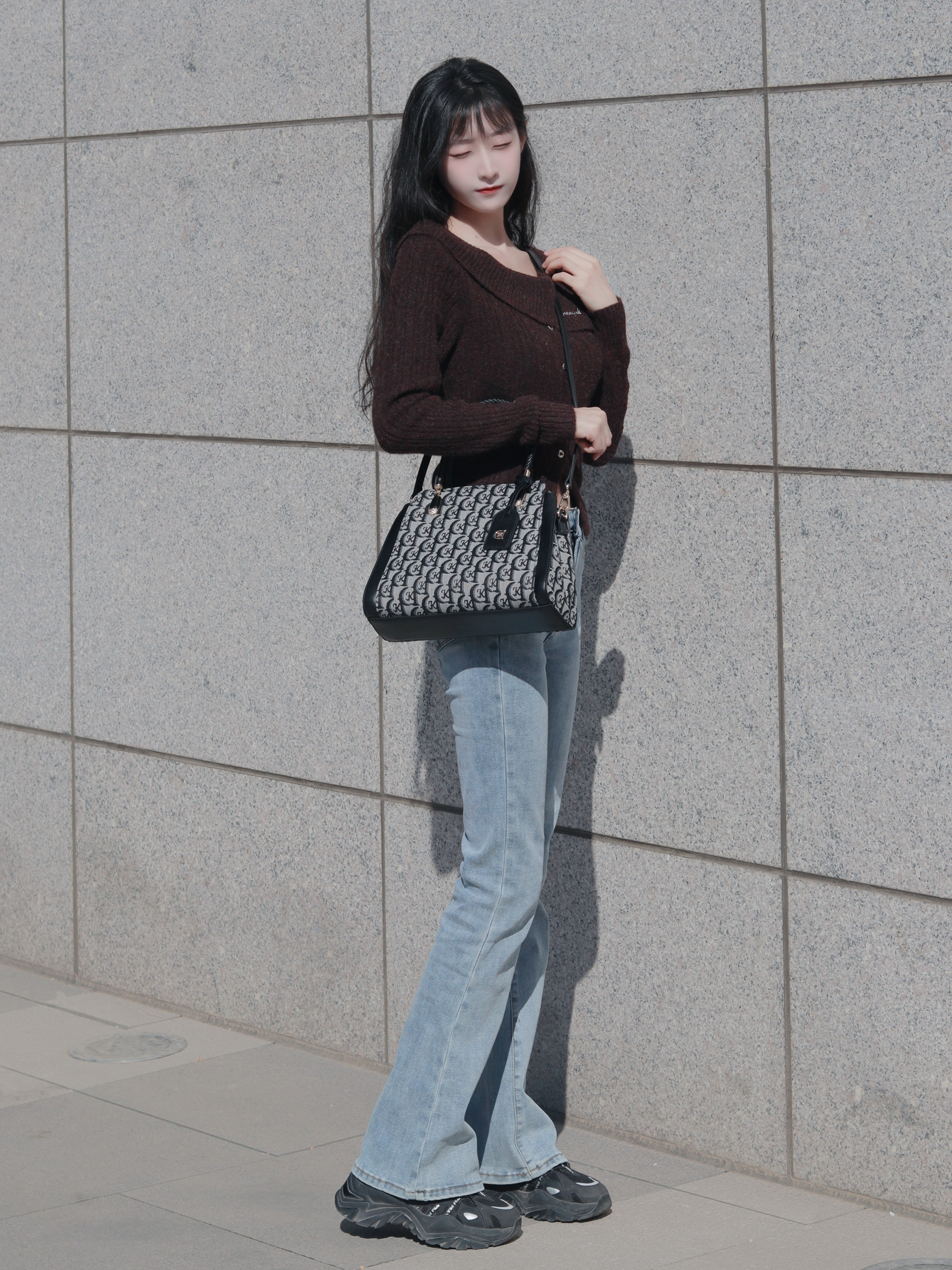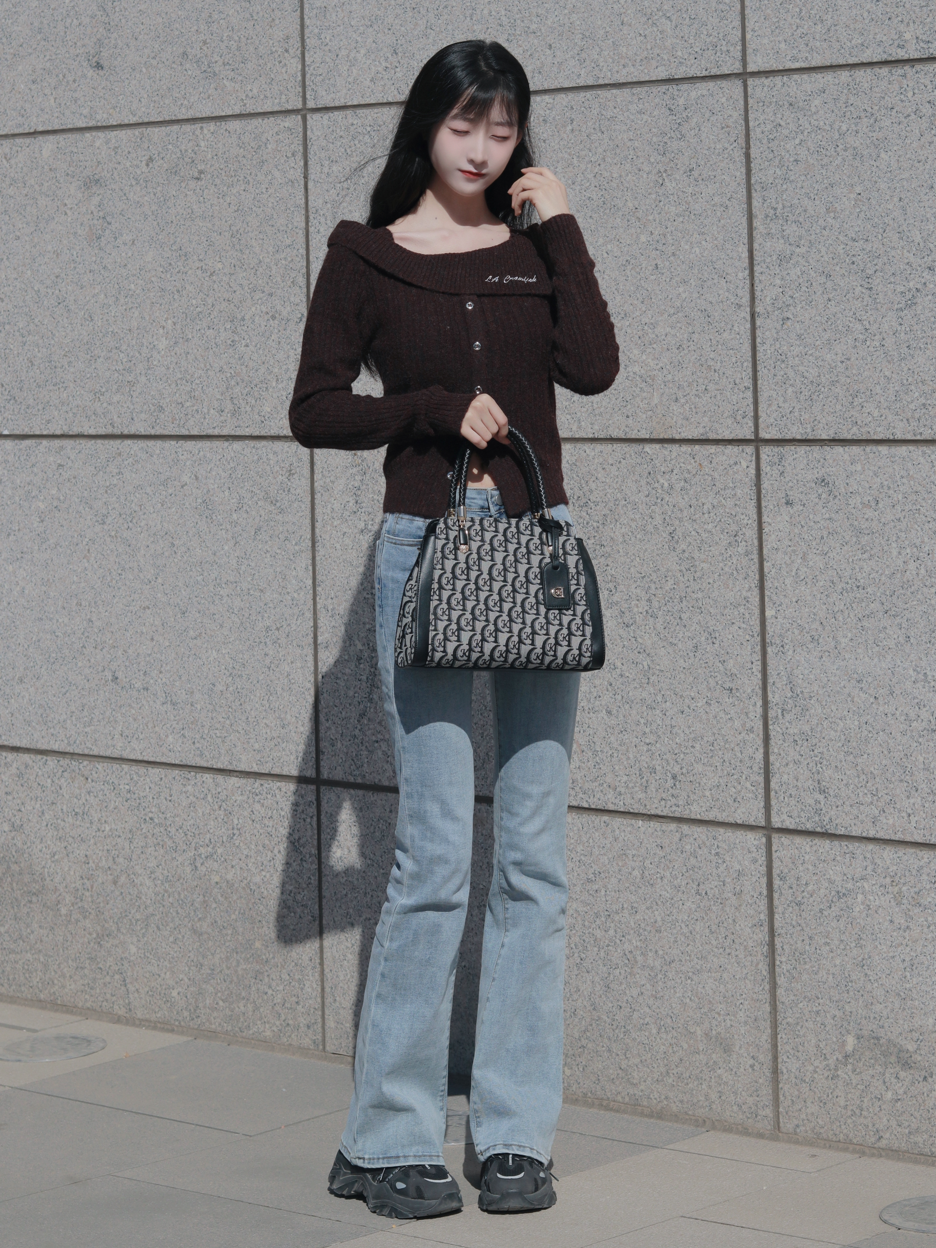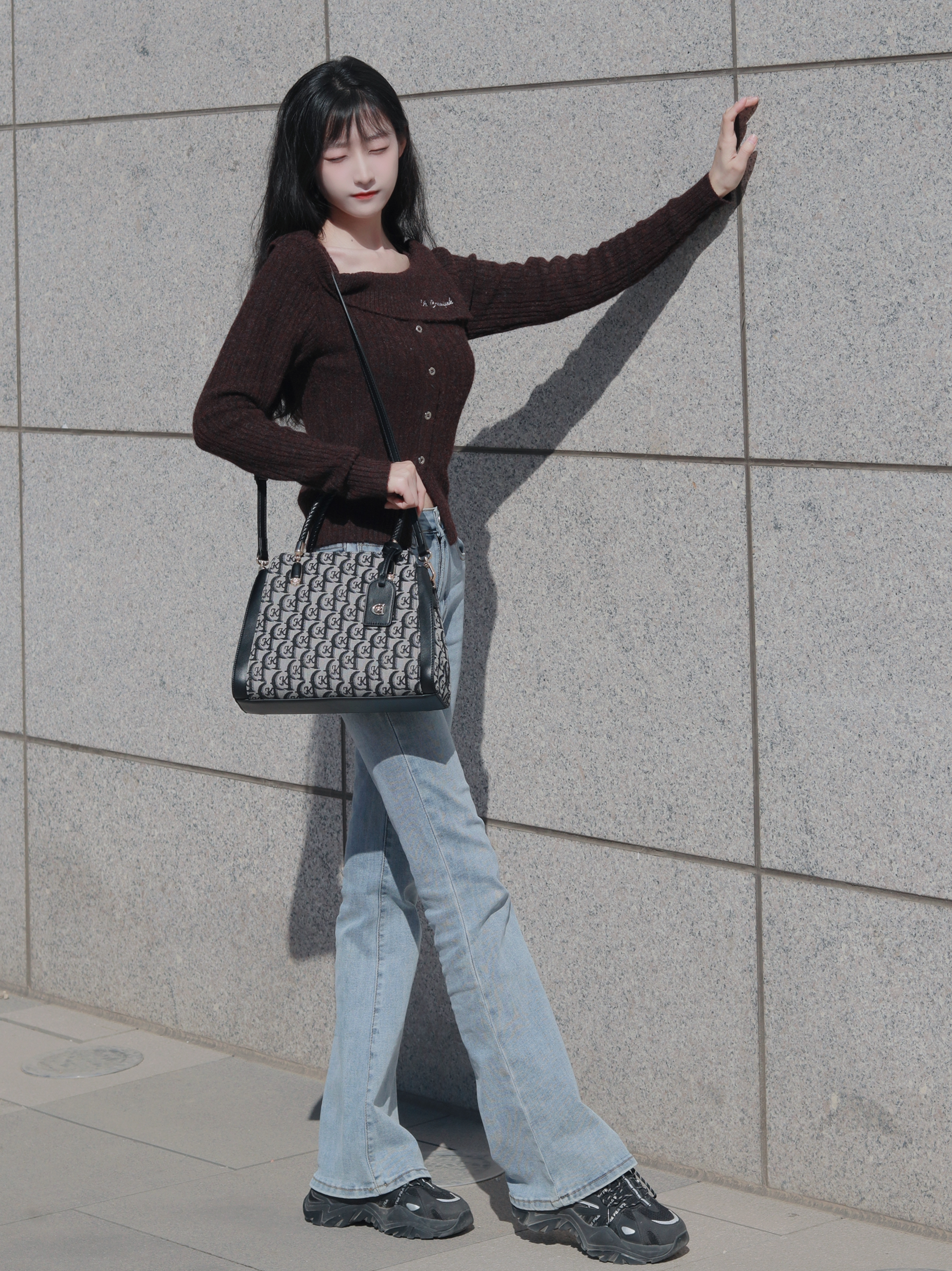 咖色上衣软糯舒适 搭配高腰牛仔裤👖和斜挎包 简约大方又百搭~