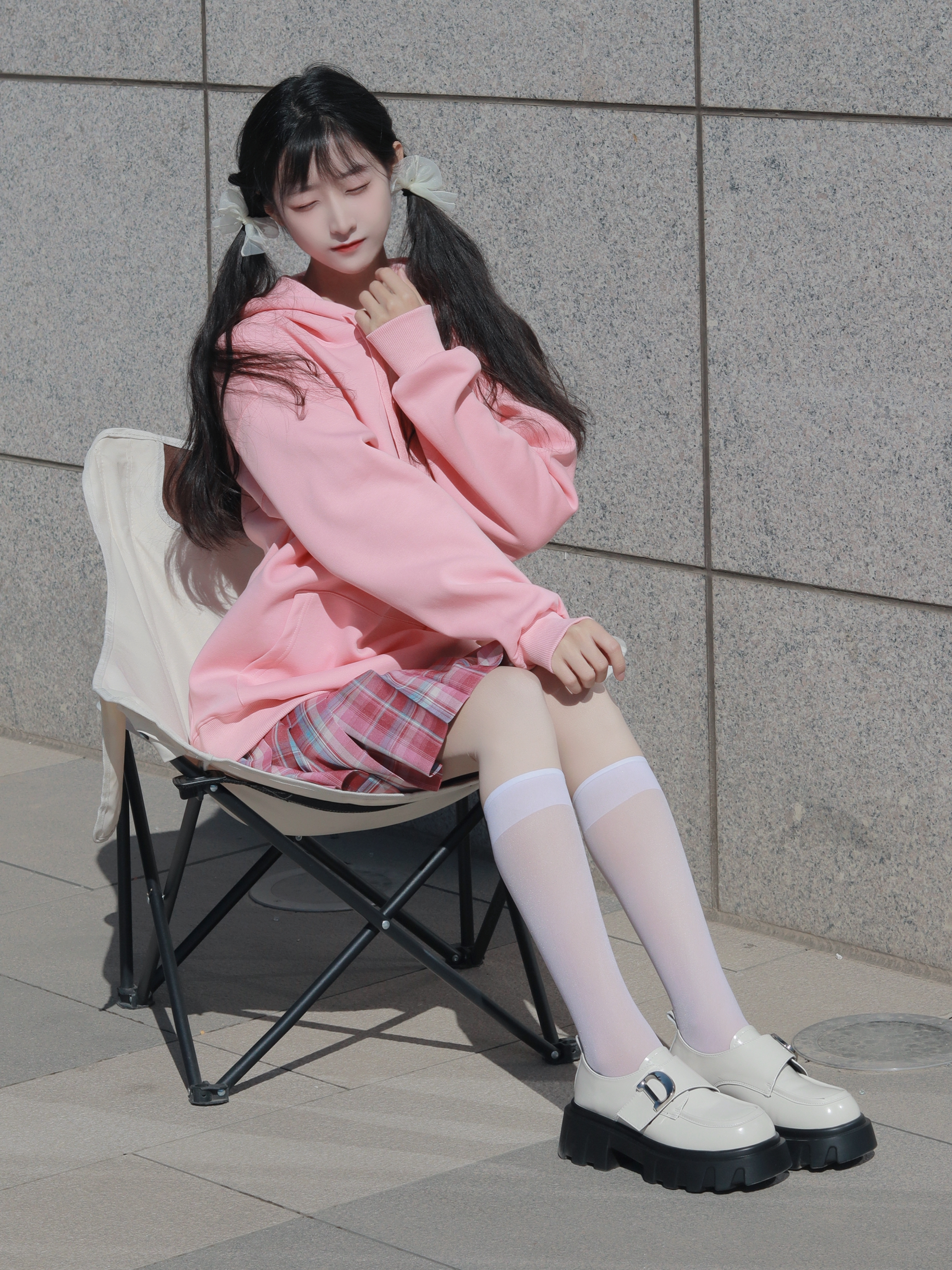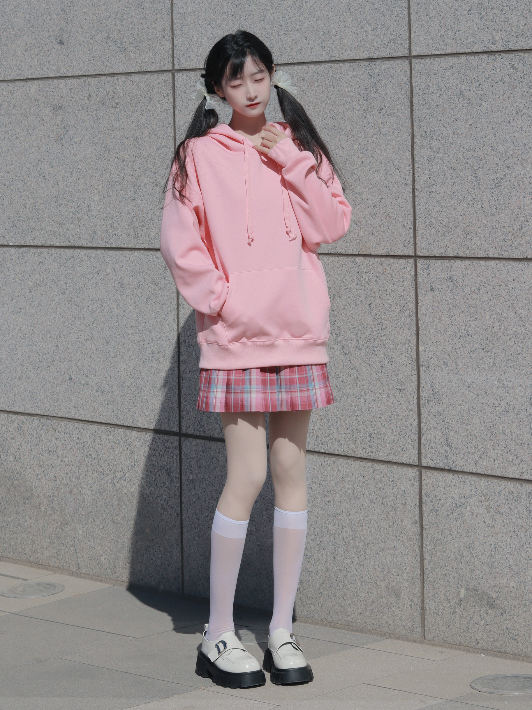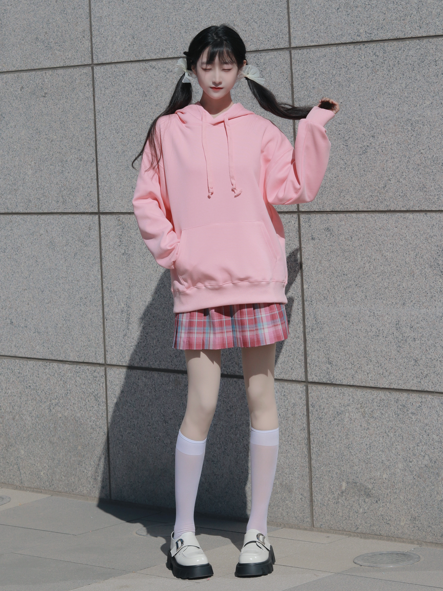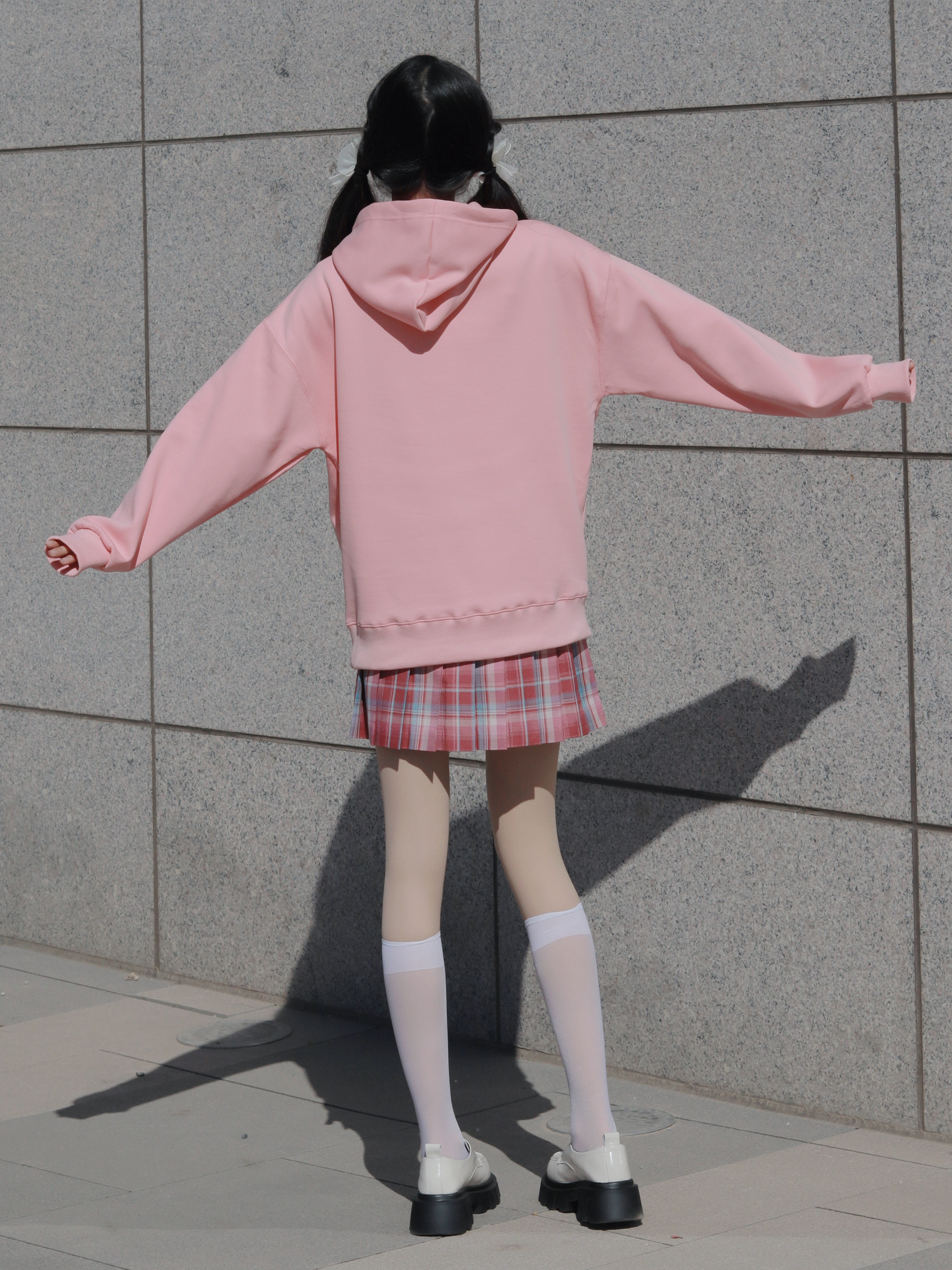 粉色卫衣宽松俏皮 搭配同色系格裙和中筒袜 减龄活泼又不失个性~