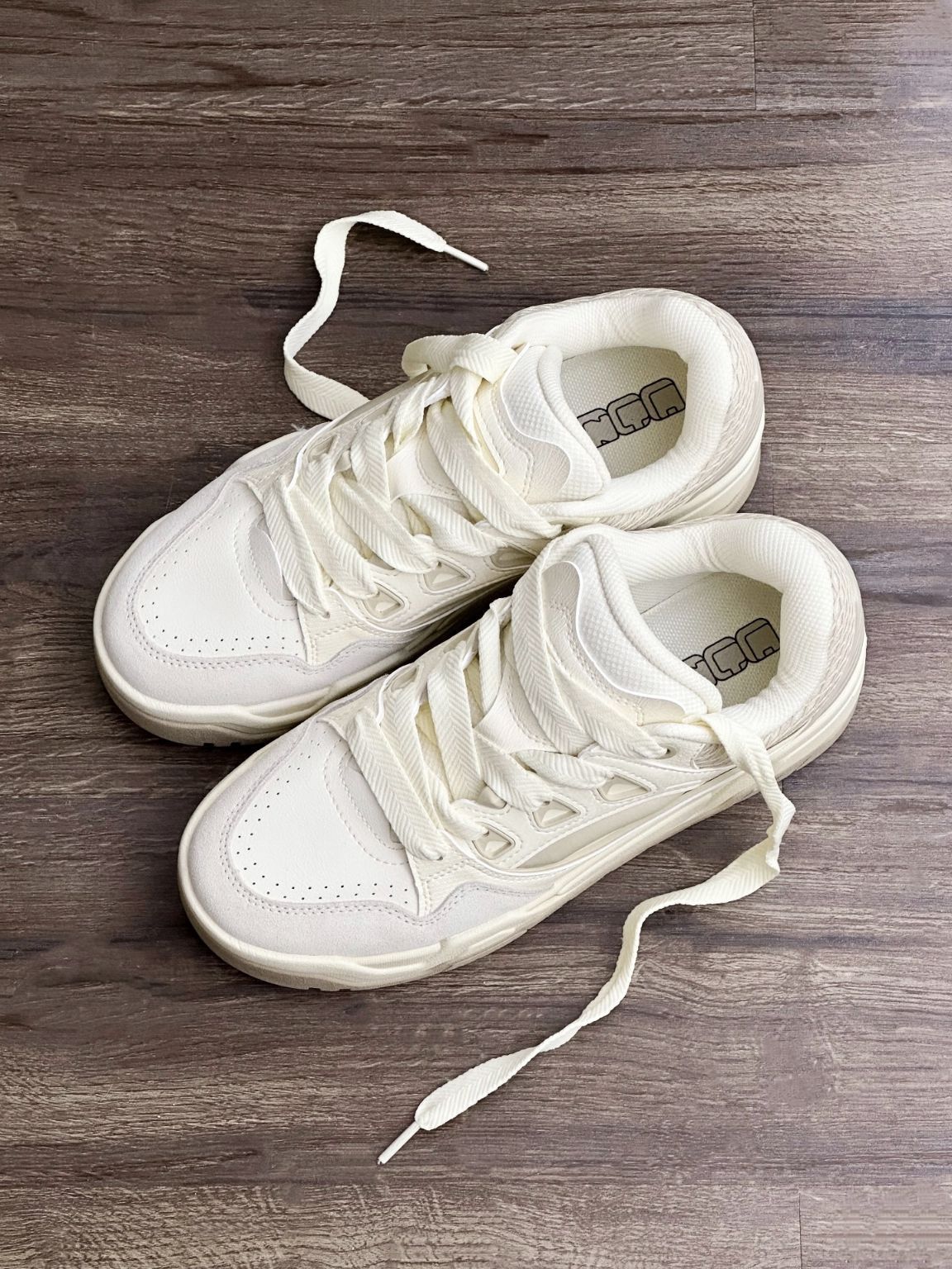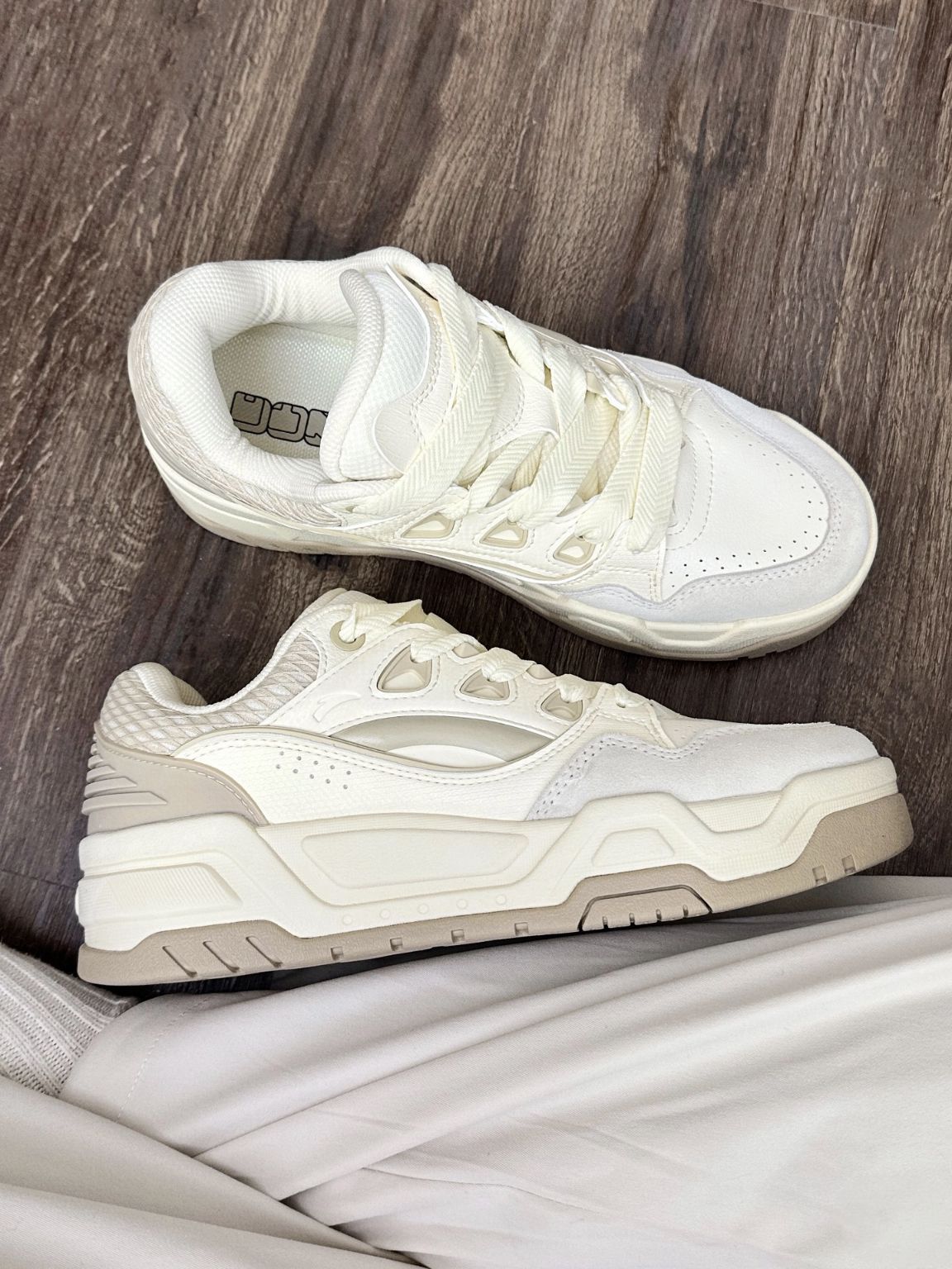 奶油色板鞋搭配嘎嘎好看 安踏微糖2颜值太在线了吧奶呼呼的配色软糯感好爱 穿上包裹性好好,粗鞋带复古感很足鞋面材质很好打理,秋冬穿都很适合的
