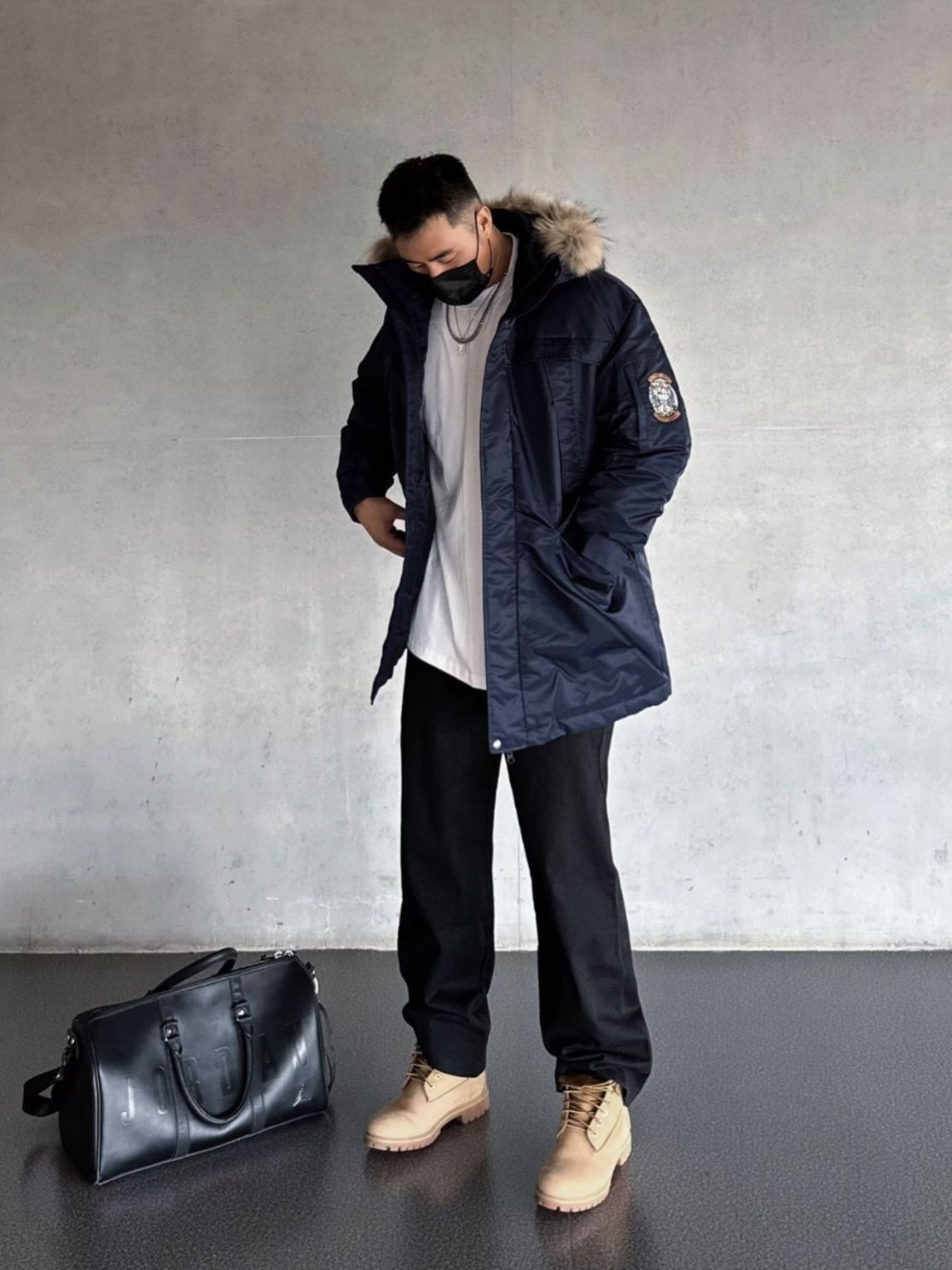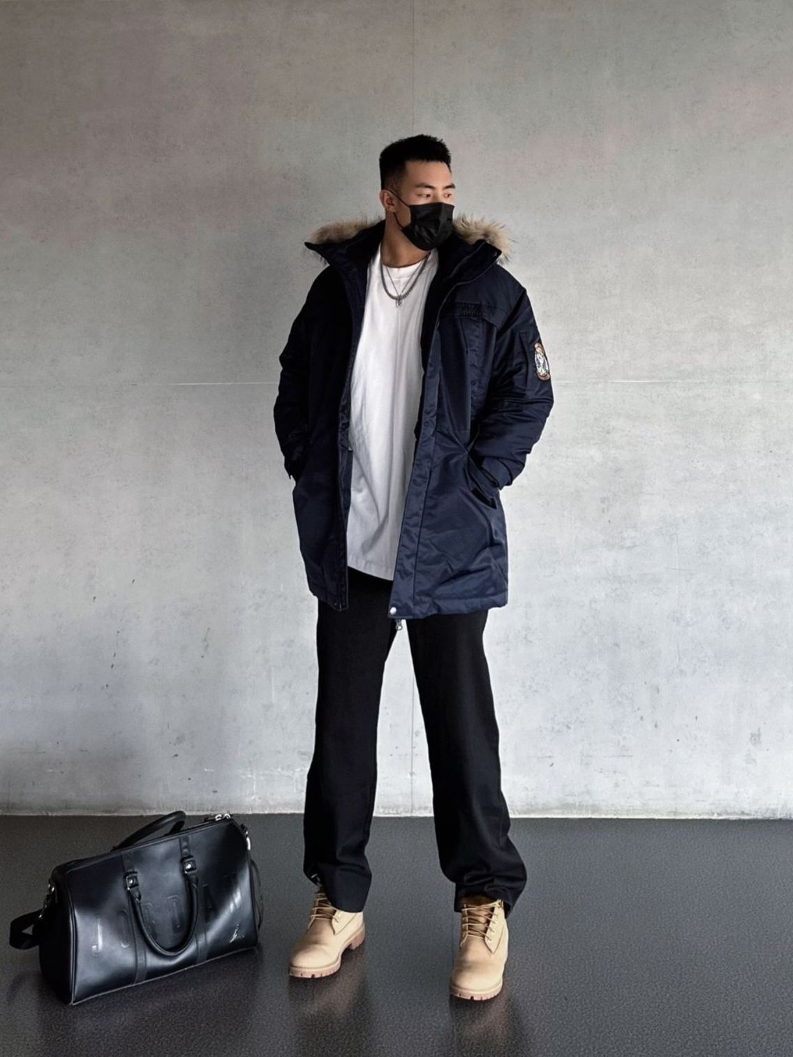 上身男装毛领工装羽绒服,中长款版型保暖性很ok 有志者uzis美式复古直简工装裤,洗水的工装帆布面料上身很挺括有质感 口袋处的同色刺绣简约不失设计感,整体宽松的版型对身材包容度很ok,运动穿也无压力 图源网络侵删
