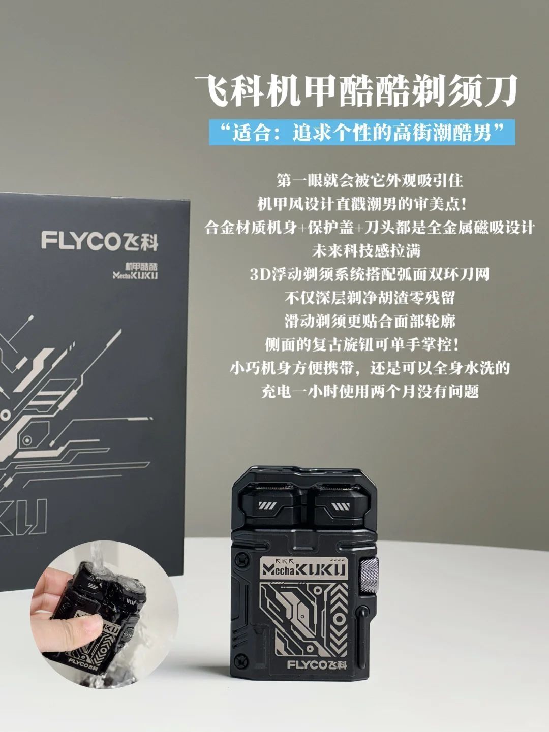 最近一段时间一直在苦恼马上情人节了我要送老公什么礼物 网上的礼物攻略都快被我翻了个遍,但还是没找到合适的。 后来有一天去朋友家吃饭,看到她家洗漱台上的飞科剃须刀 瞬间打开购物思路,这礼物又实用又贴心,而且颜值超高!! 直接回家的路上就下单了几款飞科家的 如果你最近也有送礼物的需求或者有需要更换剃须刀的话,刷到这篇你有福了! - ✅ 飞科机甲酷酷剃须刀——高街潮酷男 第一眼就会被它的外观吸引住, 机...