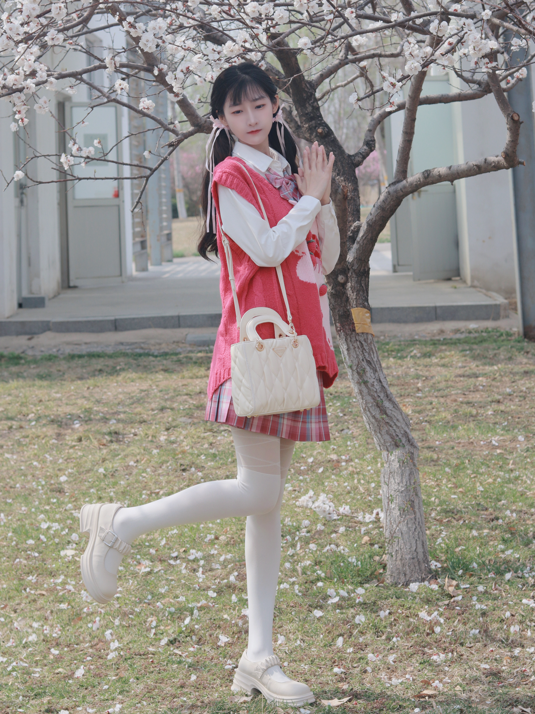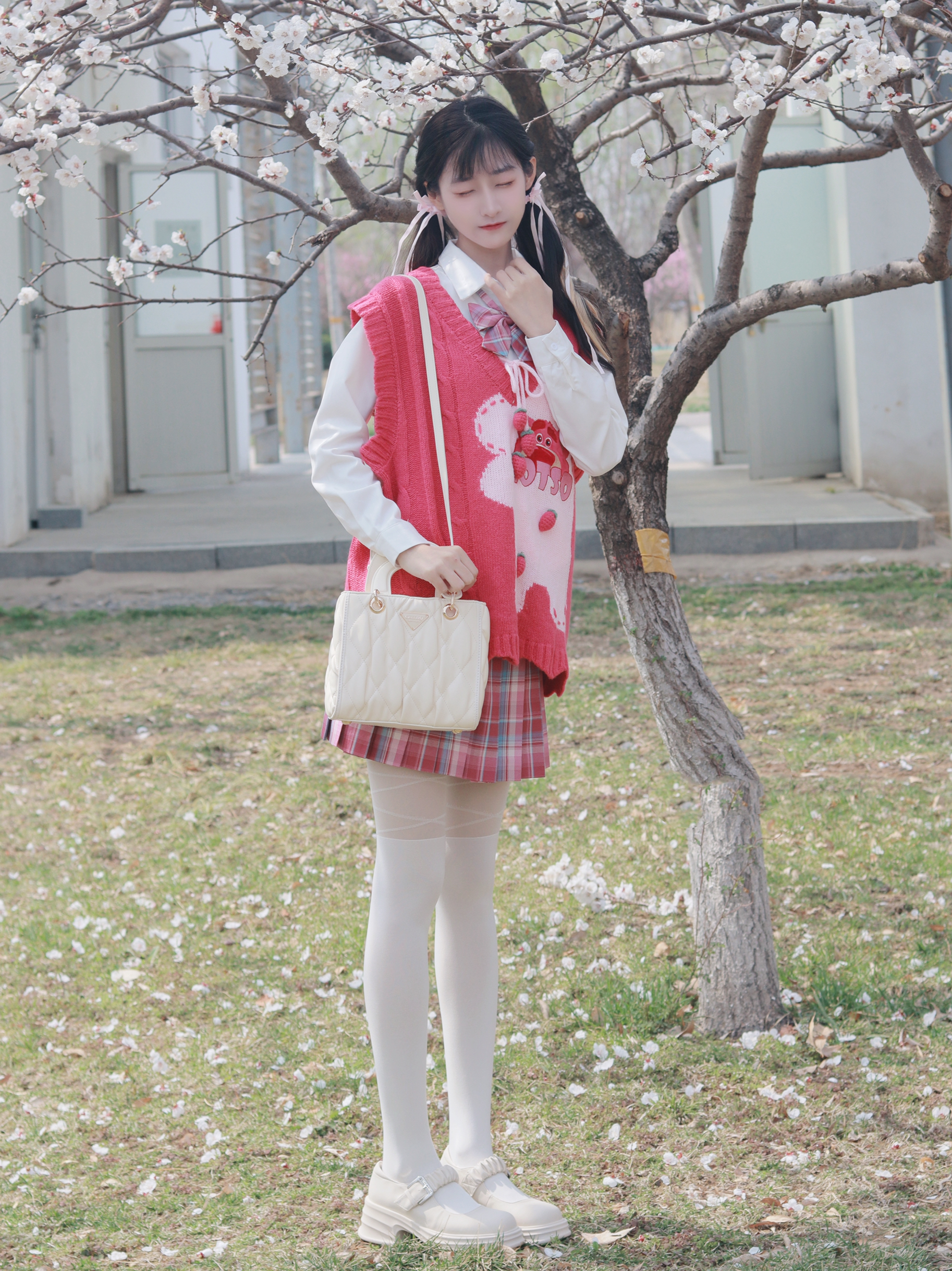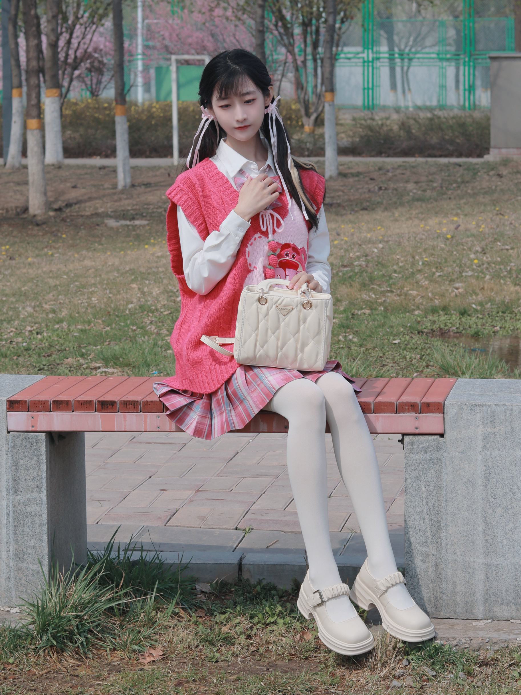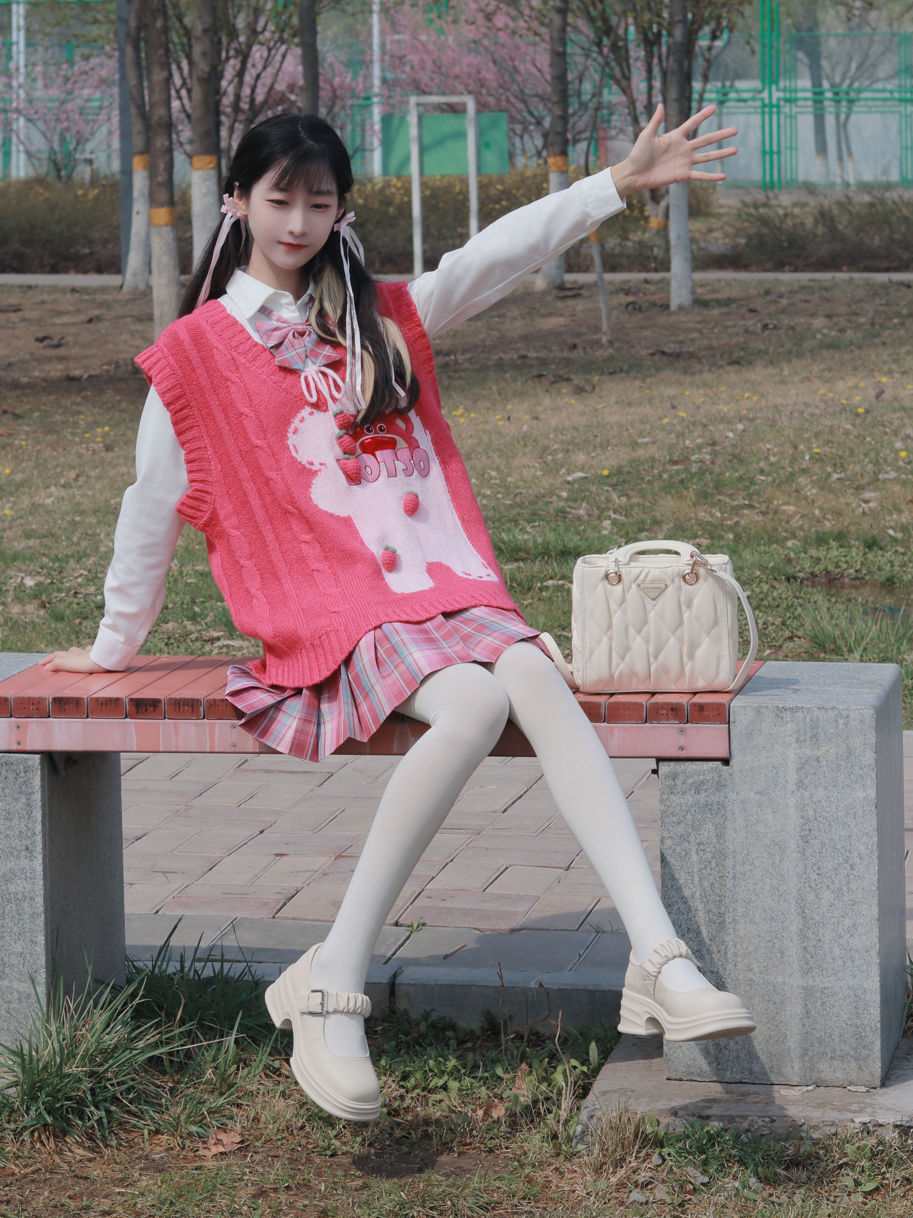 粉色毛衣马甲搭配白色衬衫 搭配粉色系格裙和斜挎包 减龄又俏皮活泼~