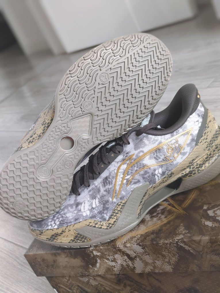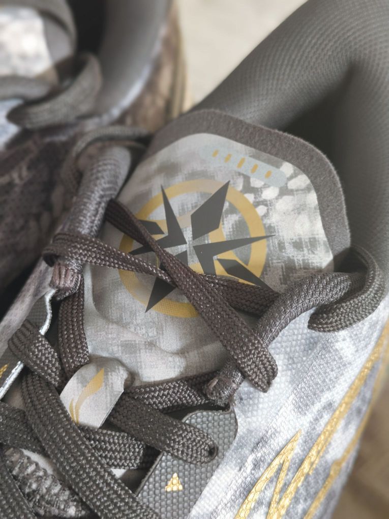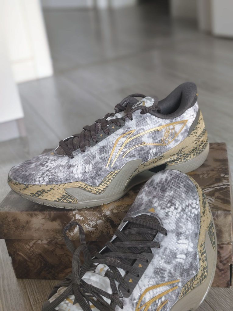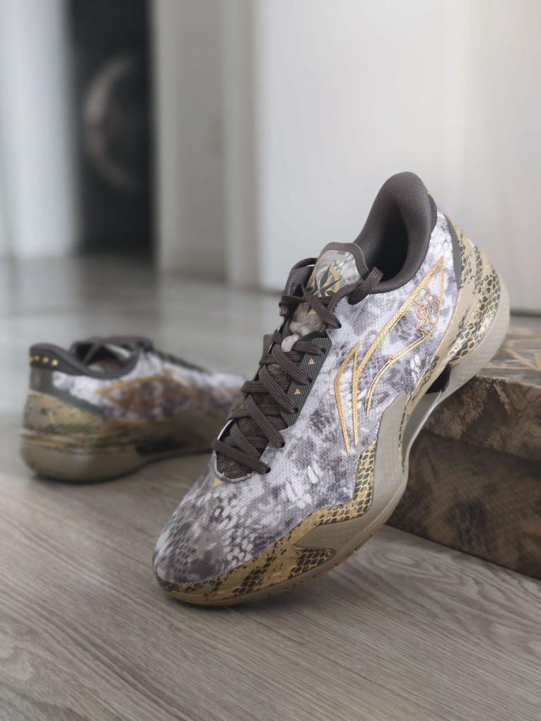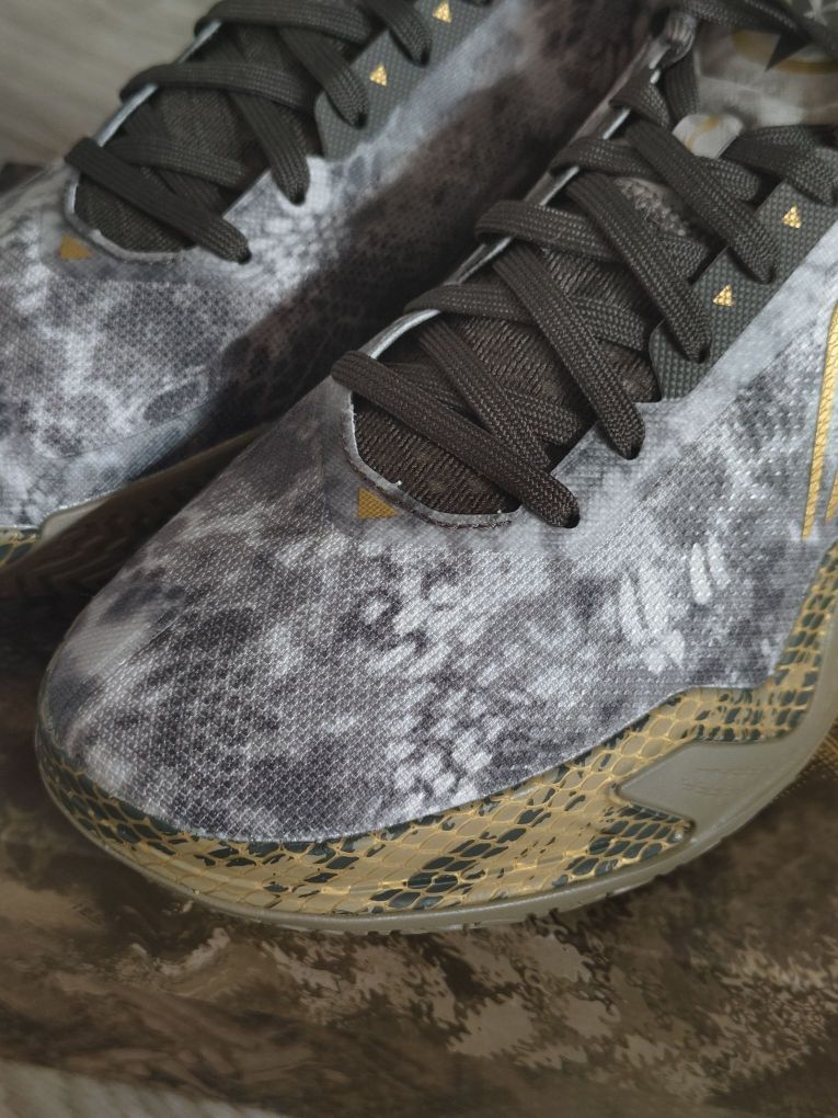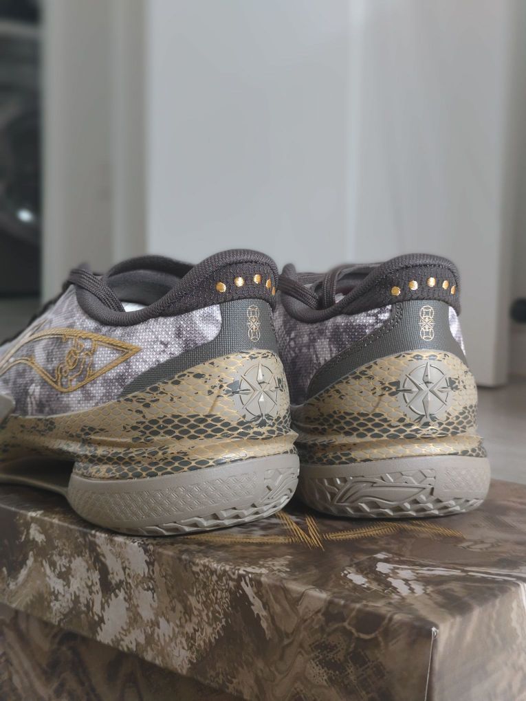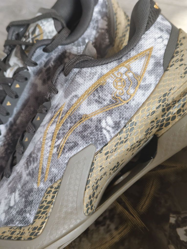 👟:利刃5 CNY蛇年限定 “金蛇如意” ✨灰褐色鞋身,鞋面材料和鞋侧TPU通过特殊工艺还原了蛇纹、蛇鳞肌理感,金色LOGO结合了如意图案,寓意着蛇年纳福、万事如意。后跟的双钱眼纹,也是寓意着富贵双全、眼前即富。非常有诚意的配色,全身都是细节。