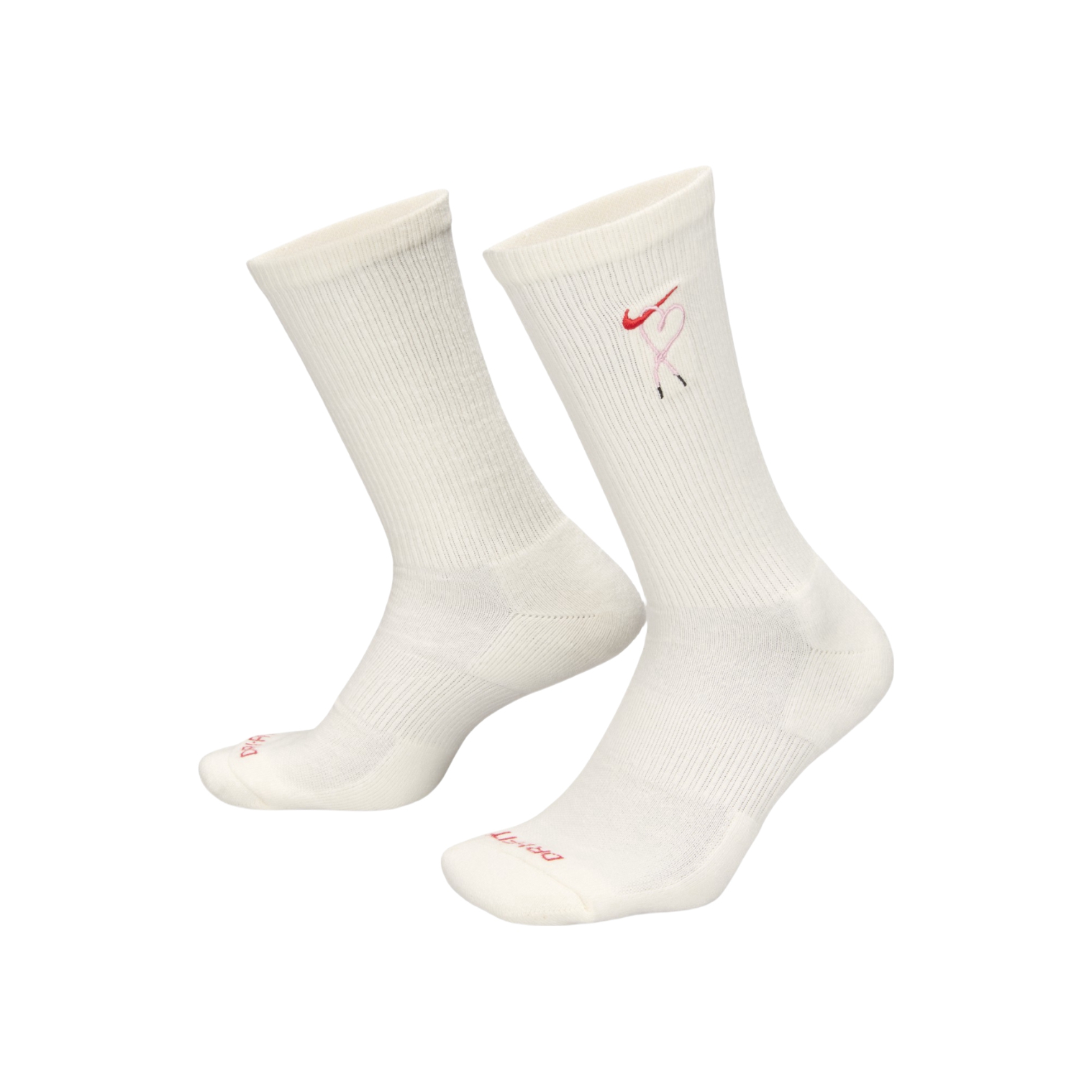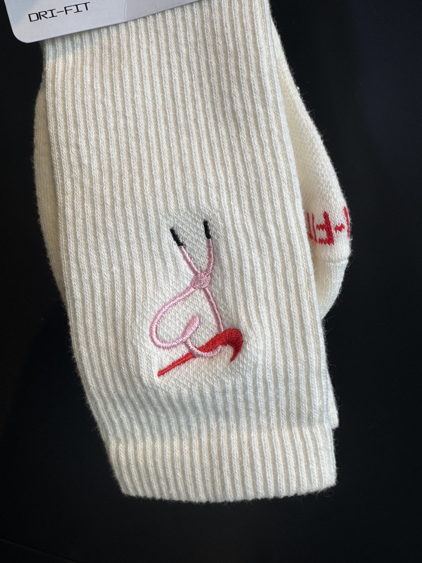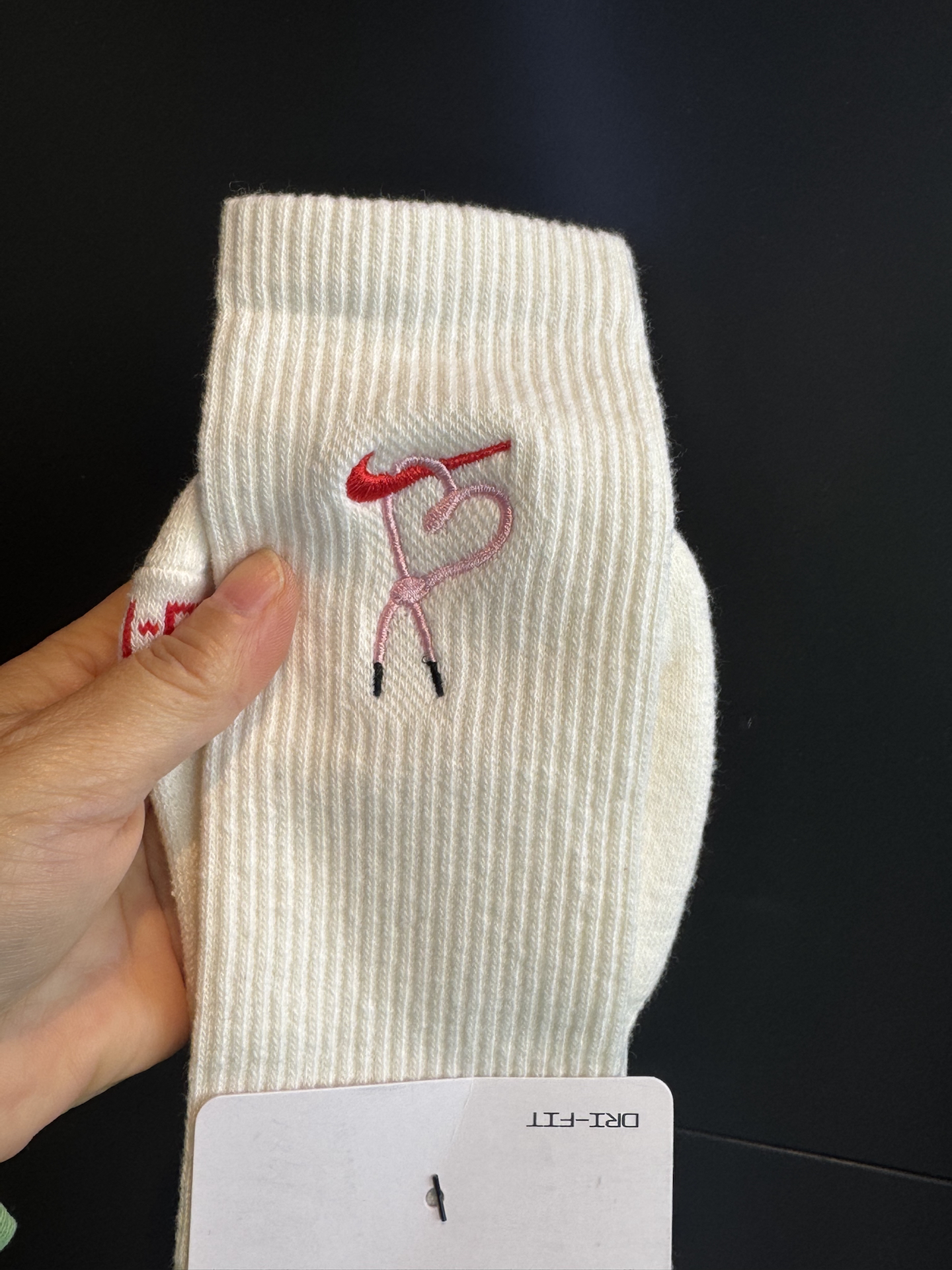 奶白色的袜身,质感满满,细腻的针织工艺,摸起来柔软又顺滑。最吸睛的还得是上面的刺绣图案,经典的耐克 logo 与别致的心形及线条元素相融合,红色与粉色的搭配,甜美又不失时尚感,设计感直接拉满。 💓上脚舒适度一流,袜子的弹性恰到好处,不会勒脚,而且透气性很棒,长时间穿着也不会觉得闷。高筒款式不仅能修饰腿部线条,还为整体造型增添了亮点,无论是搭配运动鞋打造活力运动风,还是配小皮鞋营造甜酷感,都毫无压力...