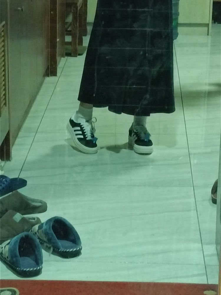 阿迪达斯gazalle穿上脚挺好看的。 就是这个鞋子的鞋舌好难受啊,很顶脚脖子。比正常的鞋舌会长出一到二厘米吧,不介意的可以拍。(我已经买了个防磨贴😓😓) 搭配衣服什么的还是挺好看的。 也挺增高的。小个子福音啦!