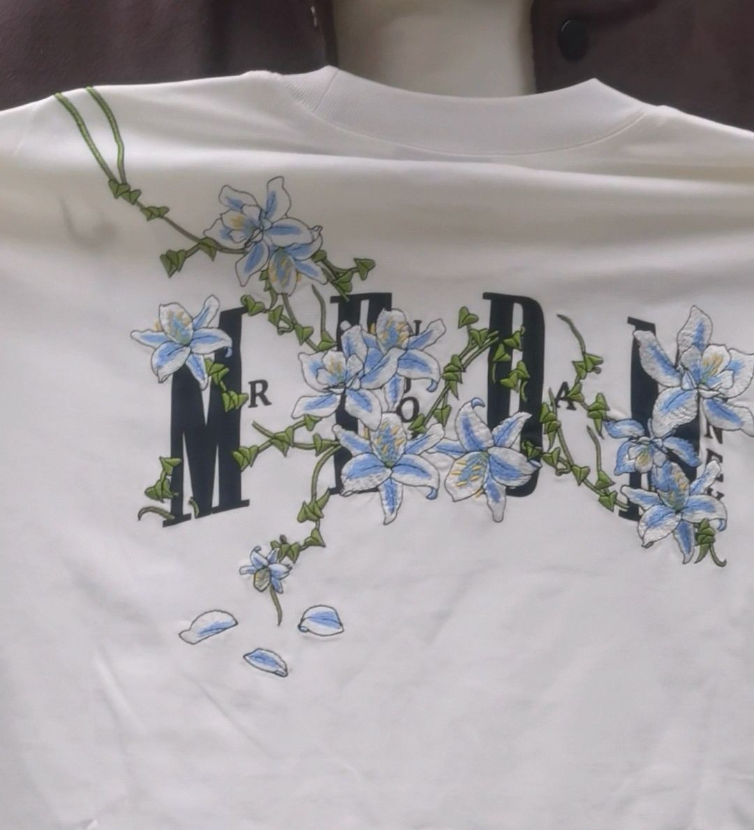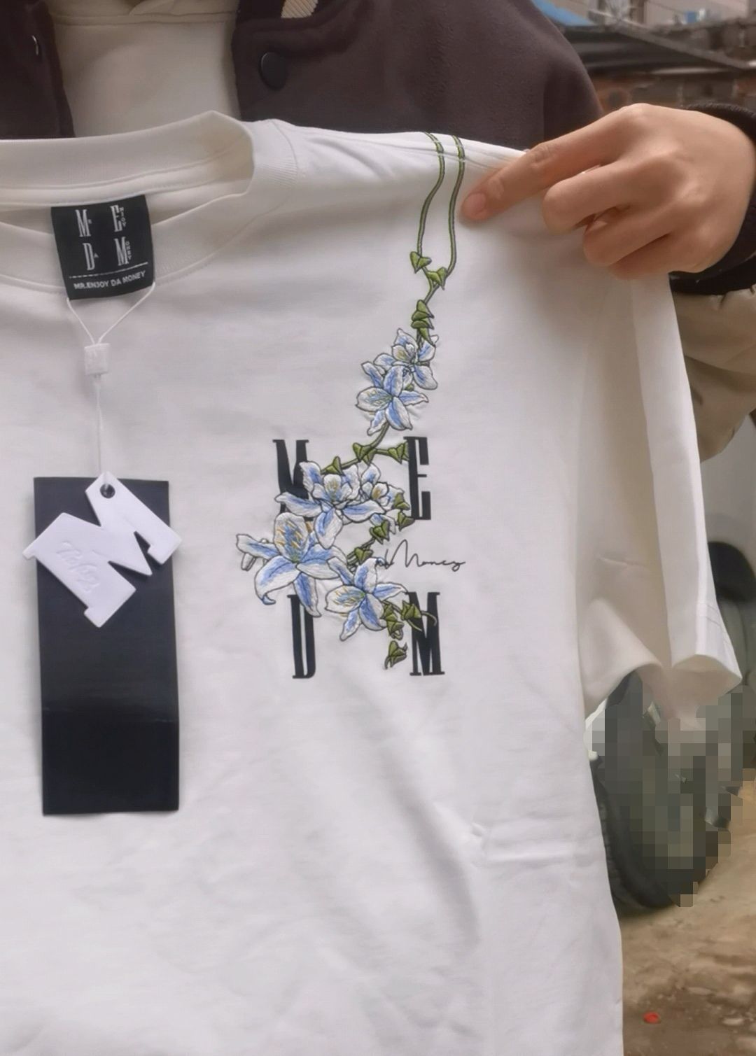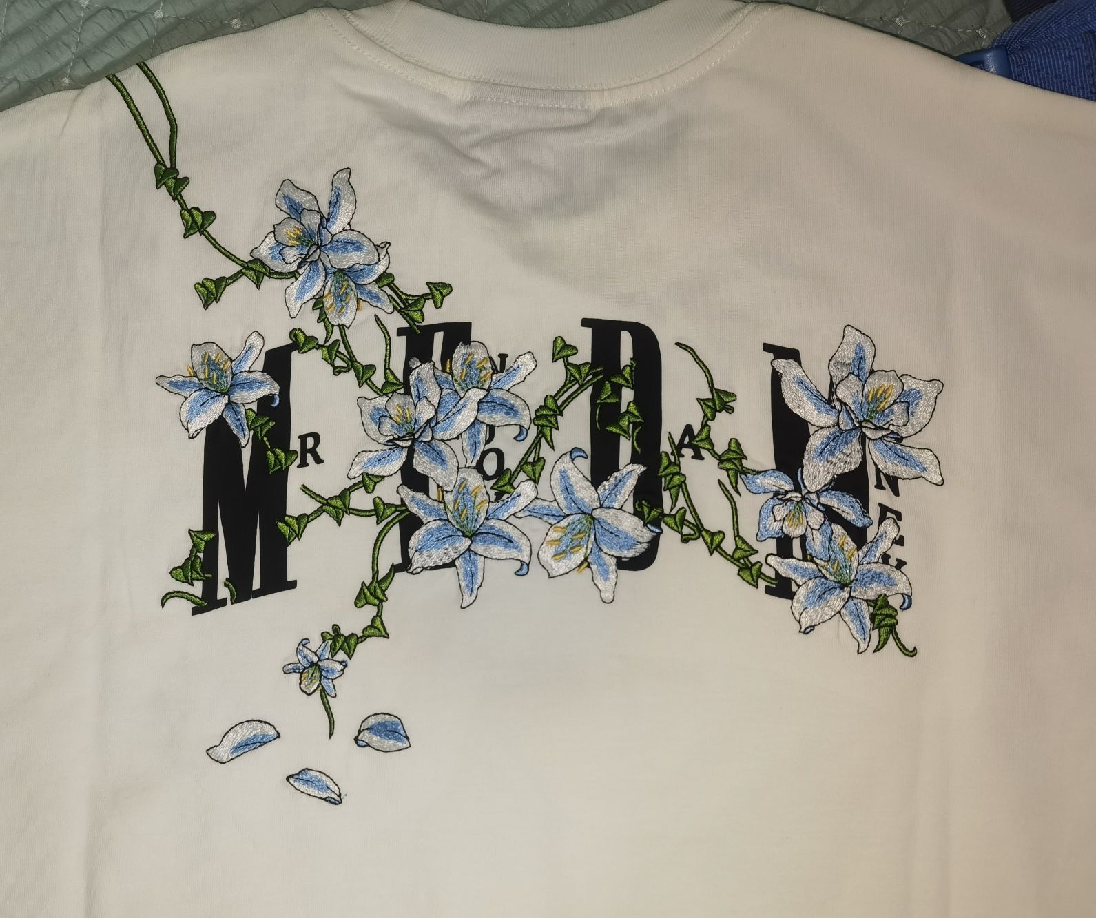 ✰MEDM藤蔓花卉短袖✨白蓝配色🧊️(M码) ☞正反面图案分两层并叠加✌🏻 第一层MEDM字母是印花(质感很好👌🏿P1-2) 第二层藤蔓花卉是刺绣(质感很好👌🏻P1-2) ☞在正常光线下无色差✔️ (P3-4) ☞百分百纯棉🐑(P5) ✨此款为宽松型需量好自身尺寸购买 ✨ ☞注:实物比图片还要惊艳🥹