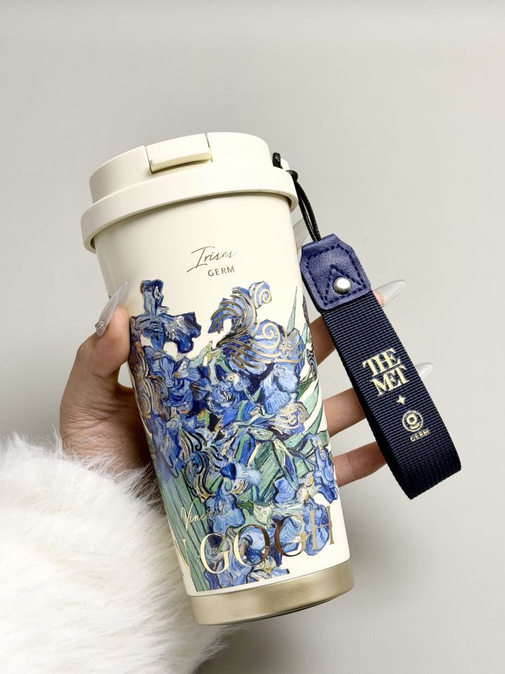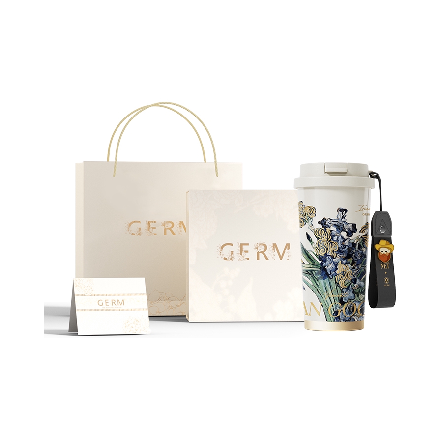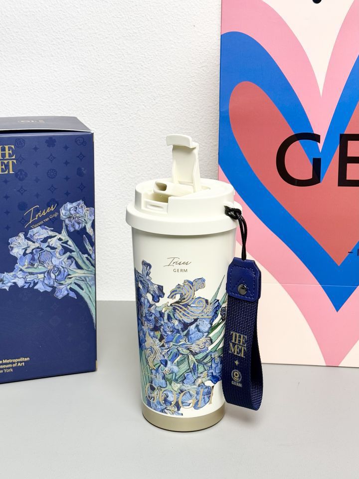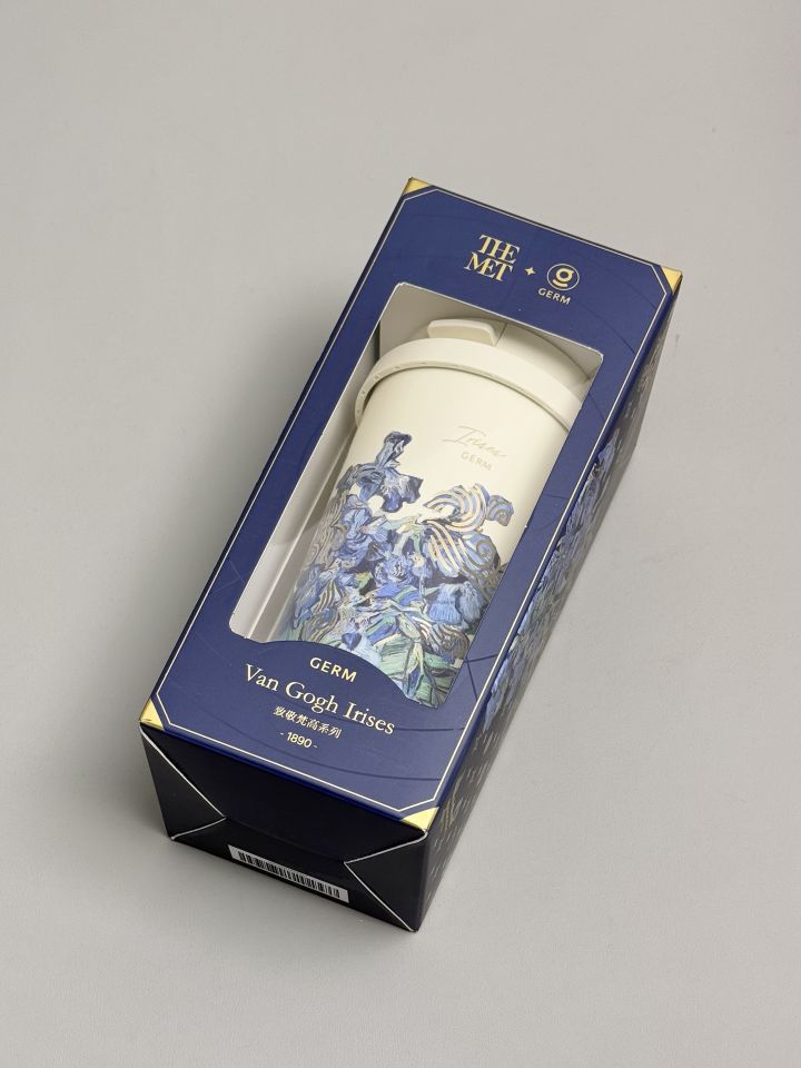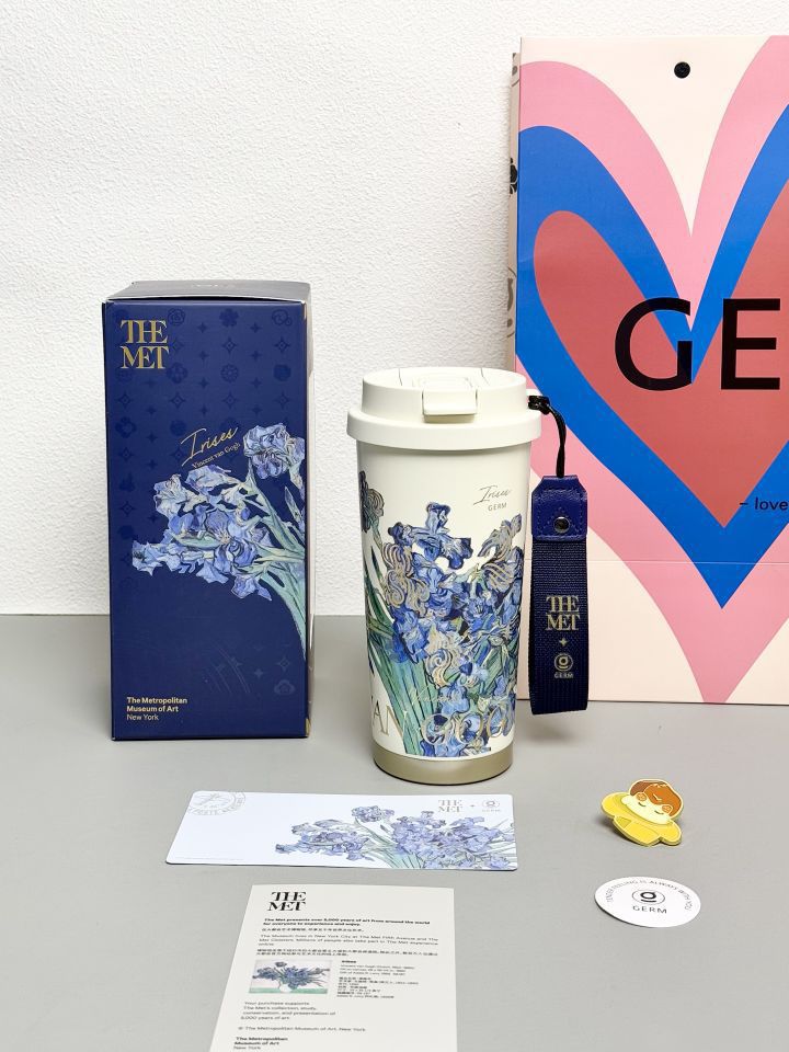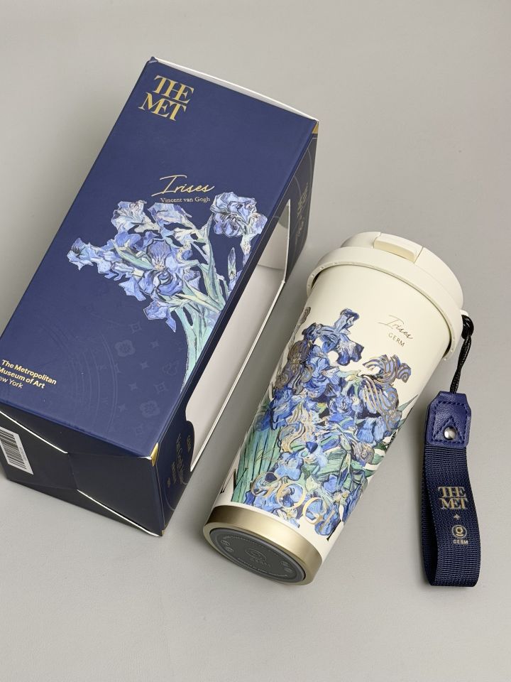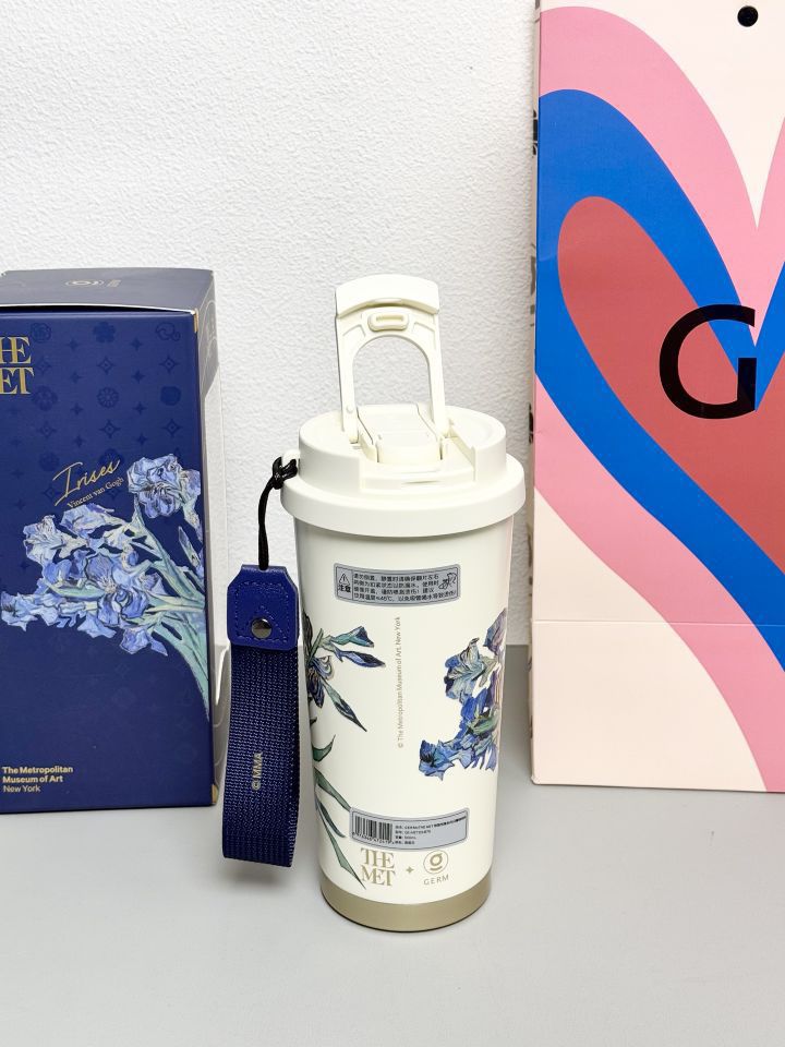 就是介个Germ 和大都会博物馆的联名保温杯呀! 大礼盒包装尊的仪式感满满 梵高的鸢尾油画吼吼看! 摸起来也是hin有质感滴 500ml大容量我出门喝水完全够了 可以直饮也可以吸管 好看的杯子尊的会让我多喝水呀~ 还赠送了同款油画系列明信片和胸针 礼盒礼袋包装拿来送人确实有排面~