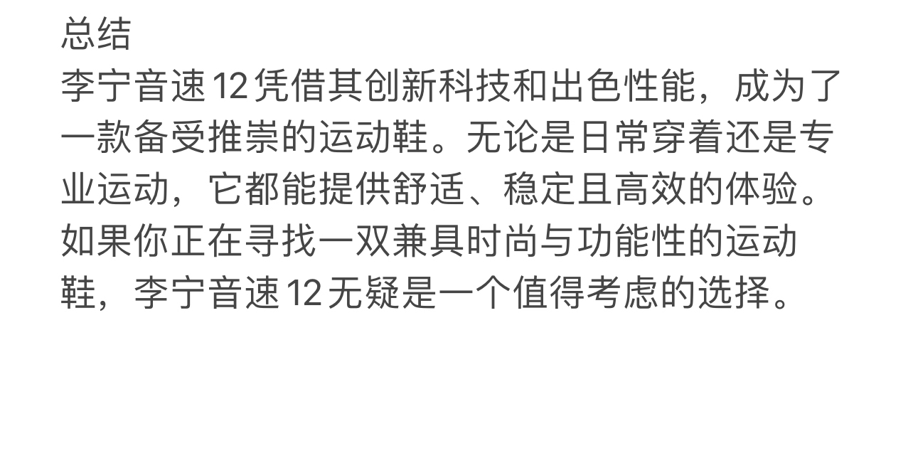 1. 外观设计 时尚感:李宁音速12采用了简约而现代的设计风格,鞋身线条流畅,配色方案多样,能够满足不同消费者的审美需求。 品牌元素:融入了李宁品牌的标志性设计元素,如“䨻”科技标识,彰显品牌特色的同时也提升了产品的辨识度。 2. 舒适性 缓震性能:搭载了李宁自主研发的“䨻”轻量级缓震科技,能够有效吸收运动中的冲击力,提供柔软舒适的脚感。 包裹性:鞋面采用高密度网布材质...