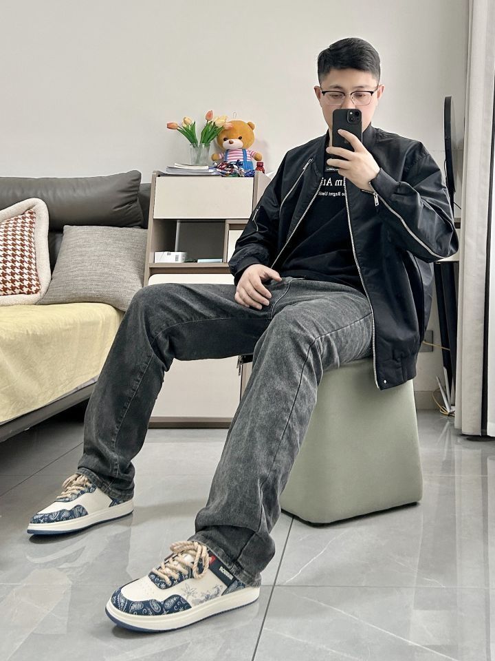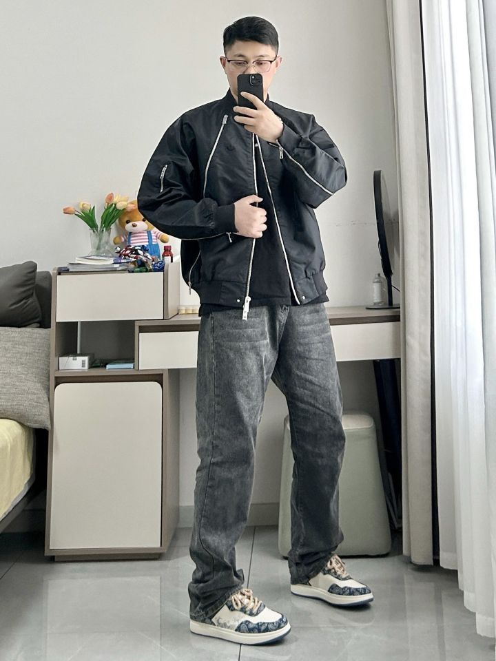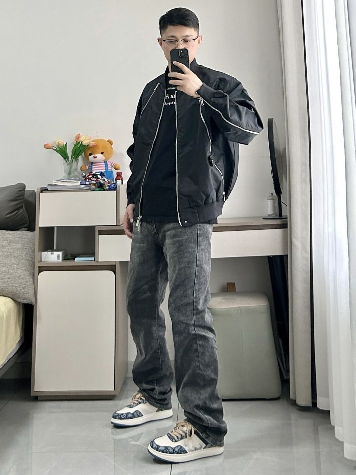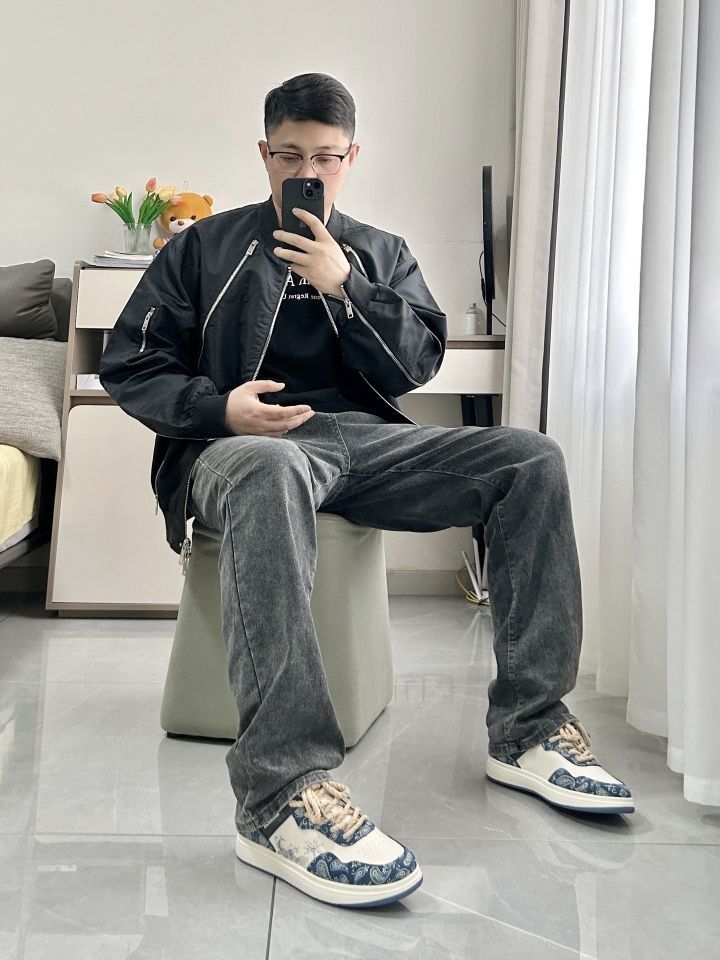 黑灰色上身简约好看 一件阿迪达斯三叶草夹克外套 机能感宽松舒适,酷感个性 搭一条灰色直筒牛仔裤 鞋子是 Warrior/回力 潮流厚底低帮板鞋 水墨画蓝色鞋面,质感很好,酷感个性 鞋子上脚很好看,简约休闲运动