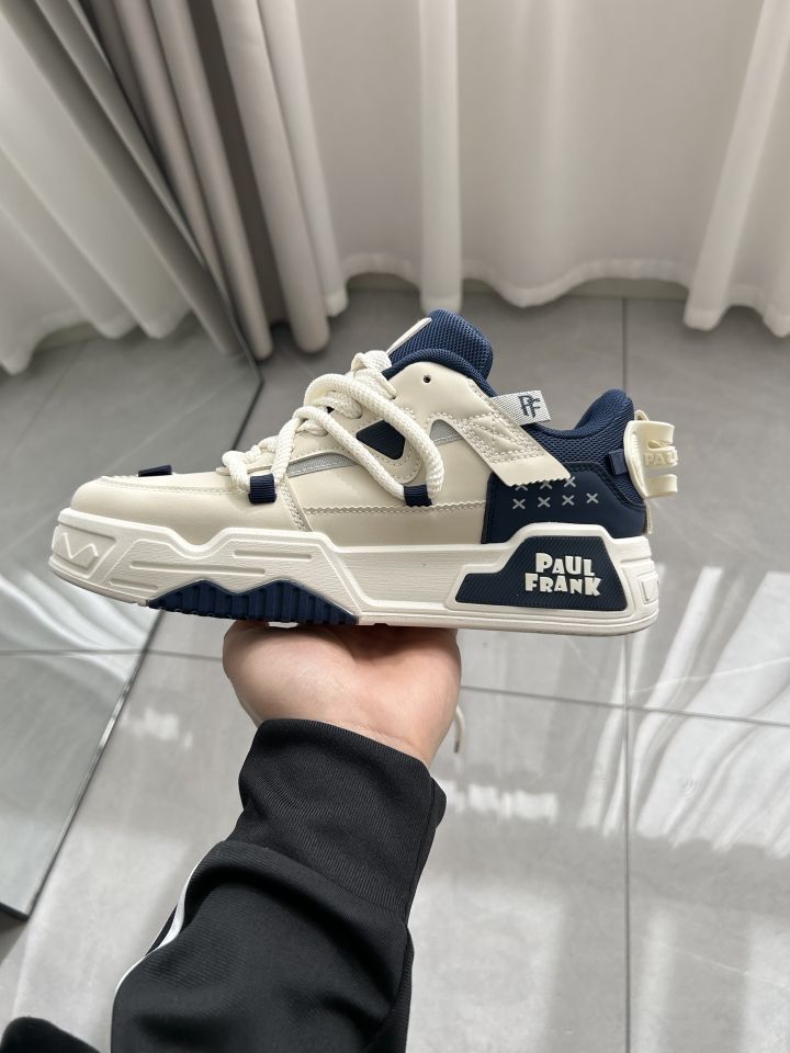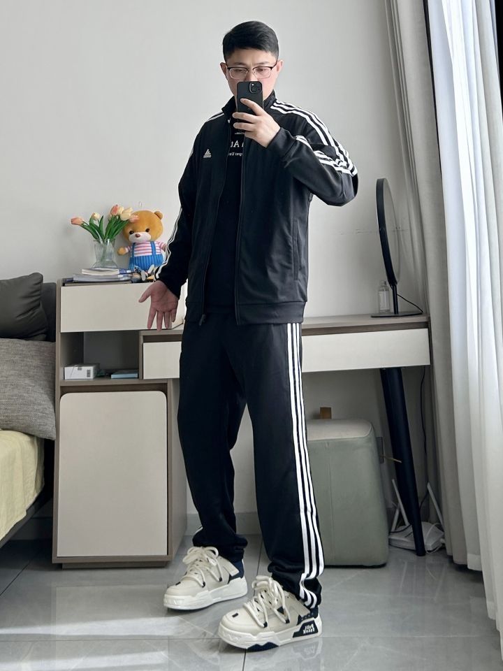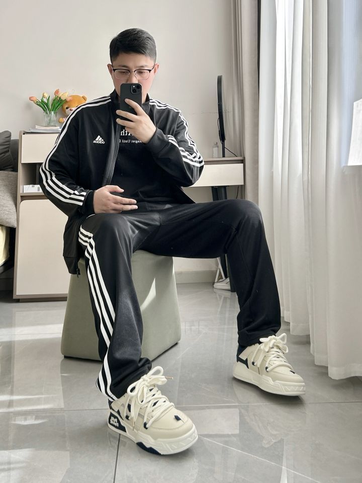 今天穿一件阿迪达斯三条纹夹克外套 裤子搭一条阿迪三条纹垂感直筒运动裤 鞋子是 paulfrank 大嘴猴厚底低帮休闲板鞋 白蓝配色上脚清新好看 内里柔软,脚感舒适,简约休闲运动 防滑耐磨厚底显高