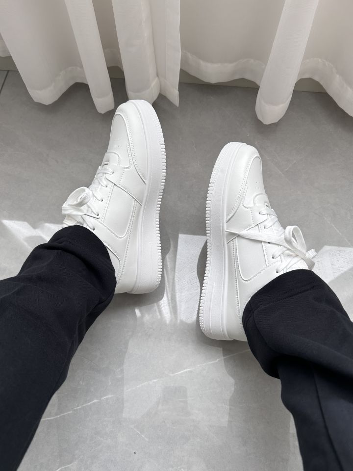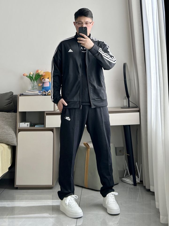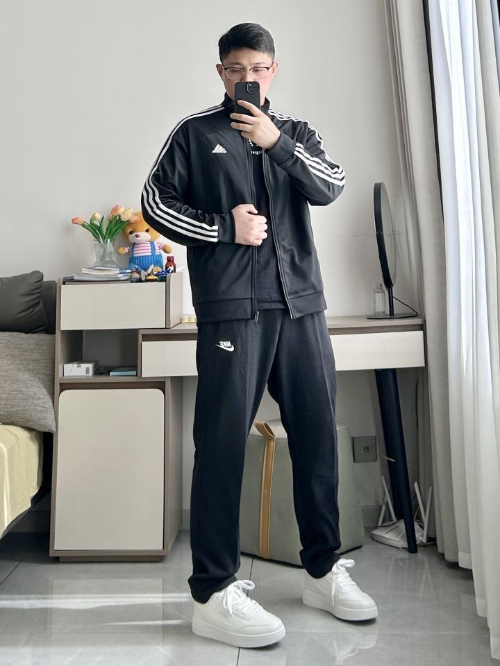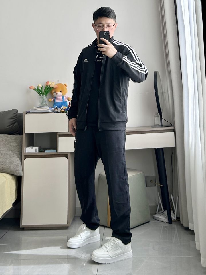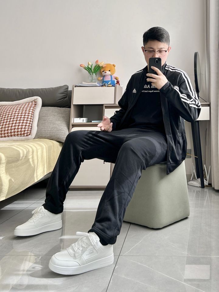 一件阿迪达斯三条纹夹克外套 宽松舒适,上身很好看 搭一条耐克宽松直筒裤 酷酷的很个性 鞋子是 FOXER 空军一号厚底低帮板鞋小白鞋 白色皮革鞋面,质感很好 内里柔软,脚感舒适 厚底显高,简约休闲运动 情人节穿这双很合适