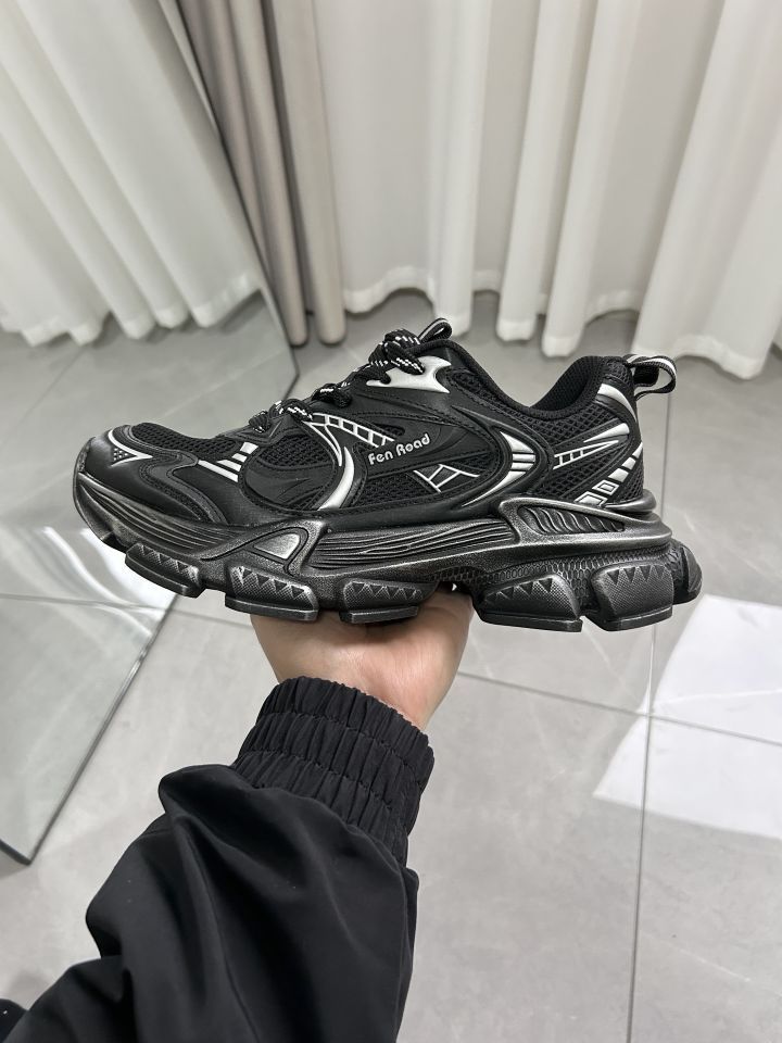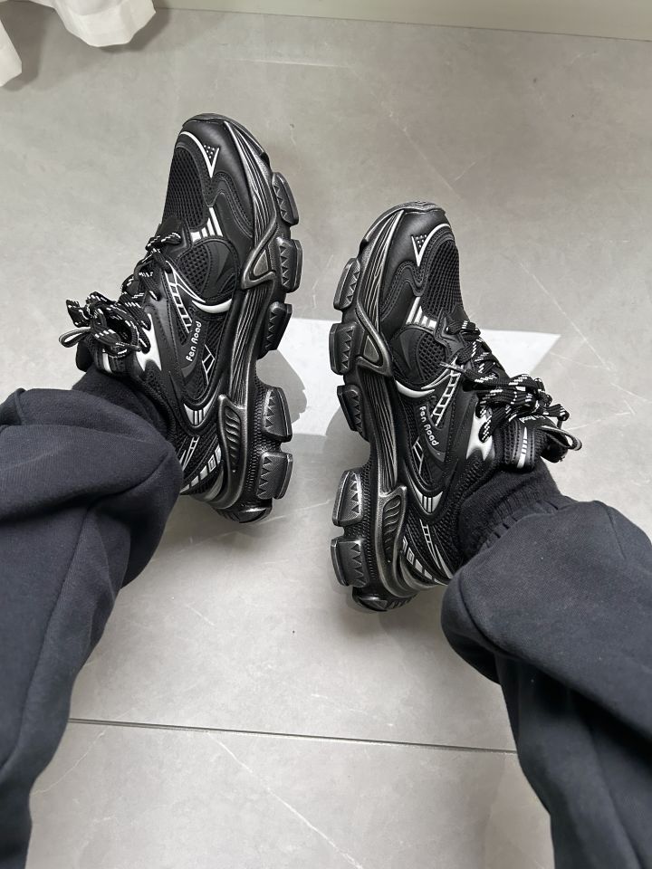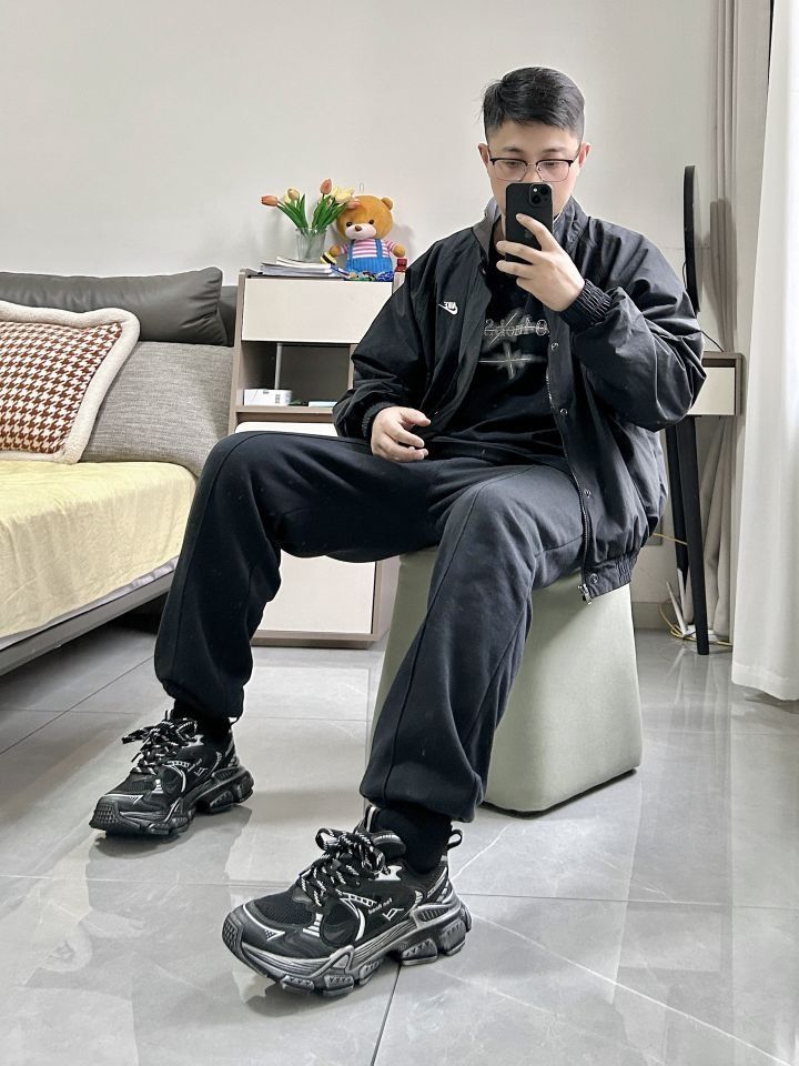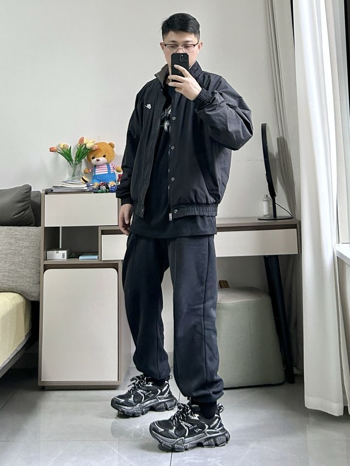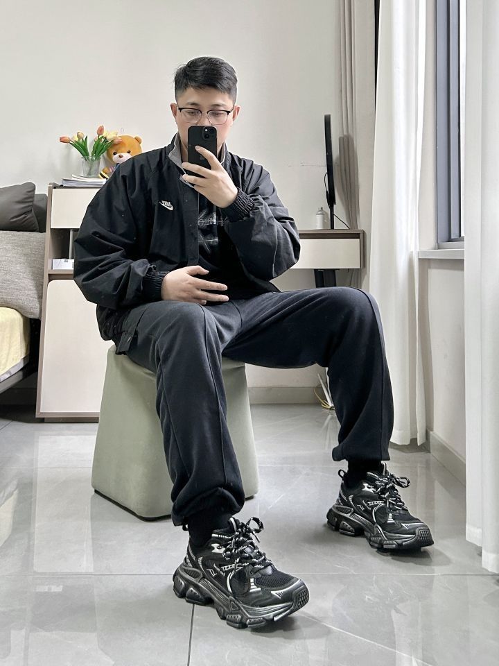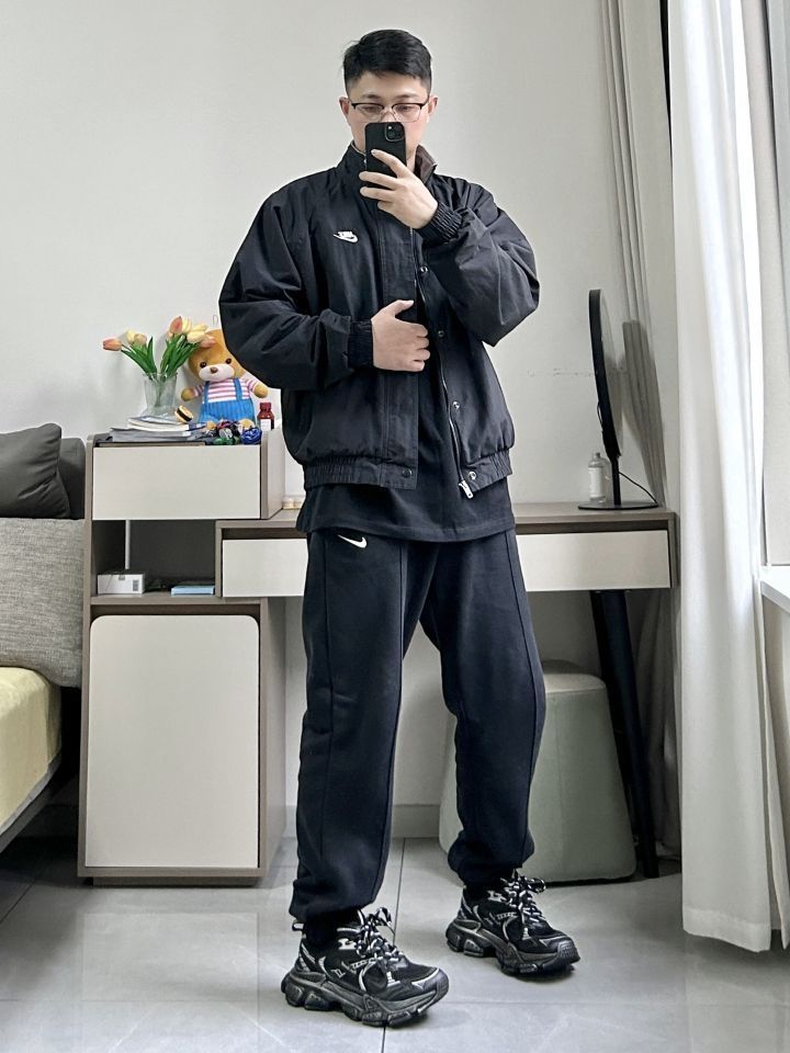 男生一身黑真酷 一件黑色耐克立领夹克 宽松舒适,酷酷的 搭一条耐克黑色束脚运动裤 鞋子是 奋路 黑武士轻机甲厚底增高老爹鞋 黑色鞋面搭配亮银色,酷感个性,很有质感 厚底显高,轻盈舒适,简约休闲运动