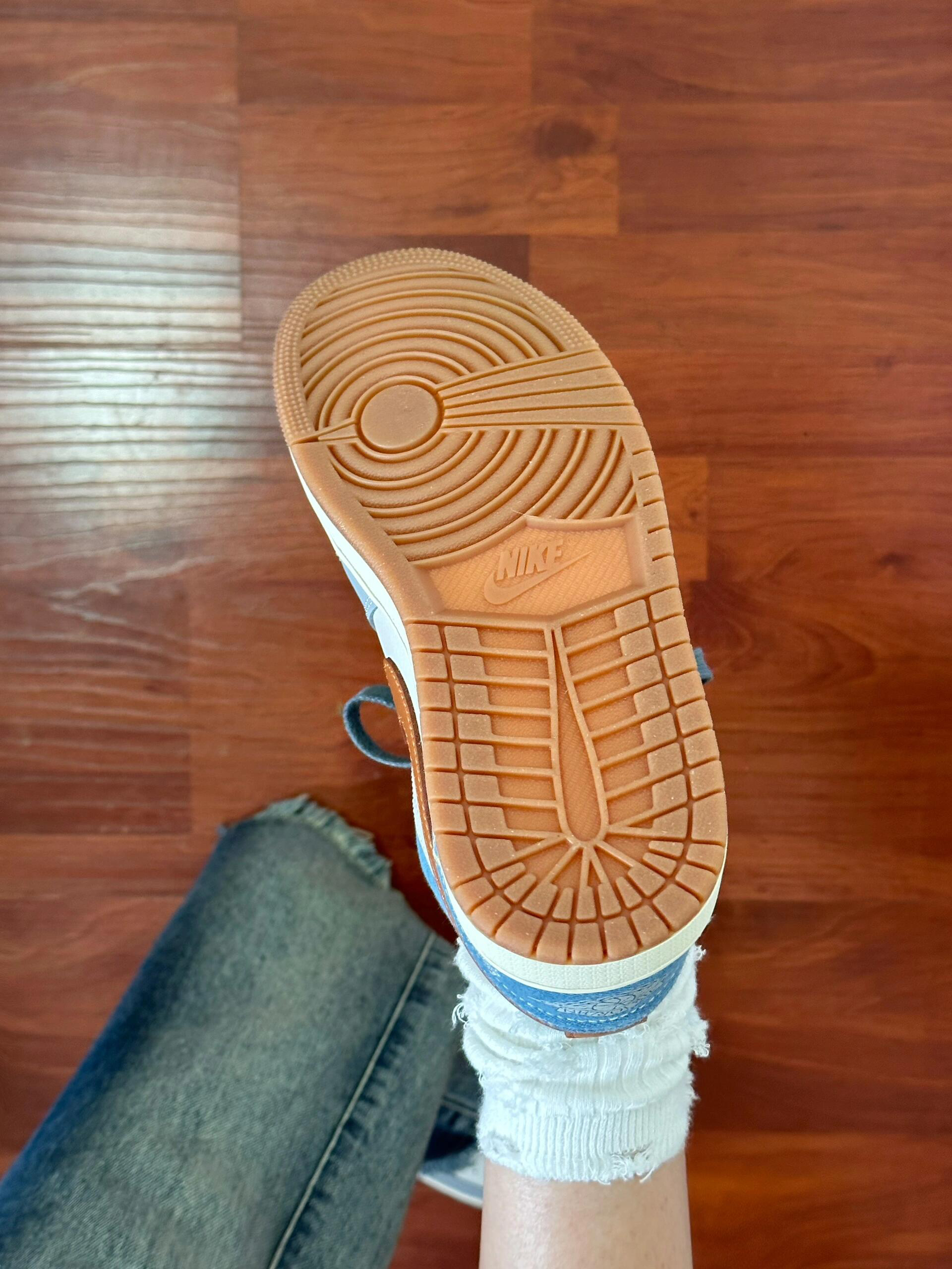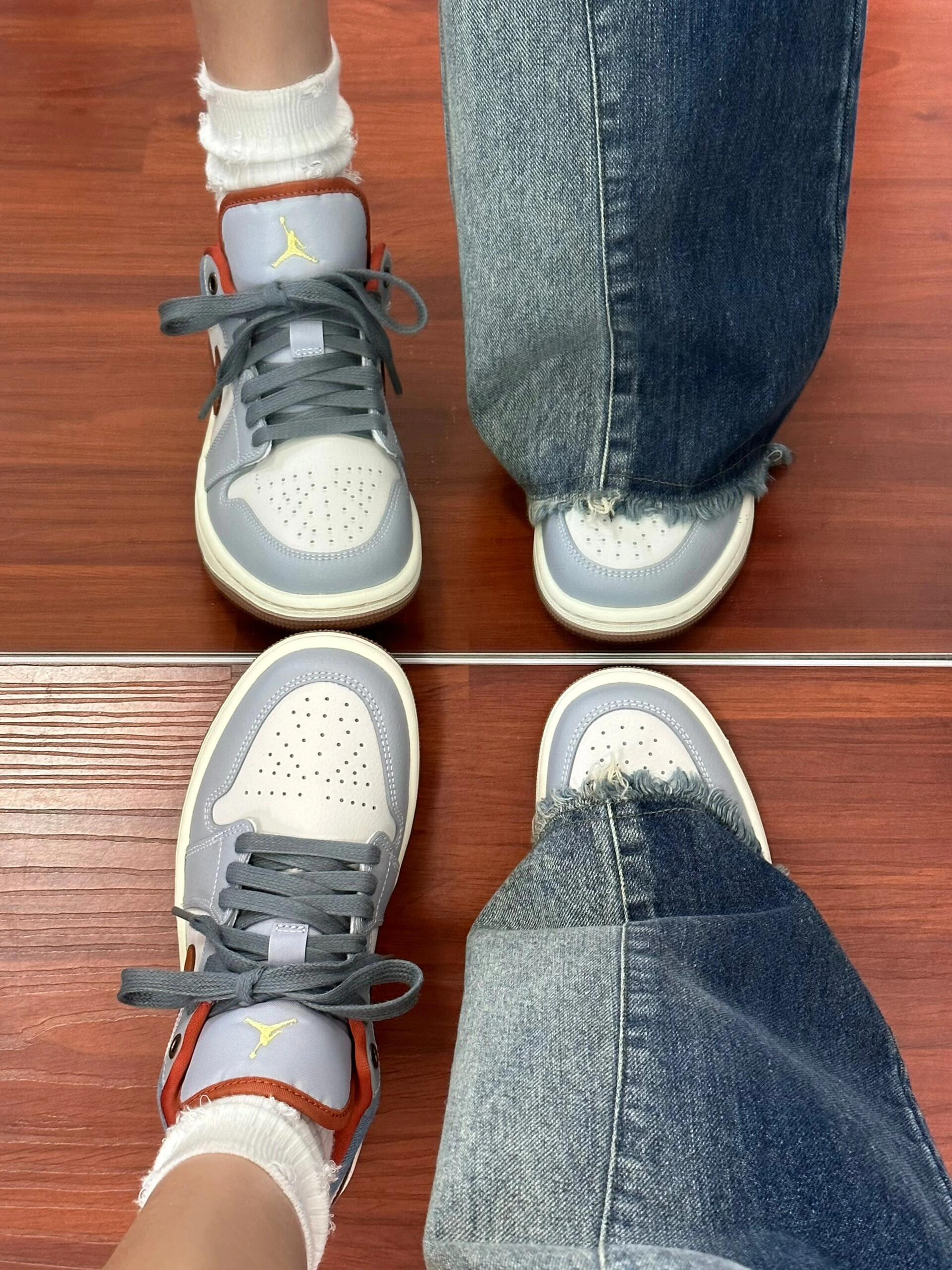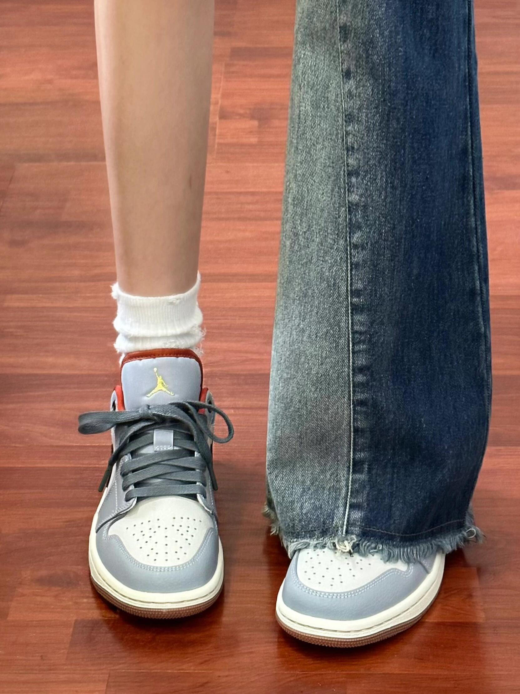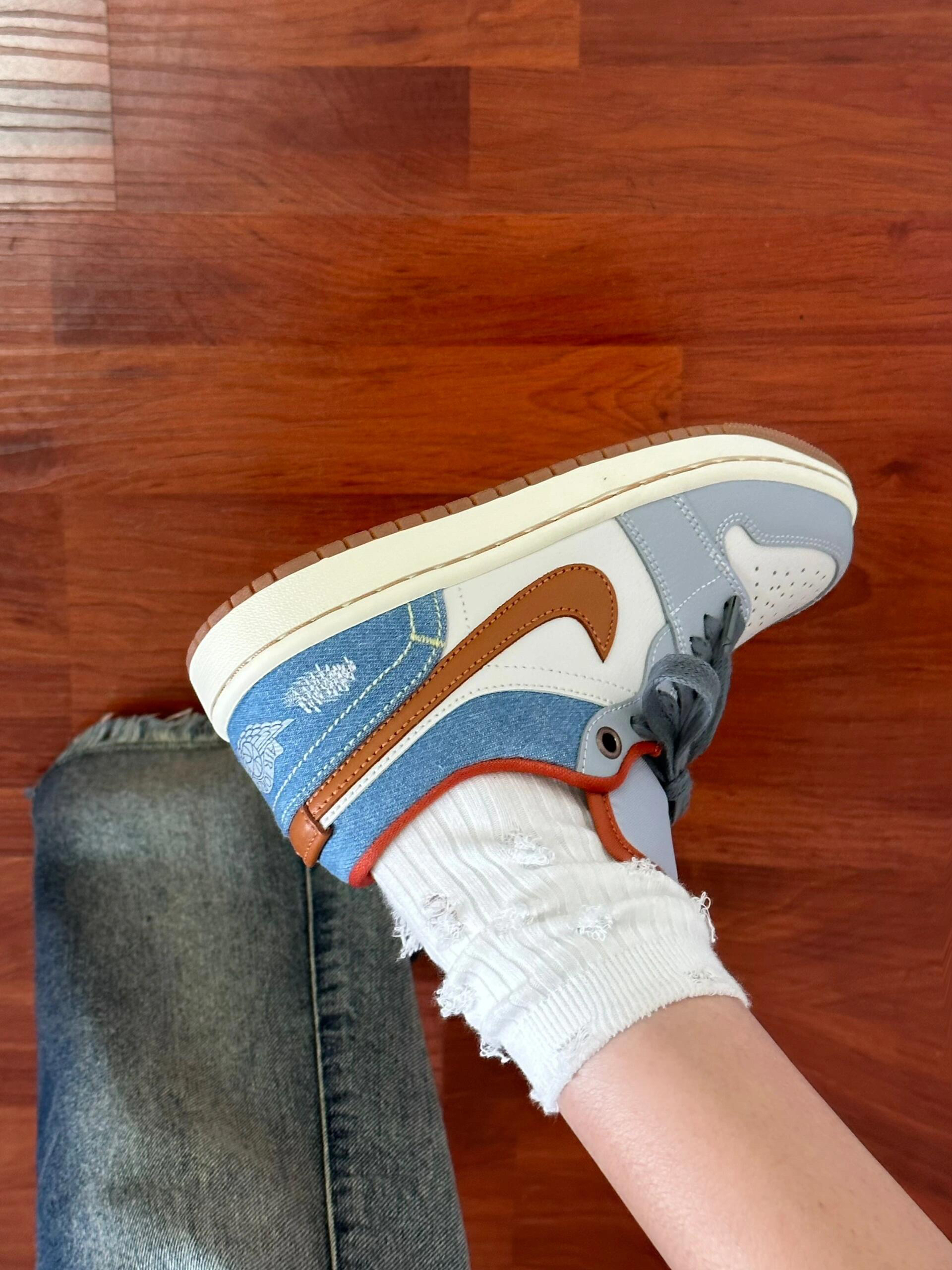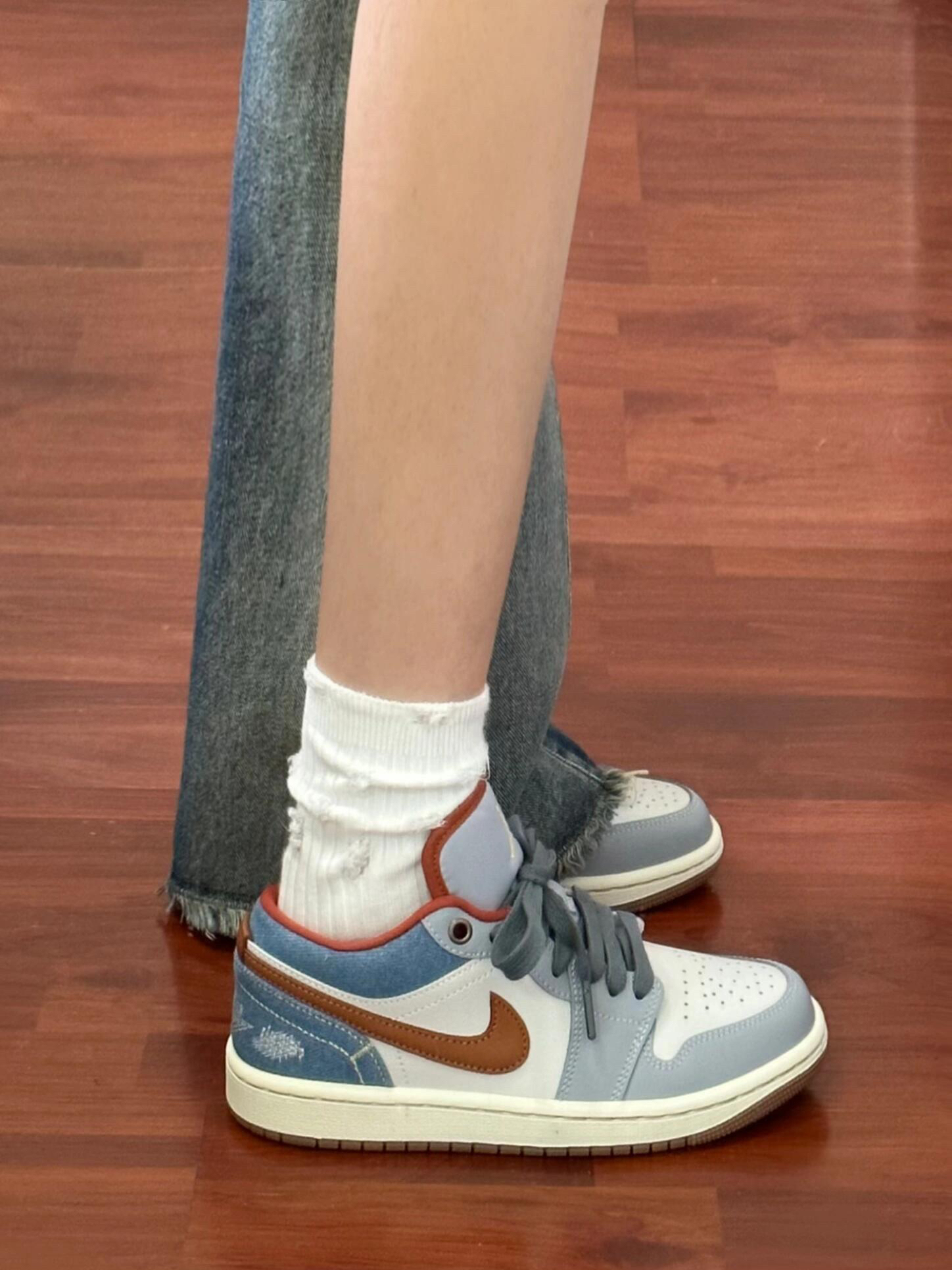 牛仔蓝+灰白配色好适合春夏呀~谁懂! 因为是低帮的鞋型 就会显得腿hin长诶! 悄悄说 鞋底还有做防滑 舒适度也不错! 作为一个AJ女孩 真的无法拒绝 嘿嘿~