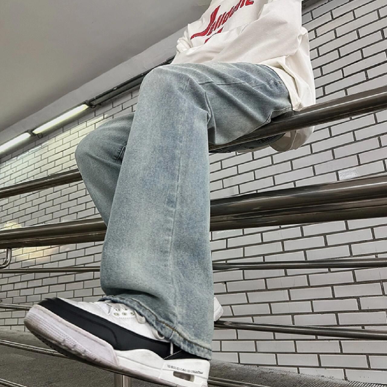 对于男生来讲一条裤子就够搭配衣柜里的衣服有多爽✨ 那就要选择版型百搭的,这条裤子就能很好的修饰腿比例 直筒微喇版型很好穿 水洗做旧效果也是相当到位,版型面料都在线,裤长偏长上身直接就有拉腿的效果,日常通勤拍照都是很好的选择!✨ 不知道怎么搭配纯t都不会出错!!懒人必备!!✨ (图源网络侵删)