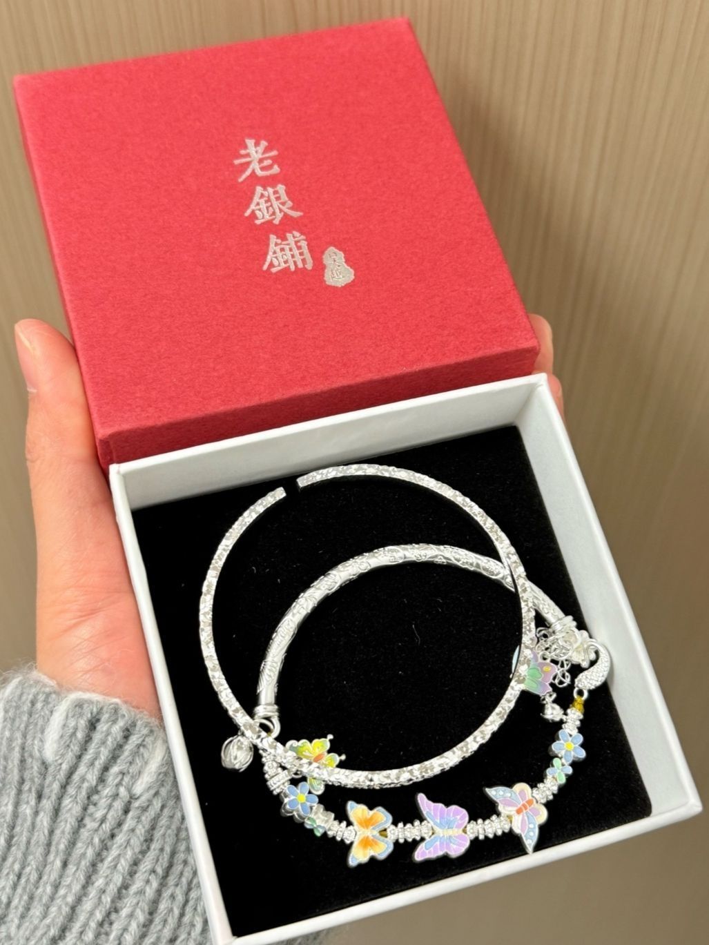 老银铺的蝴蝶半镯半链,设计堪称一绝。一侧是精致银镯,纹理细腻,尽显古朴质感;另一侧链条灵动,随着手腕摆动轻晃。蝴蝶造型栩栩如生,羽翼微张,似要振翅而飞,将古典与时尚完美融合,佩戴在腕间,优雅气质尽显。