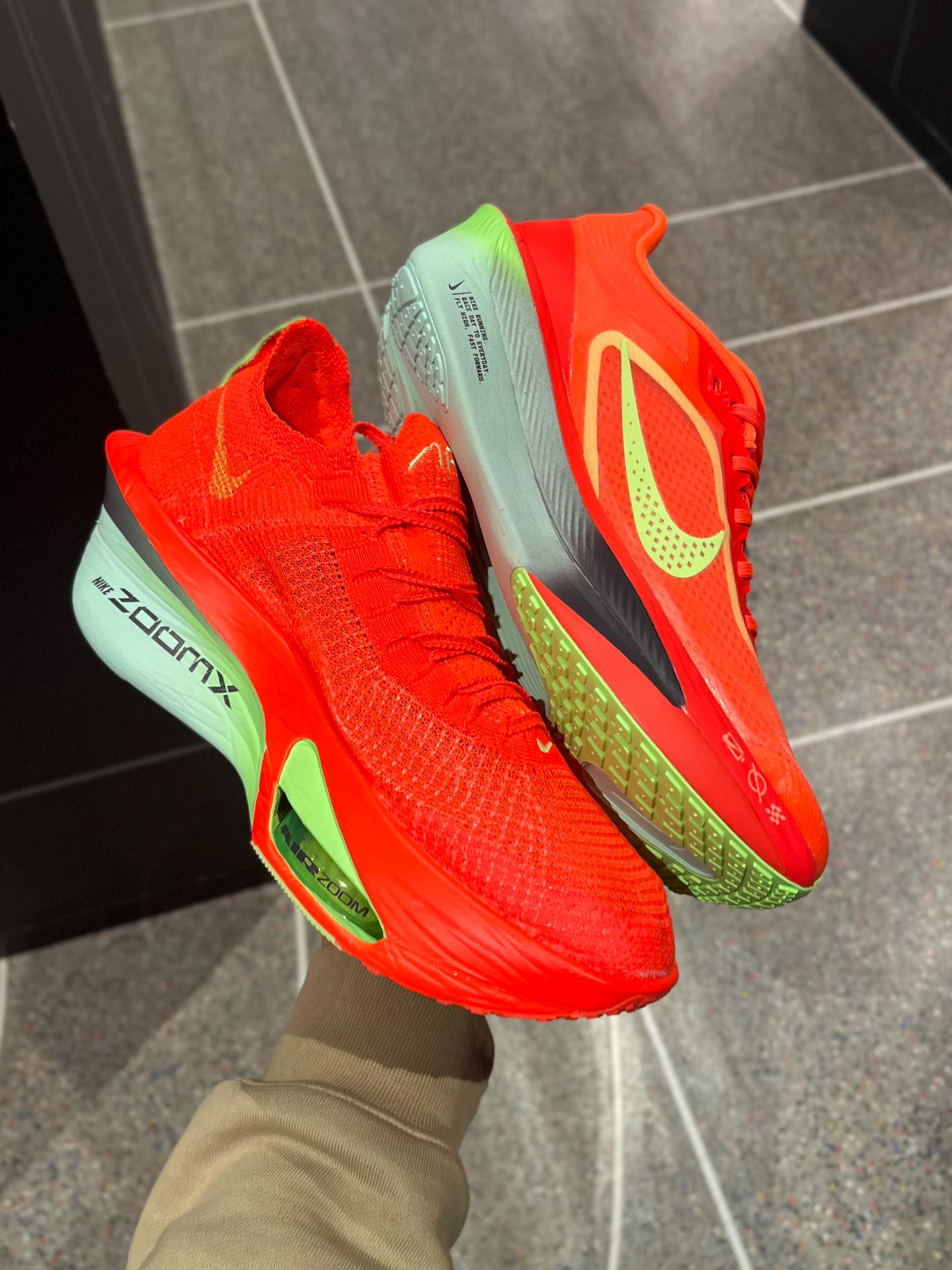 🔥Zoom Fly6和阿尔法3两双跑鞋放在一起,同样的亮橙配色,乍一看鞋型还是挺像的,但前者是发售价999的竞训鞋,而后者则是发售价2299的竞速顶碳跑鞋‼️ 🆚Zoom Fly6中底上层是ZoomX➕下层SR-02,软弹支撑的上下结构;而阿尔法3则是前掌两块Zoom气垫回弹缓震,再加上全掌ZoomX泡棉,配置相当豪华!!! 🤩重量上和外观颜值方面,阿尔法3略胜一筹,而且虽然都带有碳板,Alpha...