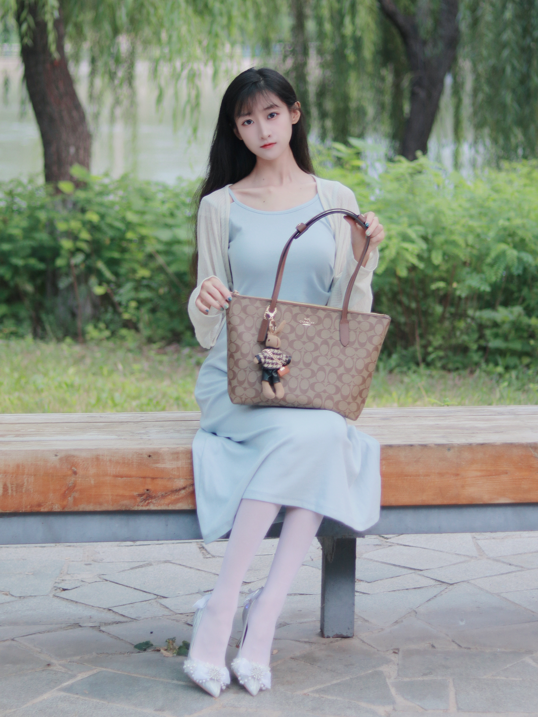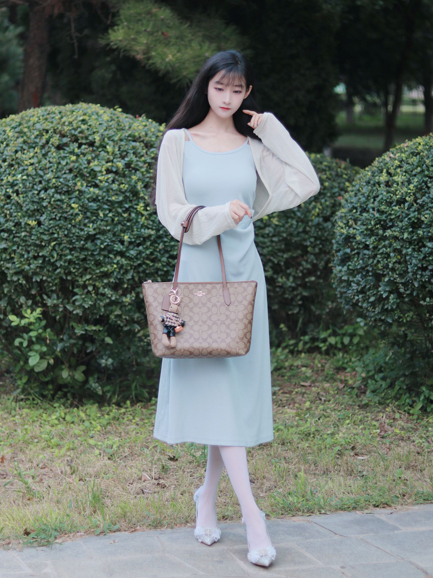 浅蓝色连衣裙👗修身优雅 搭配米色开衫和托特包 拿捏纯欲感~