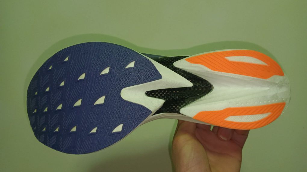 动态碳板加加强筋,推进力很强!上层尼龙粗胚,下层尼龙弹性体颗粒。透气真的没话说!今年的PB战鞋了好吧!