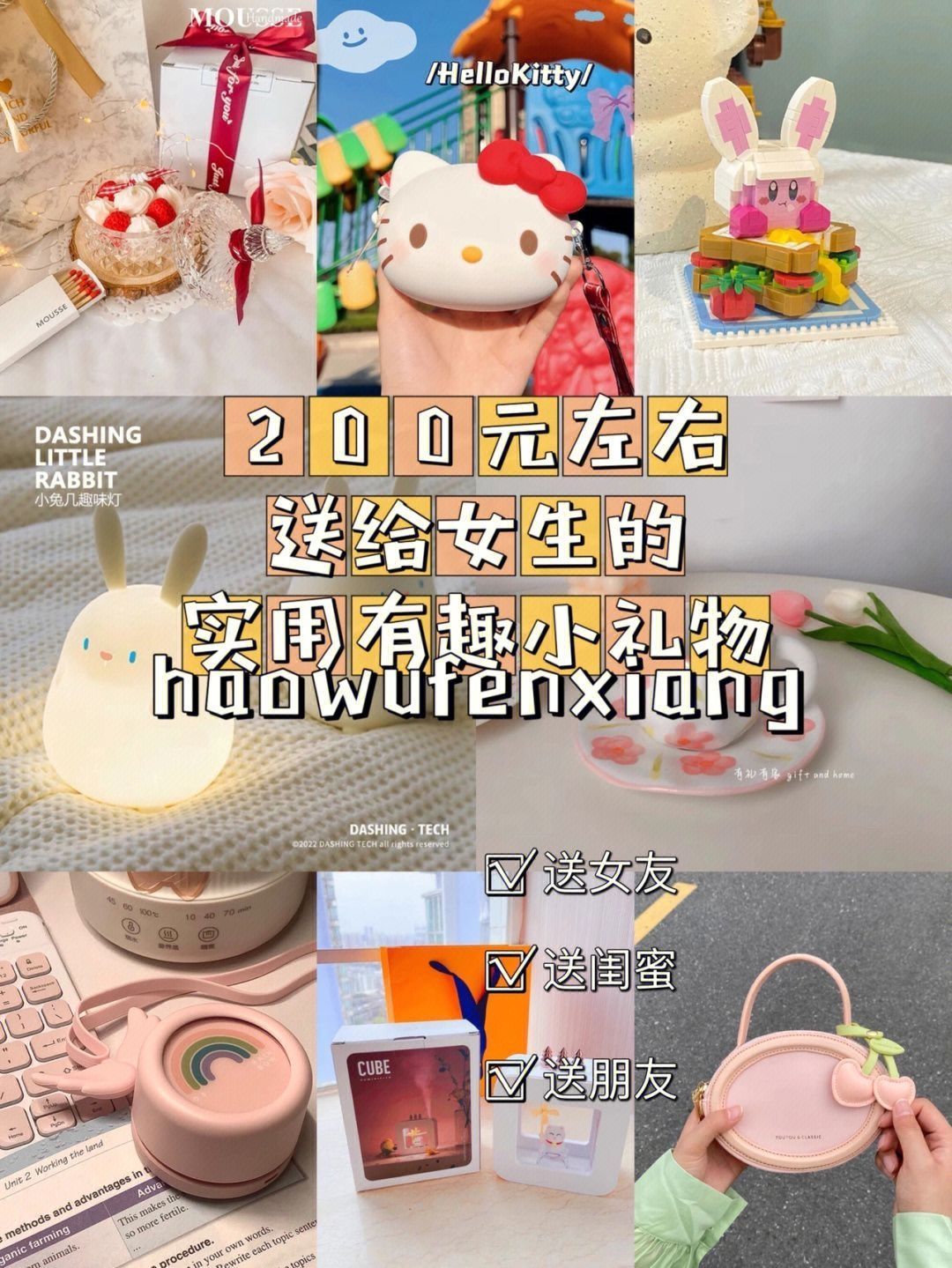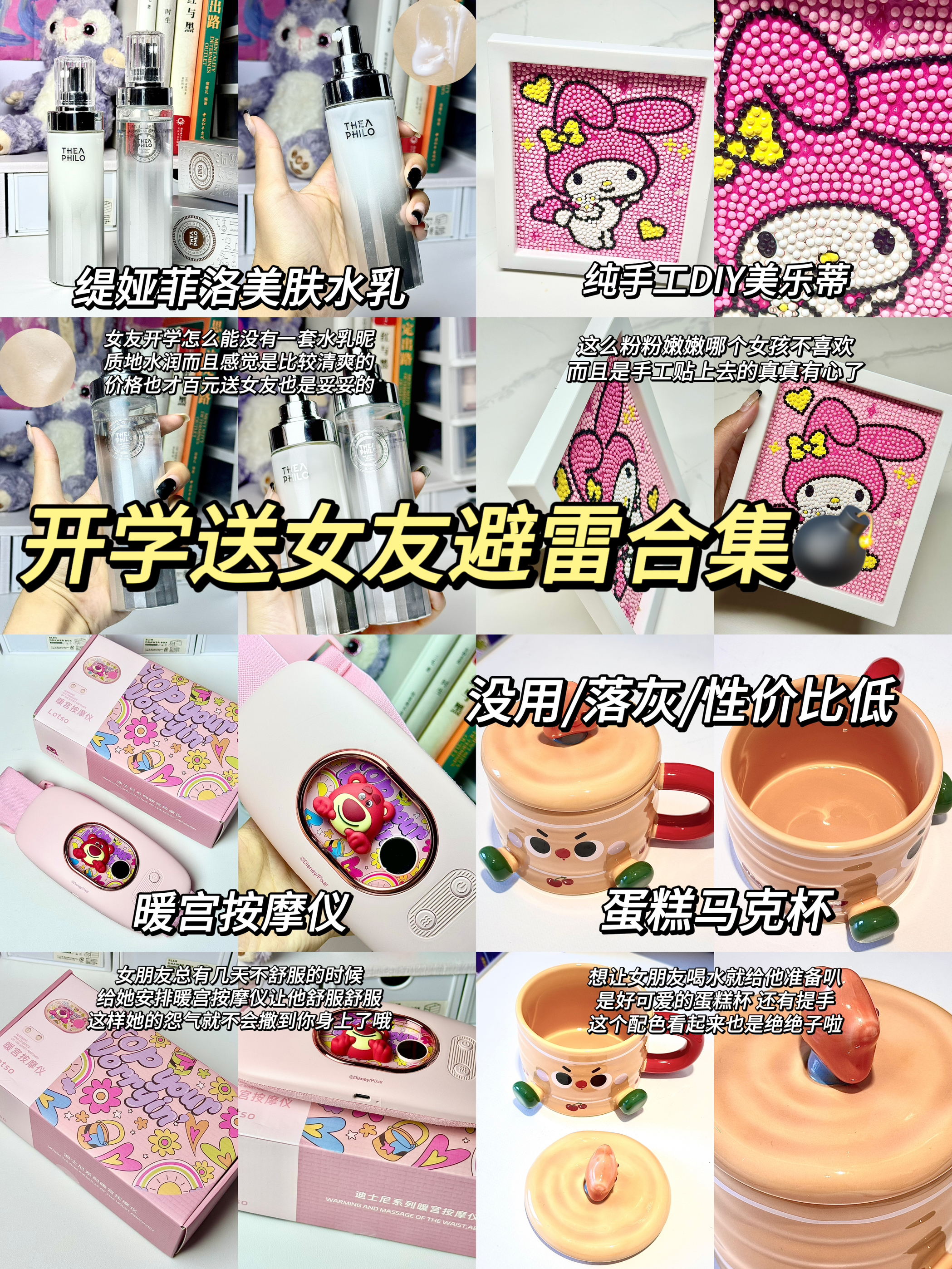 男生们都别发愁送女友什么礼物啦 跟着这个满分作业走绝对不出错哦💝 1.蒂花之秀紧致抗皱护肤套装 洗面奶➕精华水➕眼霜➕精华➕面霜 一套搞定护肤流程✌🏻 轻松让女友改善黑眼圈、淡化皱纹 2.太空人小夜灯 照明还能当个可爱摆件 3.hello kitty 口红 质地水润,上嘴水嘟嘟的 4.公主马克杯 5.音响 6.香水护手霜 7.暖宫腰带 8.蛋糕 9.保温杯