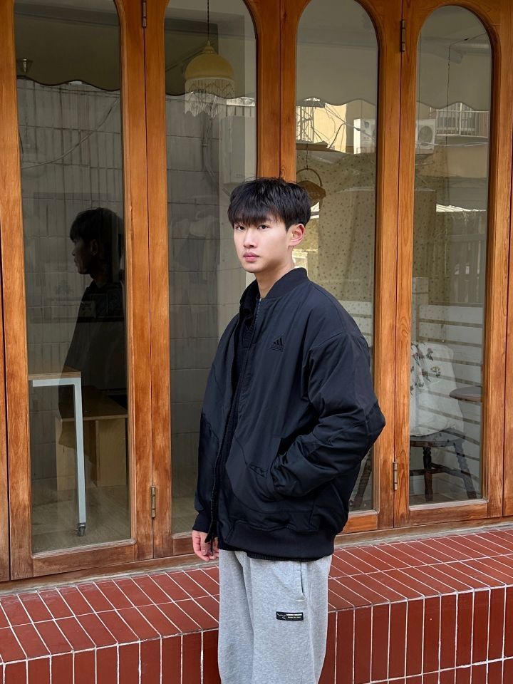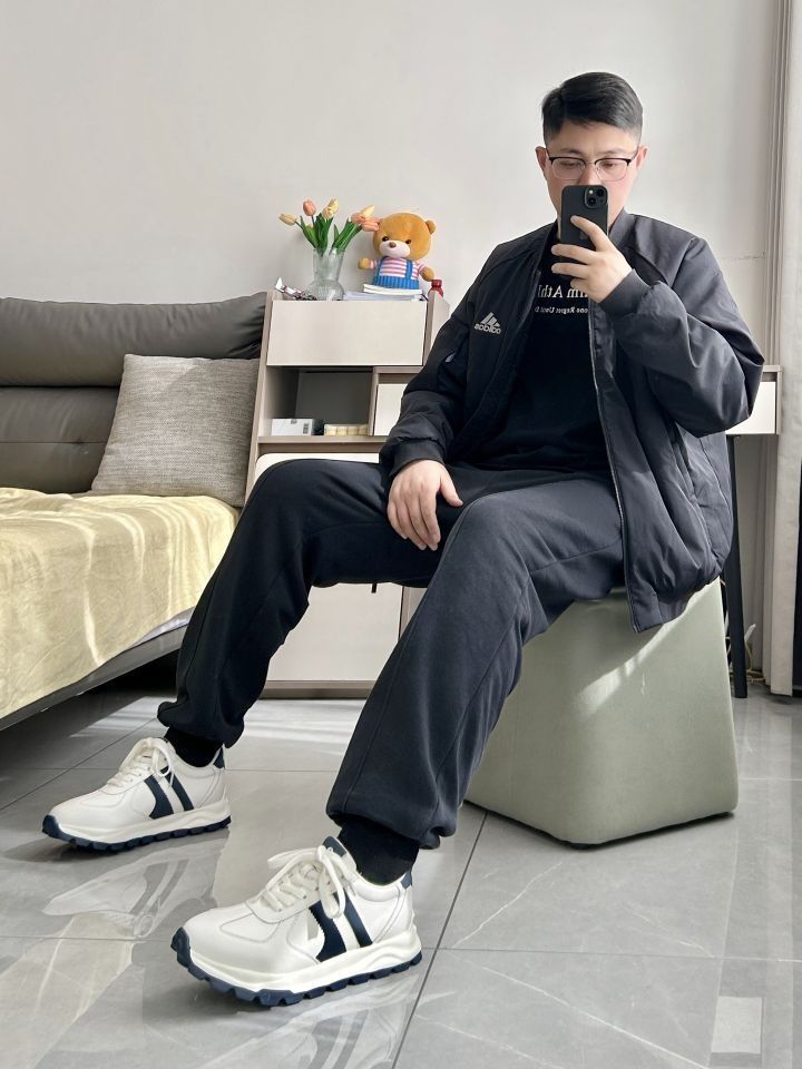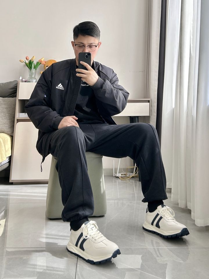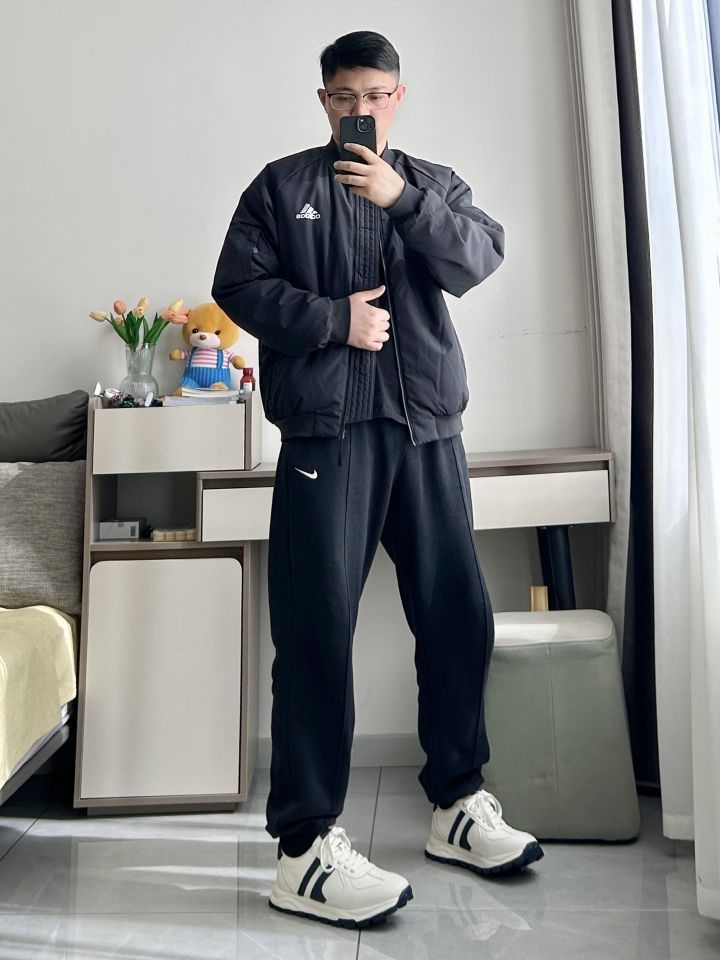 男生显高又舒适的一身 一件阿迪达斯飞行夹克外套 宽松版型很舒适 搭一条耐克束脚休闲运动裤 面料柔软 鞋子是 NAVIGARE 小帆船厚底低帮运动休闲鞋 白蓝色皮革鞋面,柔软细腻,质感很好 内里柔软,脚感舒适 厚底显高,简约休闲运动