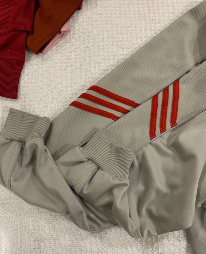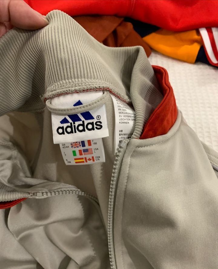 Adidas90年代产 颜色很特别 丝光棉➕涤棉材质 灯光下有点亮亮的 颜色很有质感 复古版型