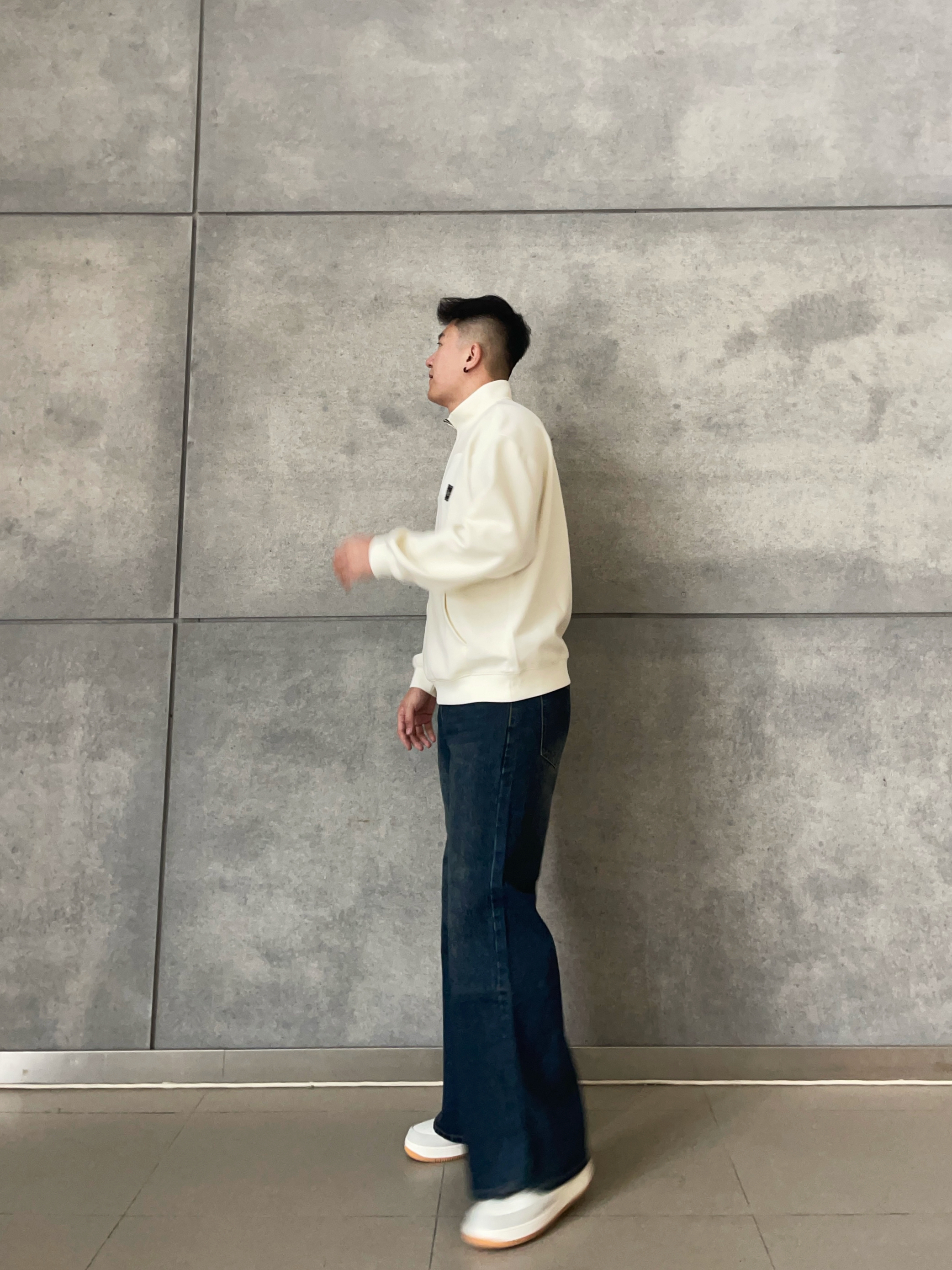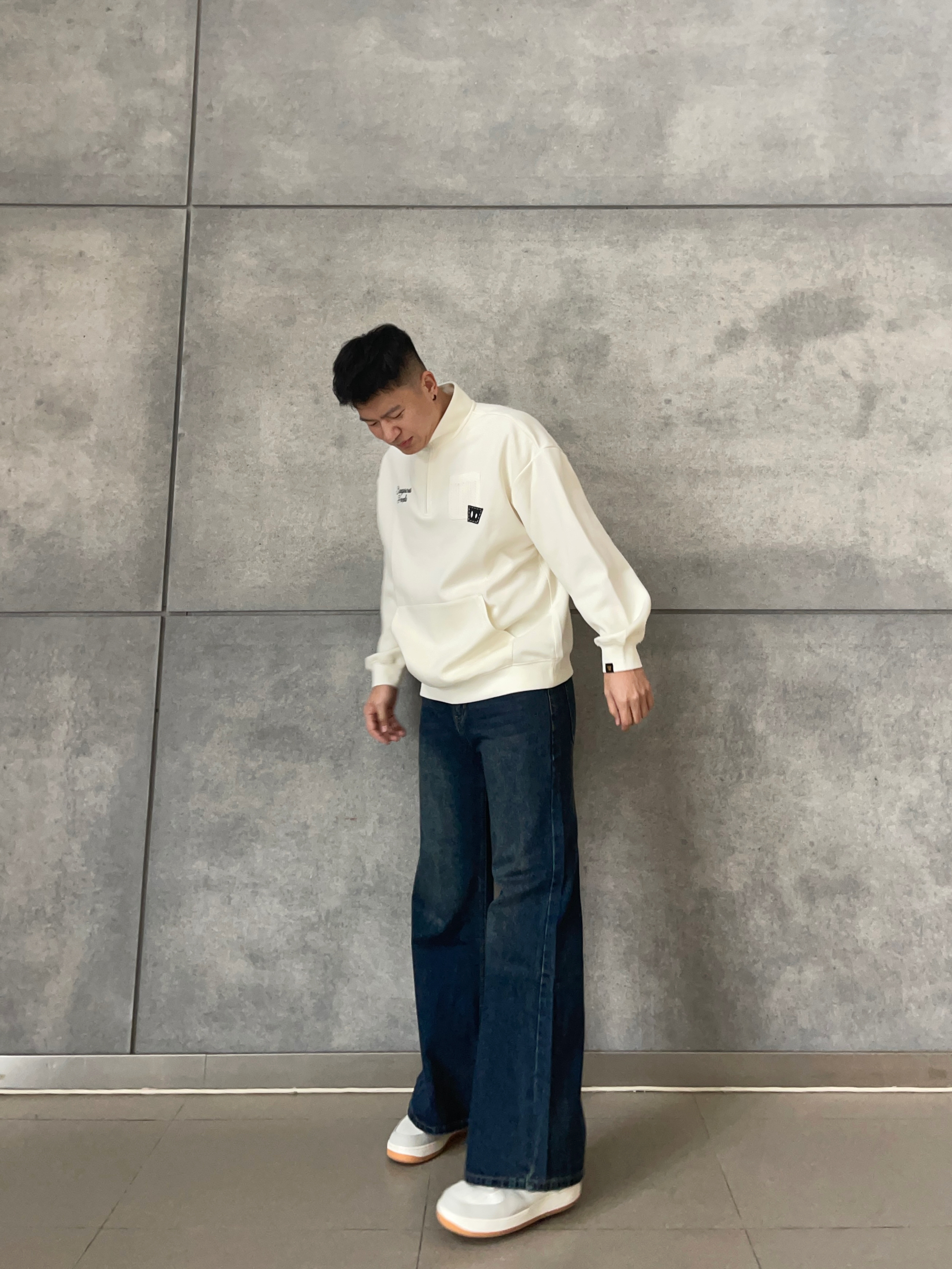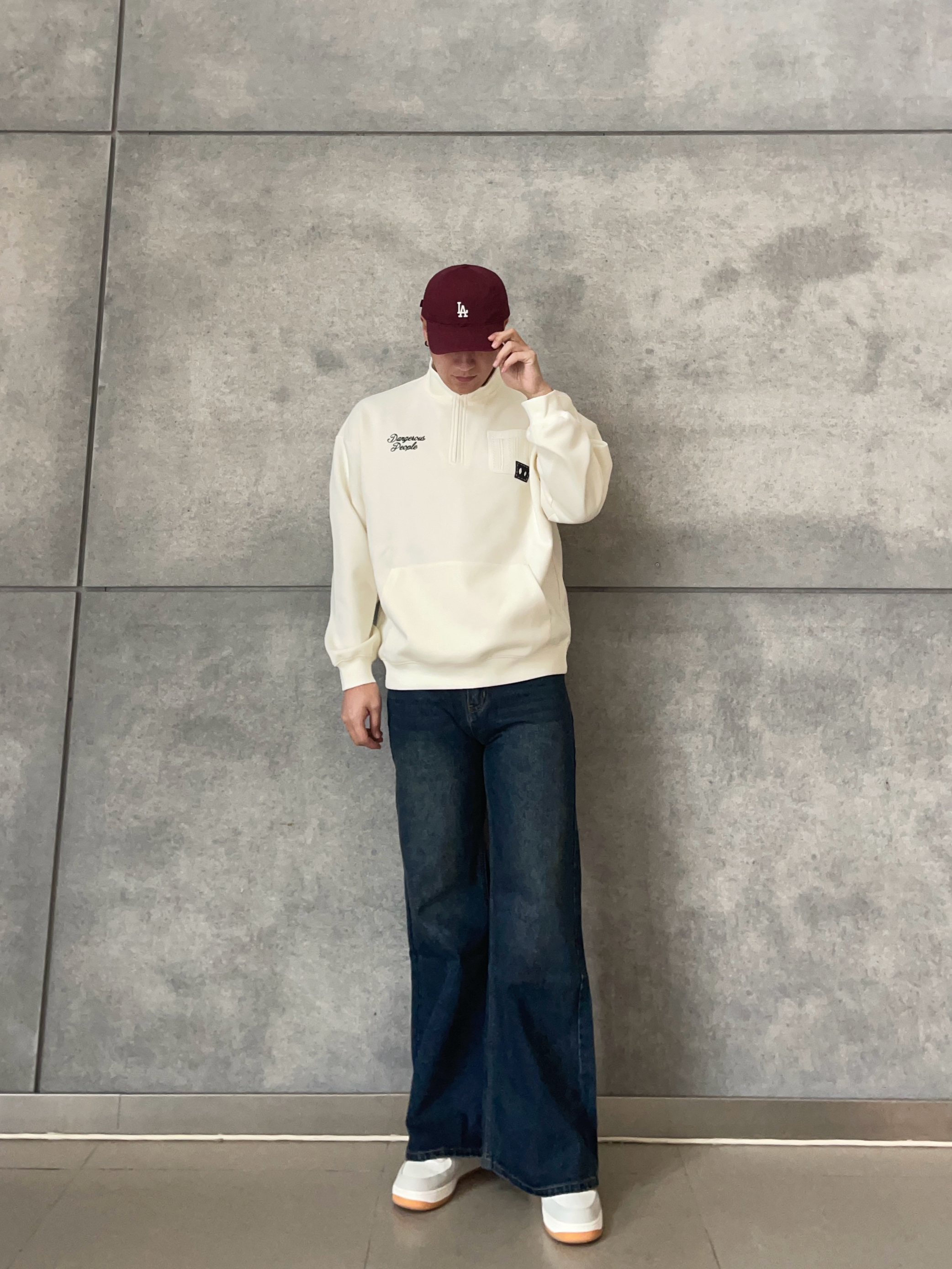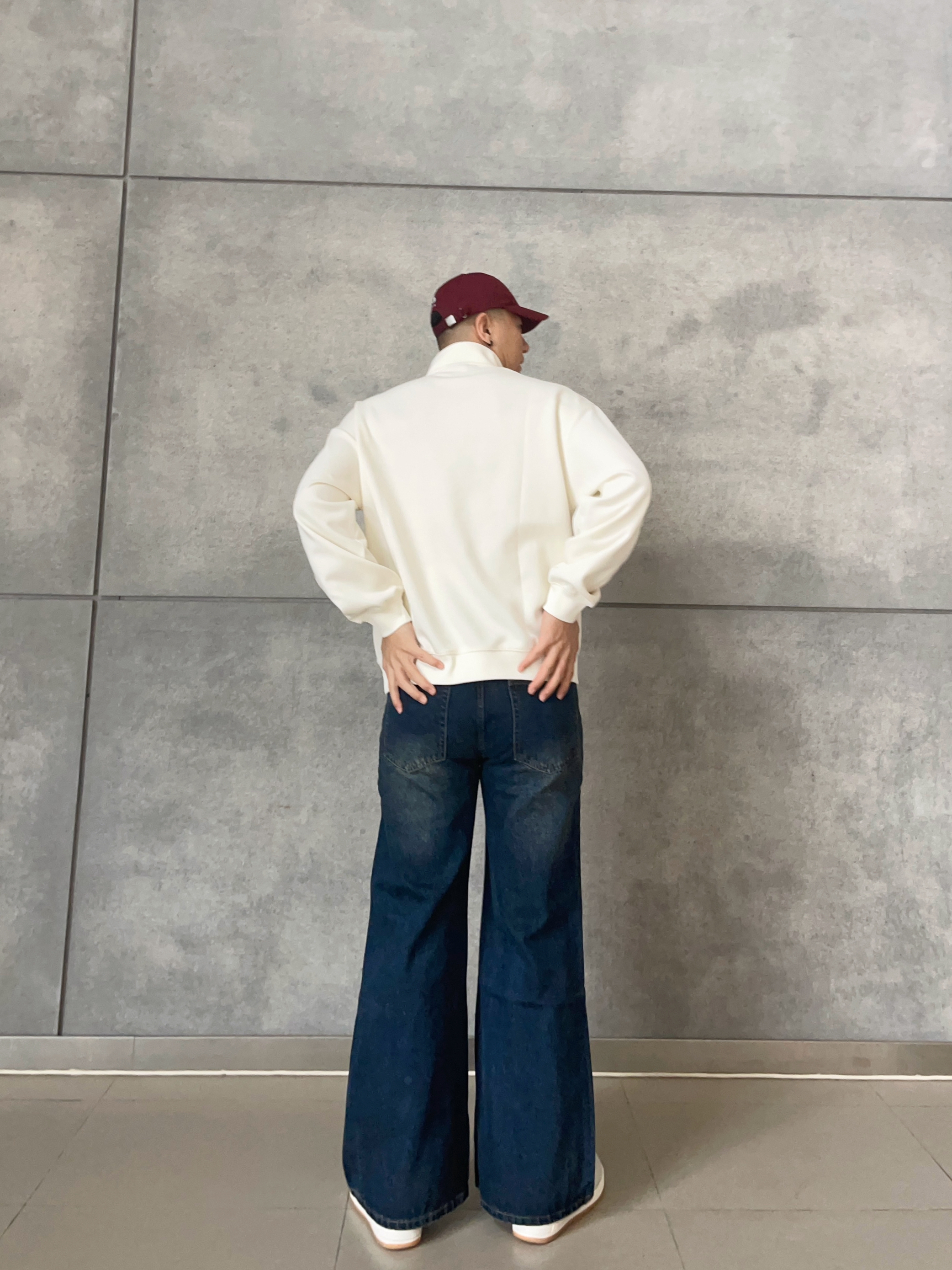 👕 米白立领卫衣 极简立领设计+低饱和奶油色🍂, 干净清爽不挑肤色~ 👖 复古蓝弯刀牛仔裤|腿型救星登场💫 弯刀剪裁+直筒阔腿版型,视觉拉长比例✨ 水洗工艺,轻复古拿捏到位~ 拖地长度自带慵懒感,秒变长腿欧尼🇰🇷 🧢 酒红鸭舌帽 点睛之笔!冷调穿搭瞬间升温🍷 穿搭公式:慵懒韩系+街头酷感,日常出街直接照抄📸 👦🏻:188 | 85 👖:XL
