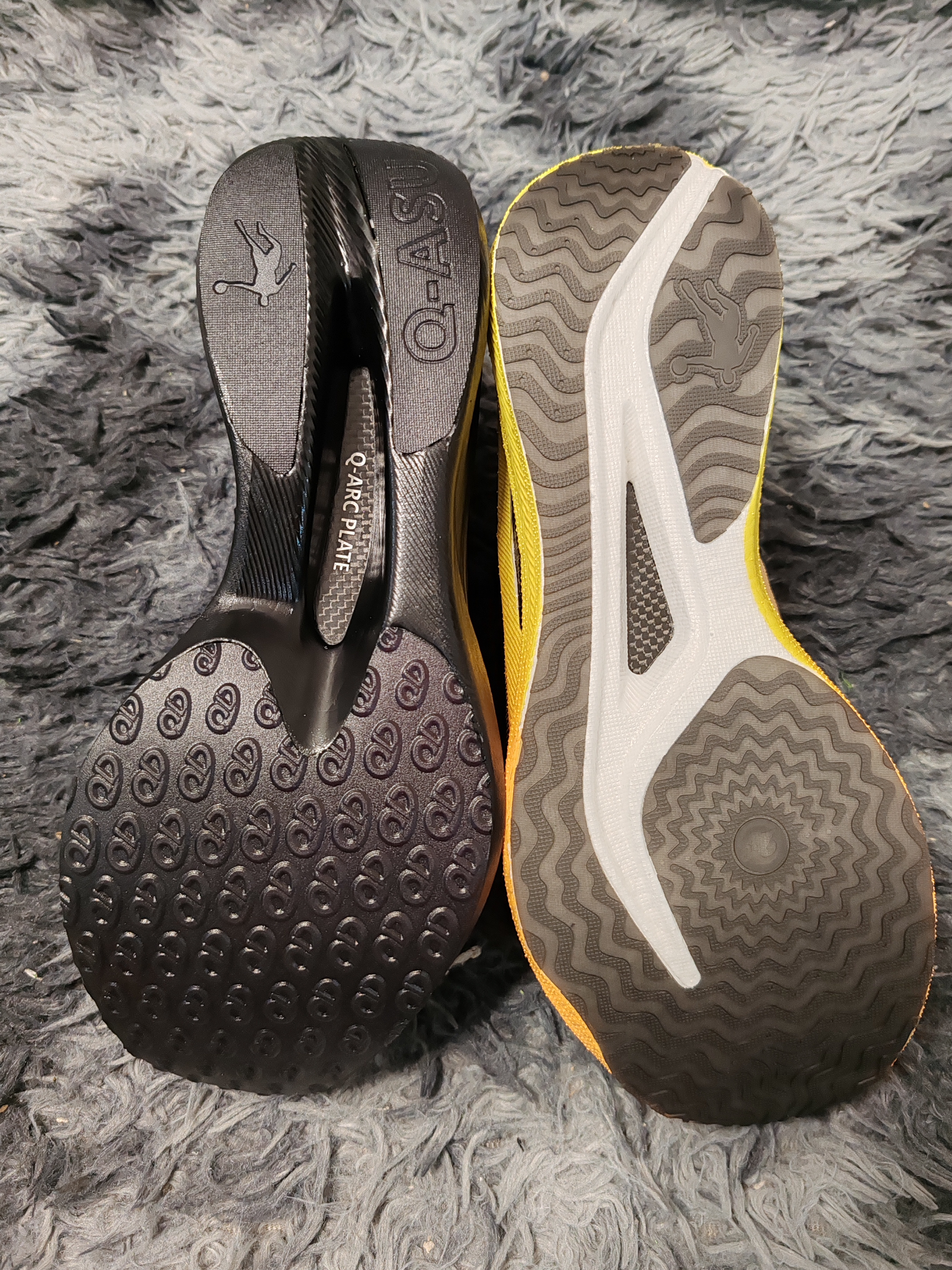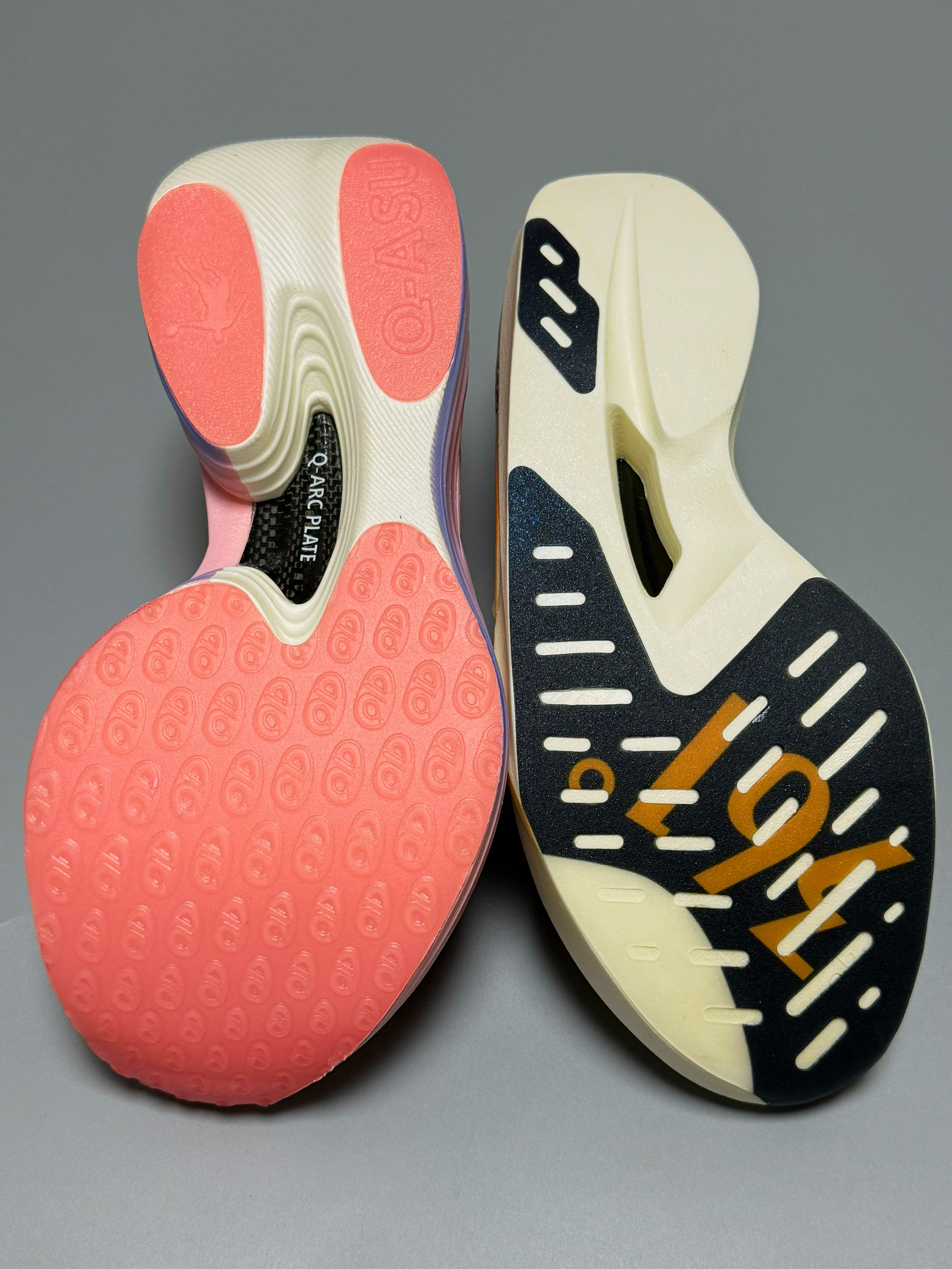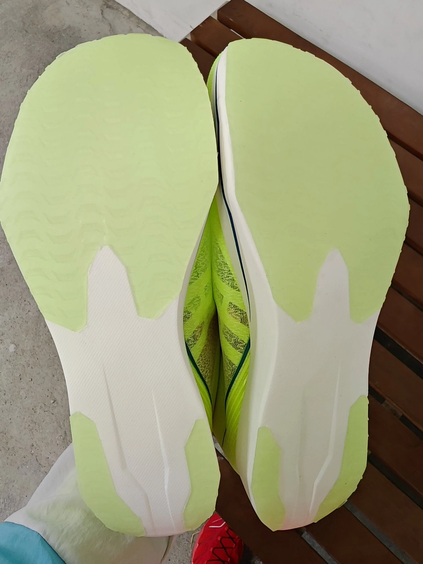2️⃣中底脚感舒适,触地反馈清晰,前掌宽,足弓收窄处内侧支撑给足了,力线正落地稳,较宽的后跟稳定性出色,碳板宽大刚性不低,静态脚感偏硬,跑起来韧弹,跑几公里踩开会软一些,对足外翻跑者容错性佳。比强风3系落地稳定,支撑强,个人感觉更像强风2pro的升级。