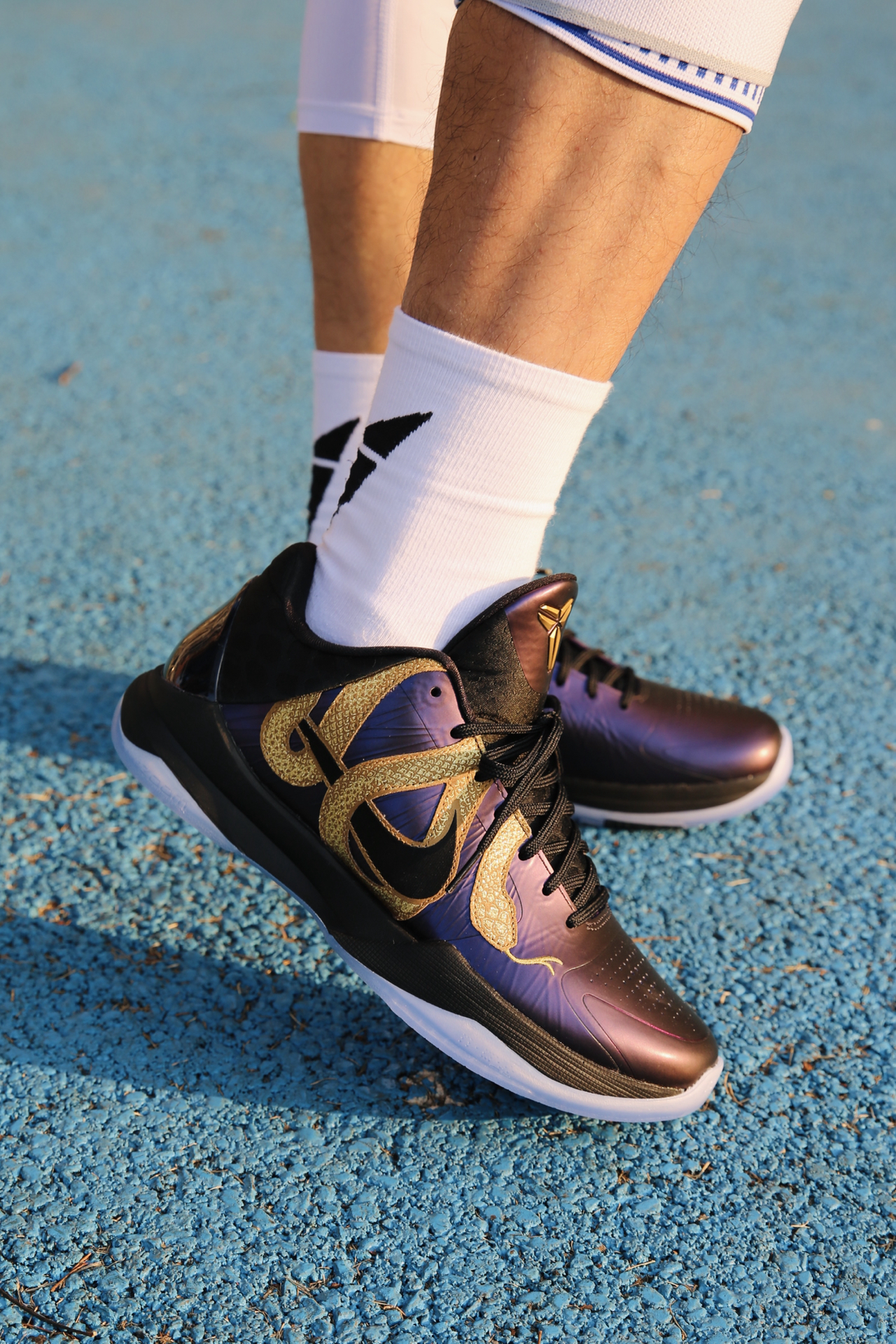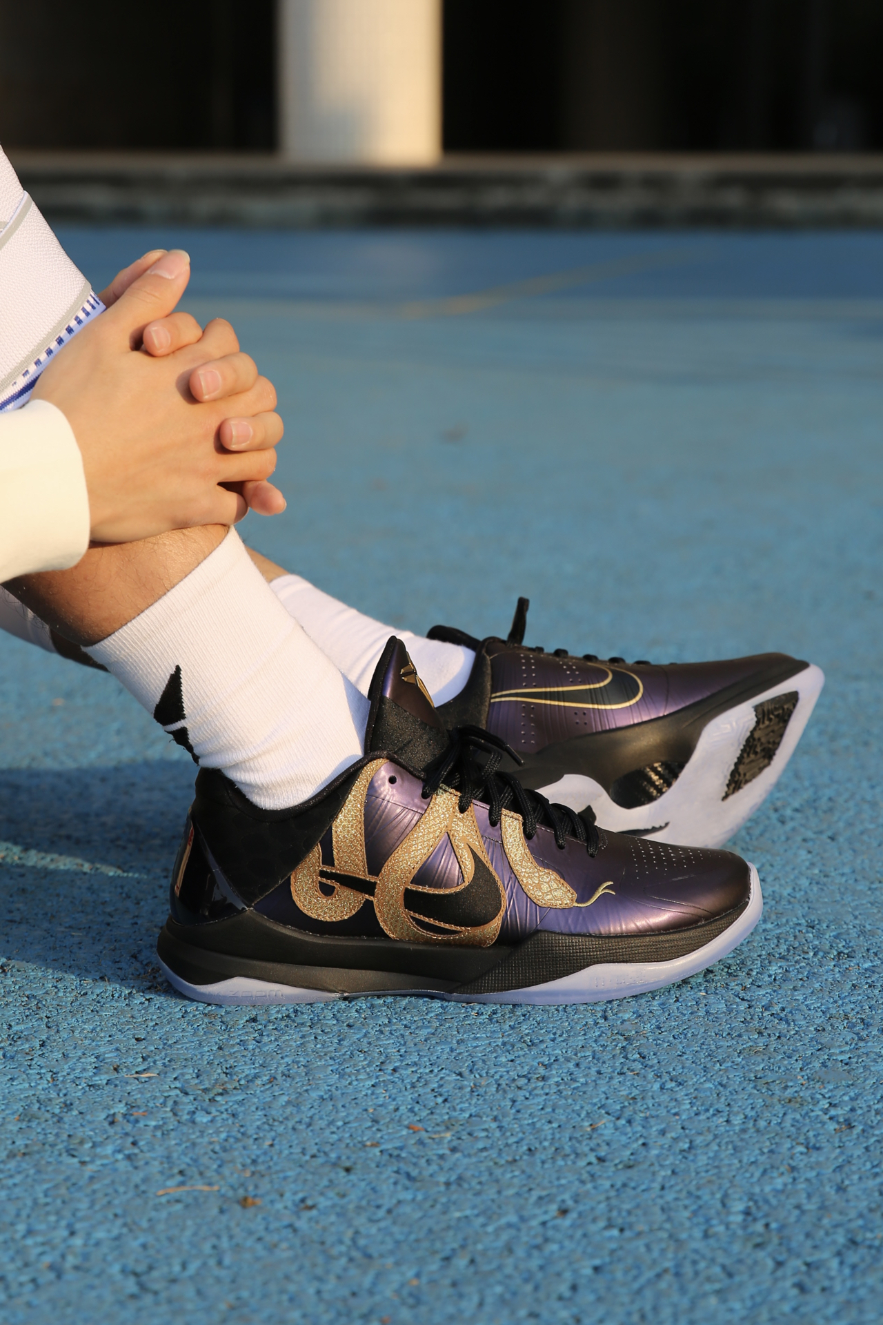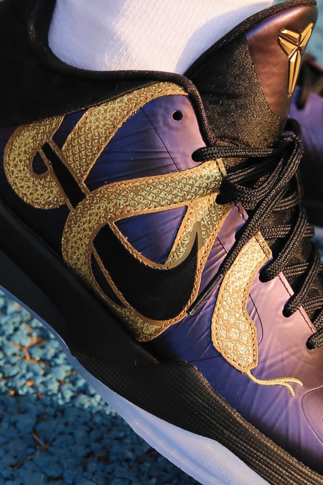 ❤️较于大红金蛇kobe5, 这双大紫金蛇更耐看! 💜整体的紫色颜色比较深, 有类似于紫喷的光泽感 🐍盘绕其中的金蛇夸张又大胆, 身上蛇鳞闪闪发光,光泽刺绣很精细 随便白t黑裤搭配都很好看! 靴 建议
