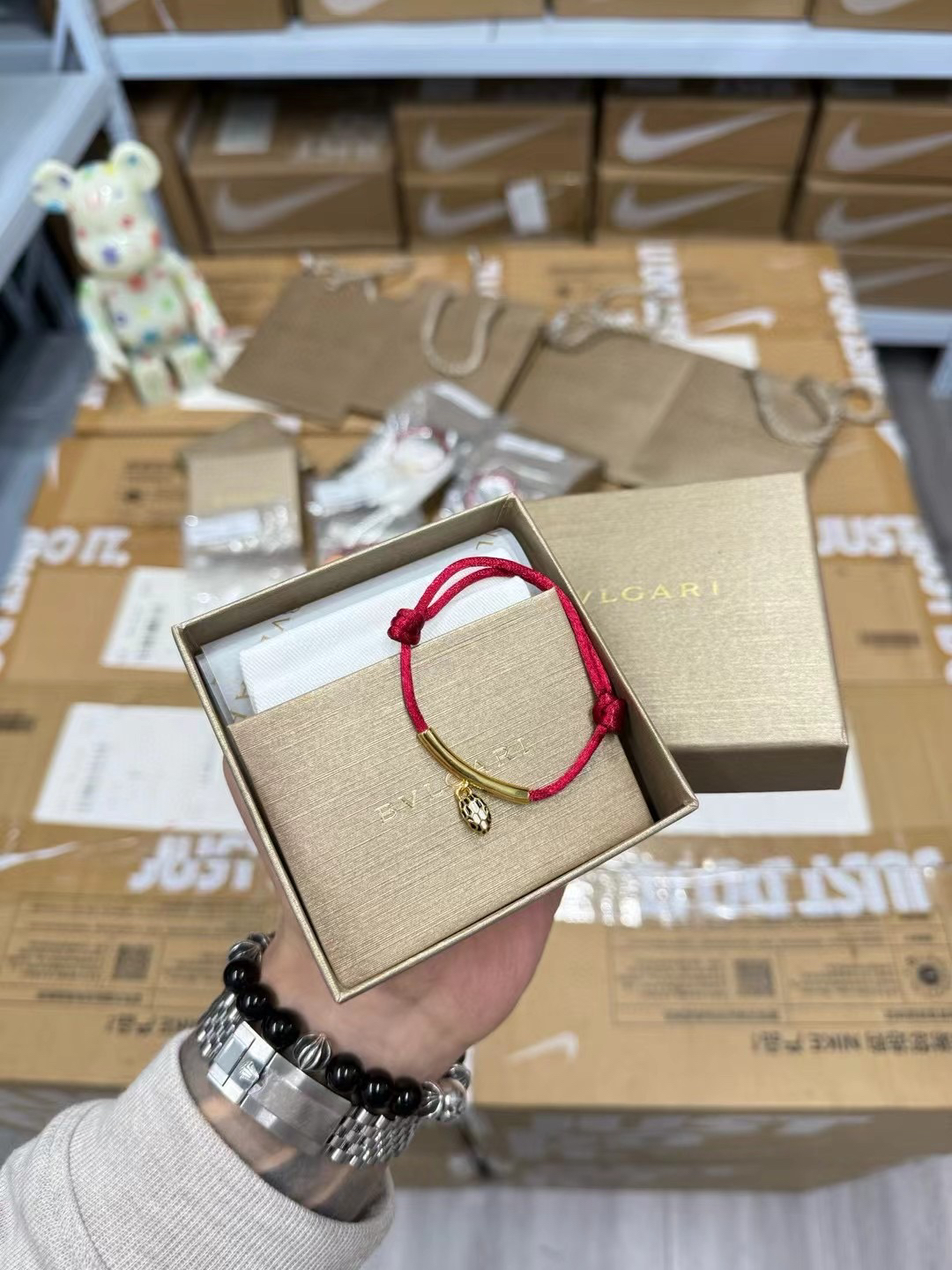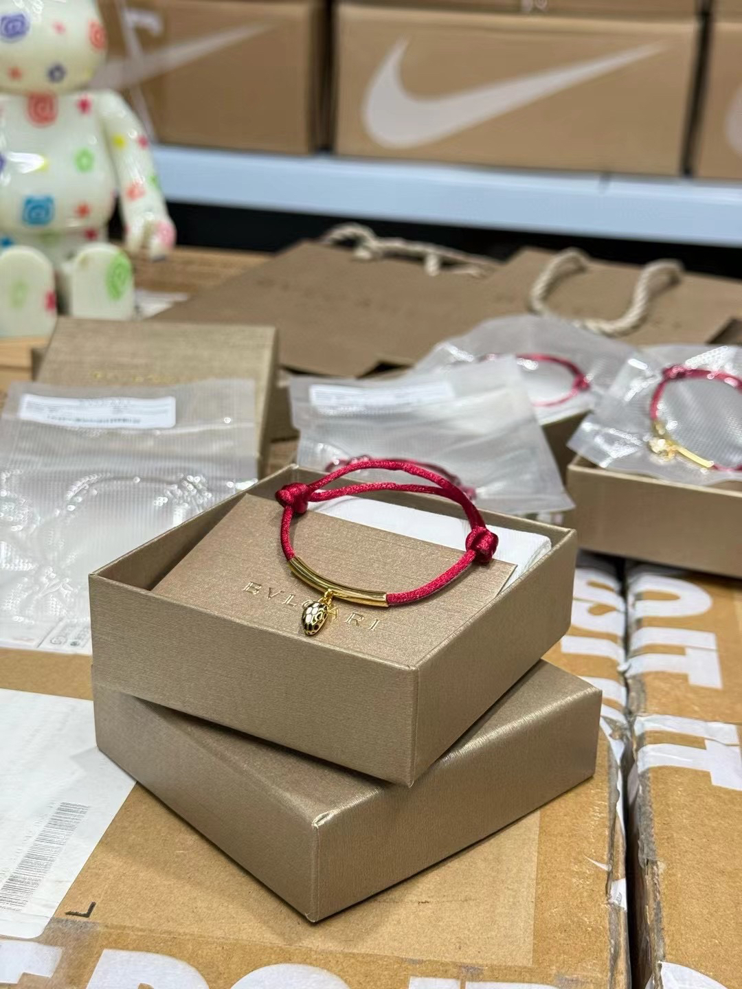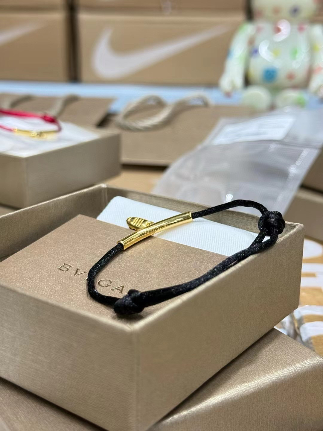 图中的手链是宝格丽品牌的。这些手链以绳结搭配金色部件,有黑色绳和红色绳等不同款式。黑色绳手链简约时尚,红色绳手链富有传统韵味,都带有精致的坠饰,展现出优雅与精致的风格,适合作为礼物或日常佩戴。