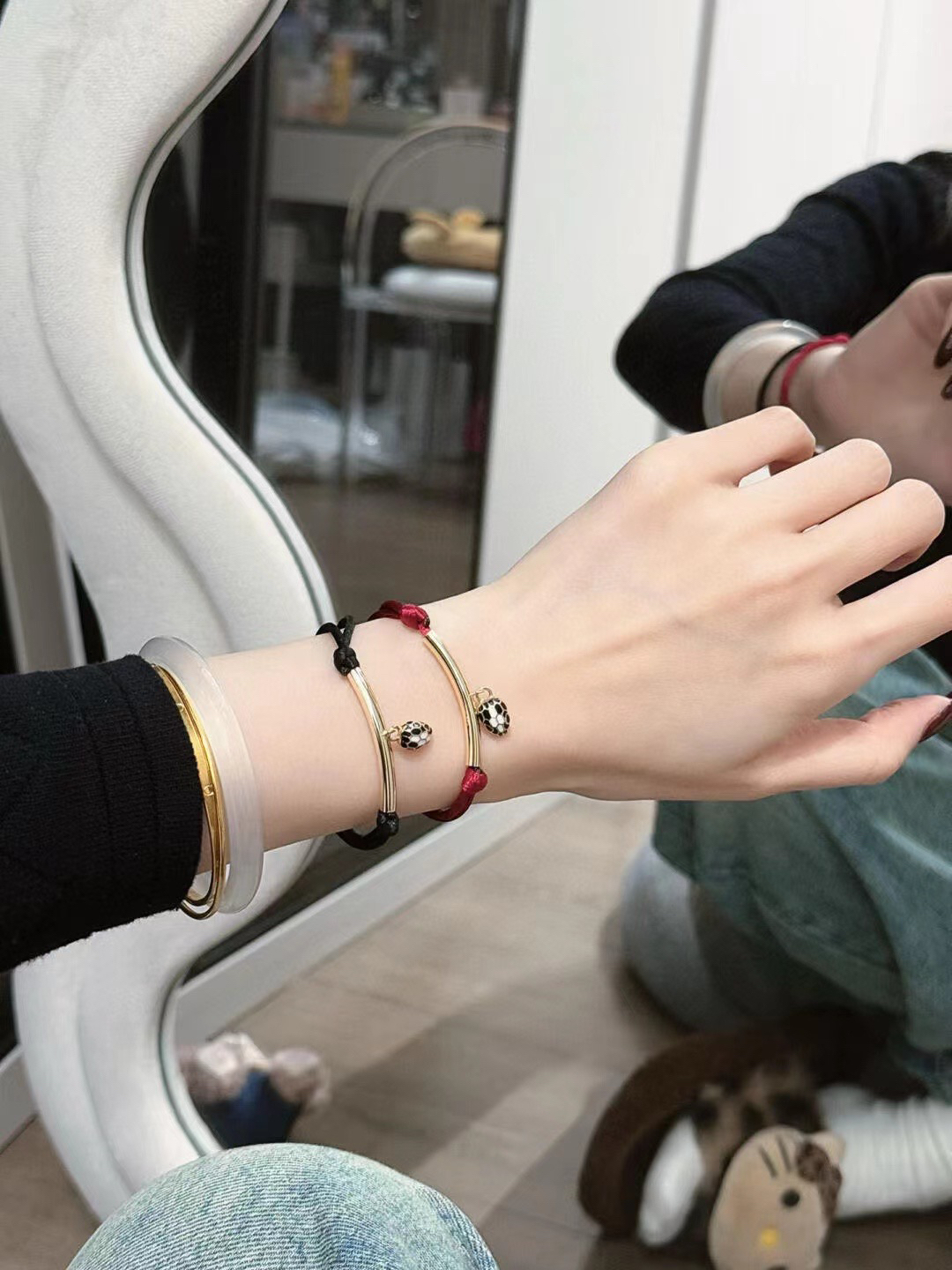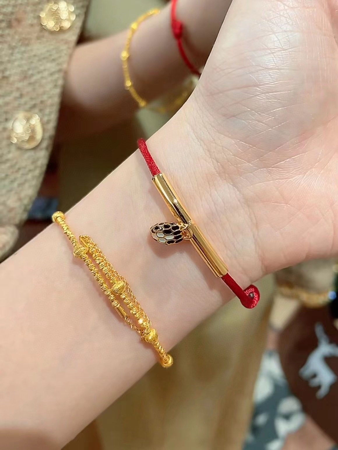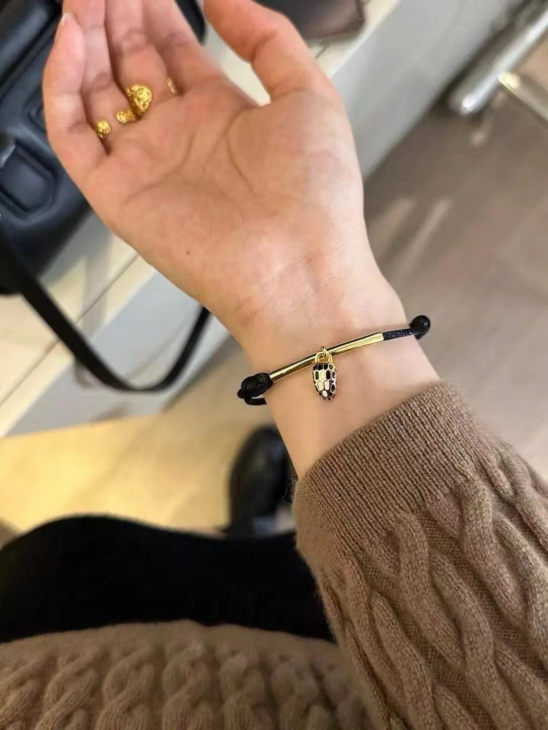 图中的手链是宝格丽品牌的。这些手链以绳结搭配金色部件,有黑色绳和红色绳等不同款式。黑色绳手链简约时尚,红色绳手链富有传统韵味,都带有精致的坠饰,展现出优雅与精致的风格,适合作为礼物或日常佩戴。
